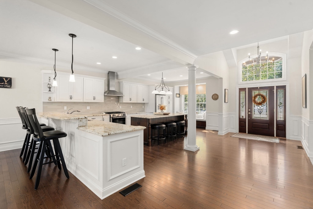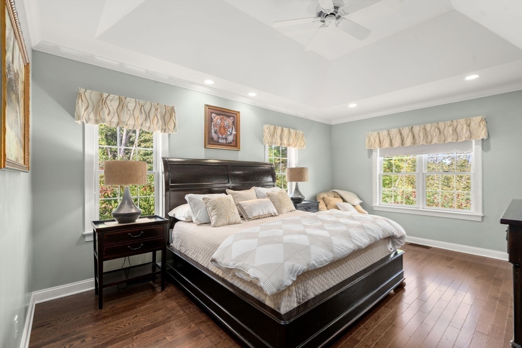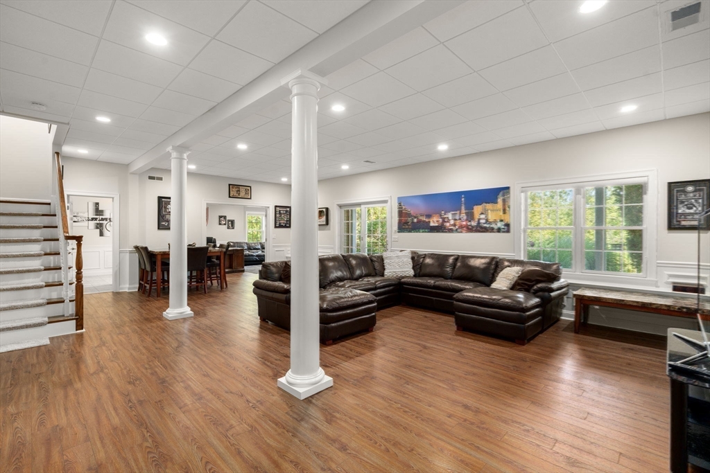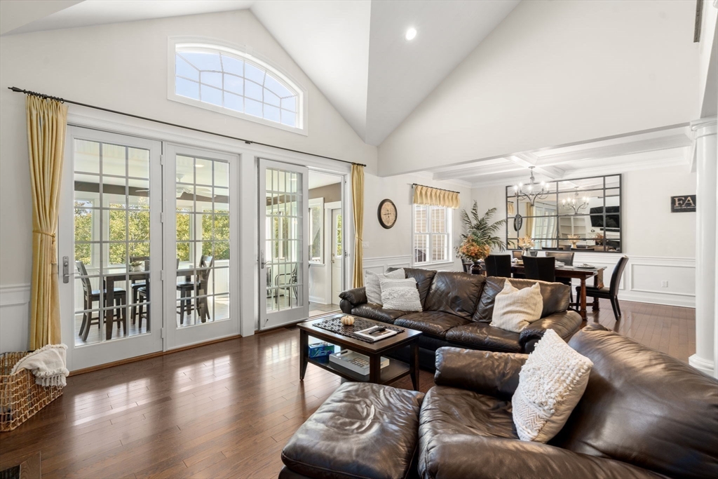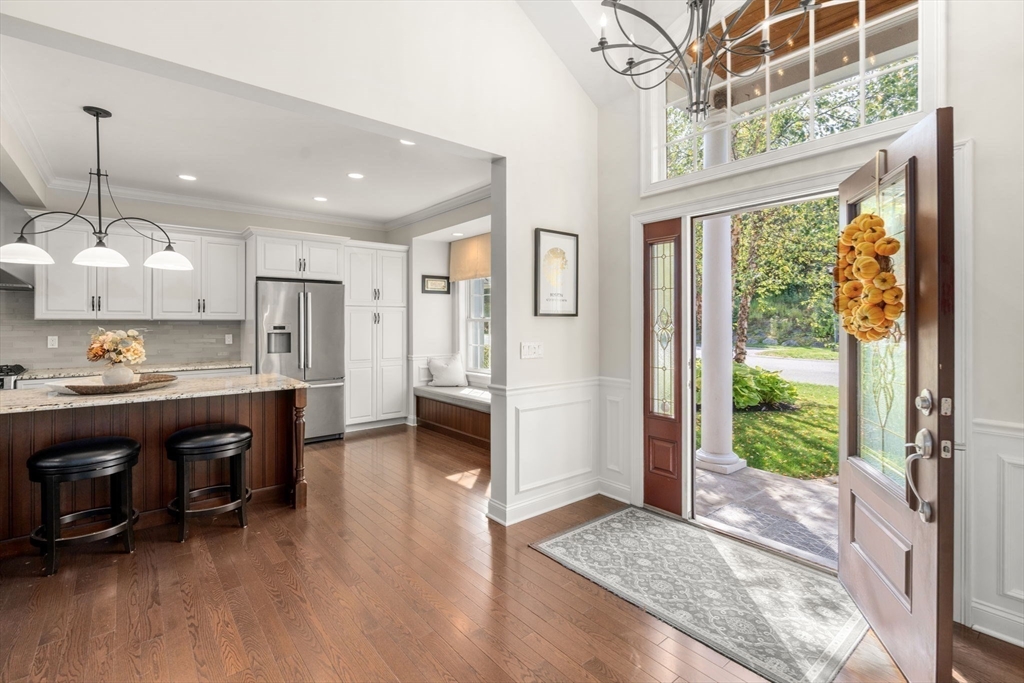 Elegant End Unit in Village Estates awaits you. This beautifully designed end unit is perfect for entertaining, featuring an open-concept first floor with hardwood floors throughout. The kitchen boasts custom cabinets, granite countertops, stainless steel appliances, and an oversized island. The living room offers soaring ceilings, built-ins, and a fireplace, with French doors leading to a sunroom with a gas stove and scenic views. The first-floor primary suite includes a spacious walk-in closet and en-suite bath. Upstairs, you'll find two large bedrooms, a full bath, and a versatile catwalk ideal for an office or reading nook. The expansive walkout basement adds even more living space with an office, gym, full bath, cedar closet, and a 29x22 entertainment area.