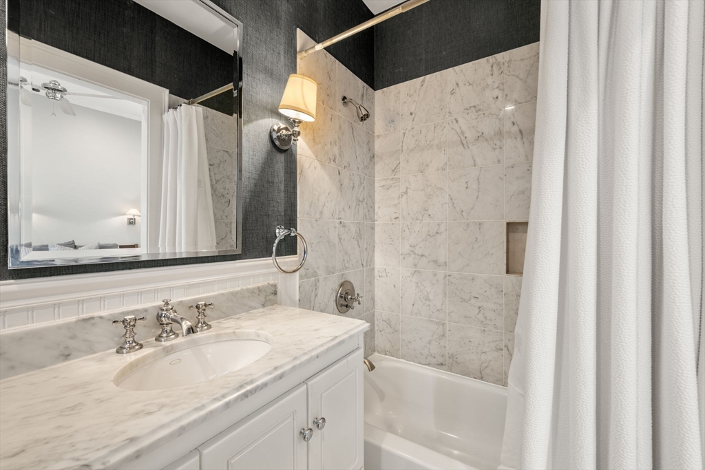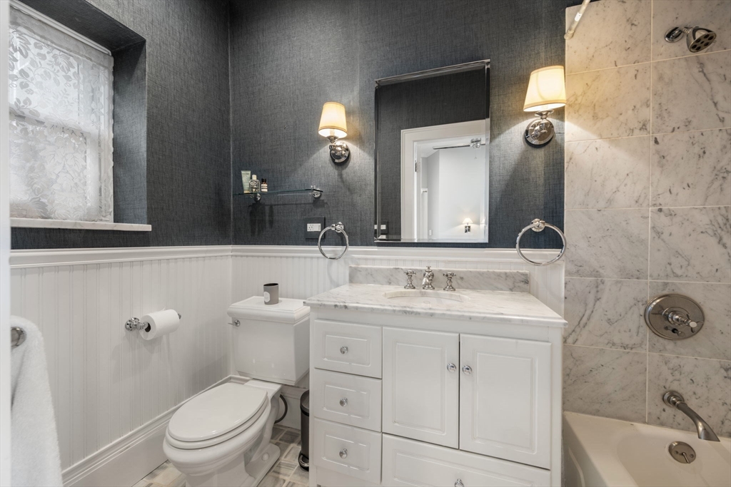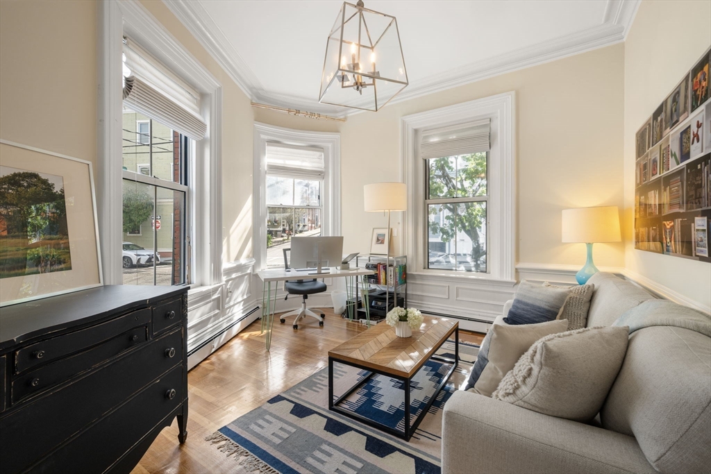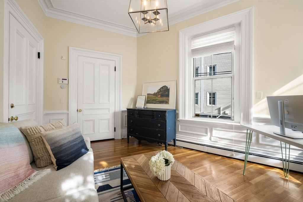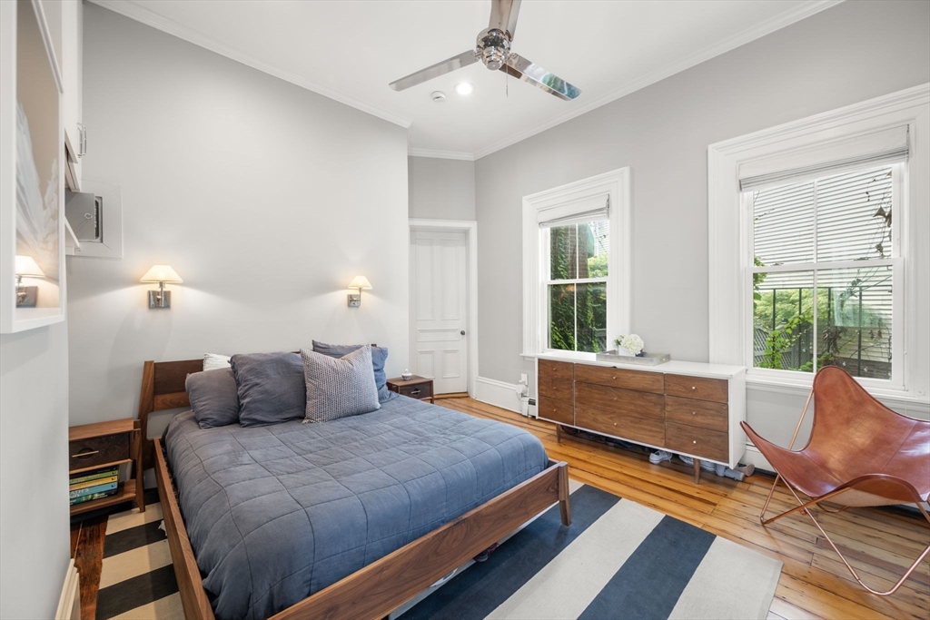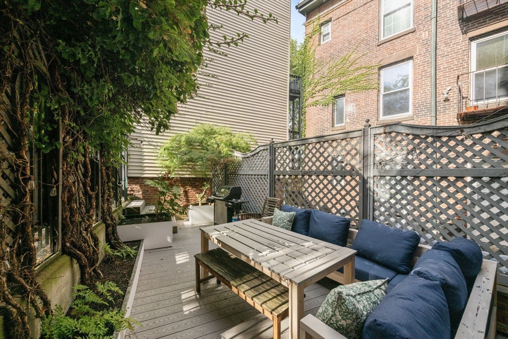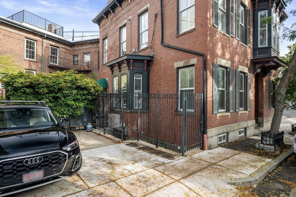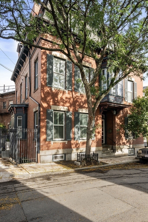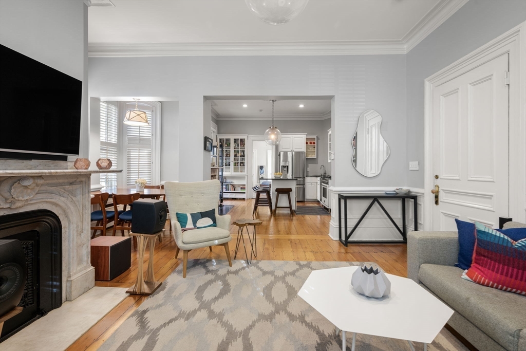 This elegant 2-bed /2-bath residence with a parking spot located in a historic brownstone feels like a Back Bay home & is central to Charlestown’s best restaurants, shops & public transportation. With soaring 10.5 foot ceilings, crown molding & 13 windows w/ corner exposure allowing for abundant natural light, this inviting home is truly one of a kind. The sought after open layout is ideal for today’s living. The sunny kitchen features a freestanding island, w/white cabinetry, ss. appliances including Bertazzoni gas range, & a stunning wood burning fireplace. The well-placed dining sits directly off of the kitchen. Two glass doors lead to the inviting outdoor patio. The sun-drenched living room has a marble fireplace & a separate dining area. Custom built in-unit washer/dryer laundry nook. Both bedrooms are spacious & sun filled. Direct access to 1 full deeded parking space. Modern amenities & historic details throughout. Pet Friendly. Walk to Whole Foods, Monument Park & the "T",