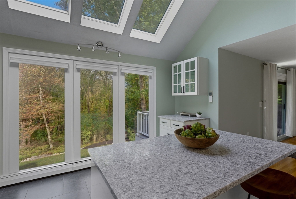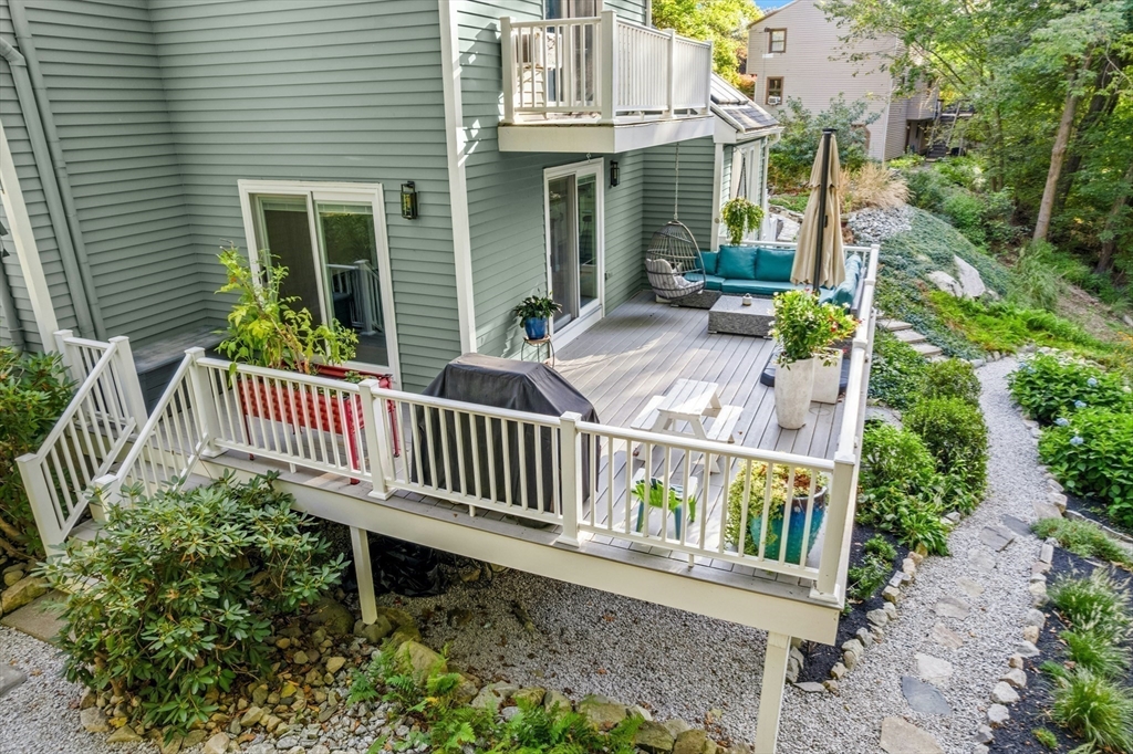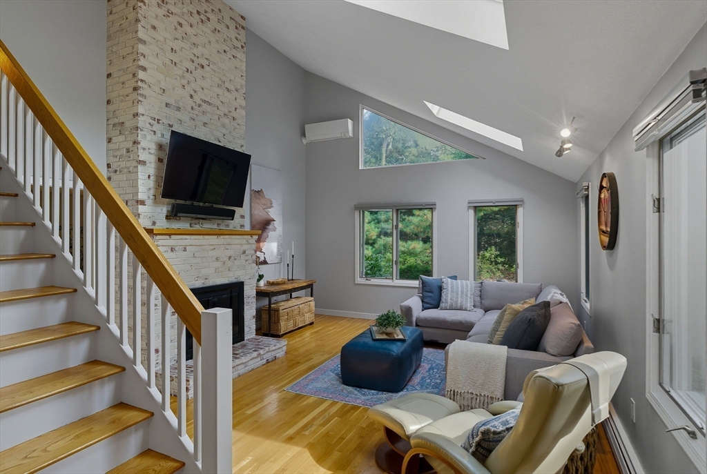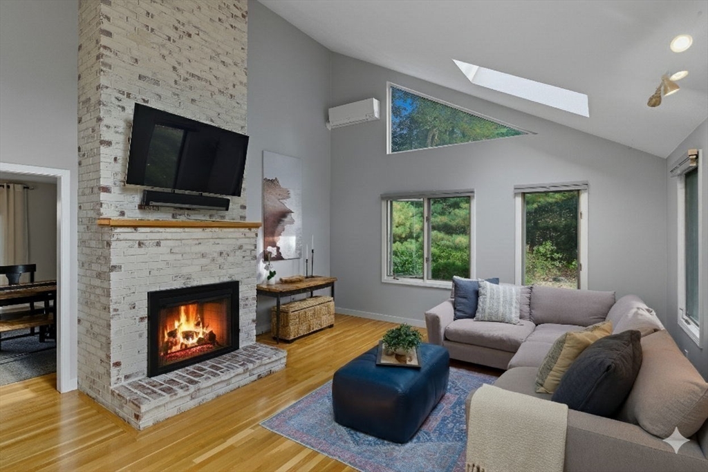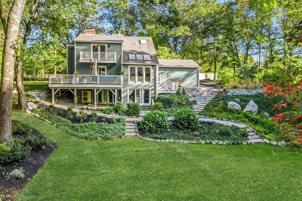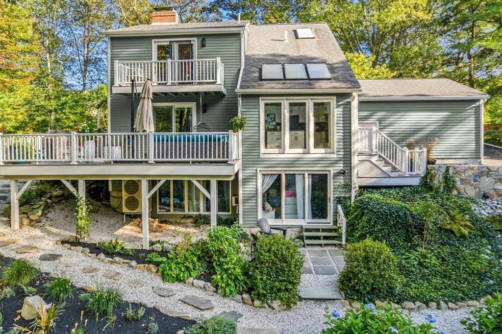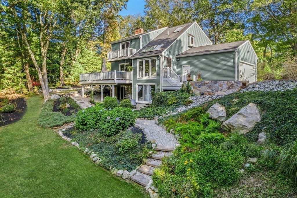 Situated on a private acre, this custom contemporary home welcomes you with soaring ceilings and walls of glass that fill the vaulted family room with natural light. A dramatic floor-to-ceiling fireplace creates a warm centerpiece, while the dining room opens to an expansive composite deck overlooking the backyard. The kitchen is bright and airy with vaulted ceilings, skylights, granite counters, stainless steel appliances, and a large center island. A first-floor bedroom and full bath offers versatility for guests or extended family. Upstairs, the primary suite is a retreat with cathedral ceilings, exposed beams, skylights, and a spa-like bath with double sinks and a beautifully tiled shower. Another spacious bedroom enjoys its own private balcony. The walk-out lower level features a wall of windows, slider access to the yard, and a cozy wood stove. Outside, meandering walkways, lush landscaping, and multiple gathering areas make the backyard a true private retreat.