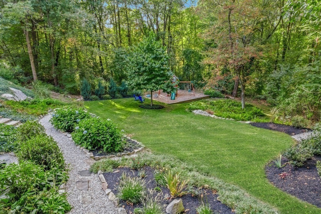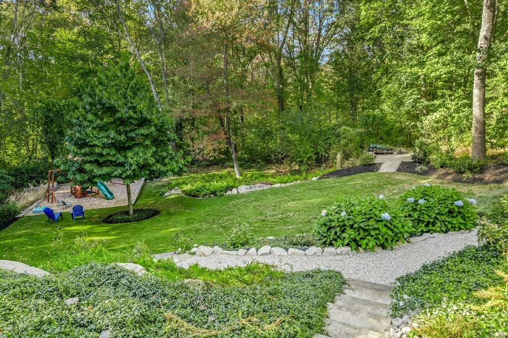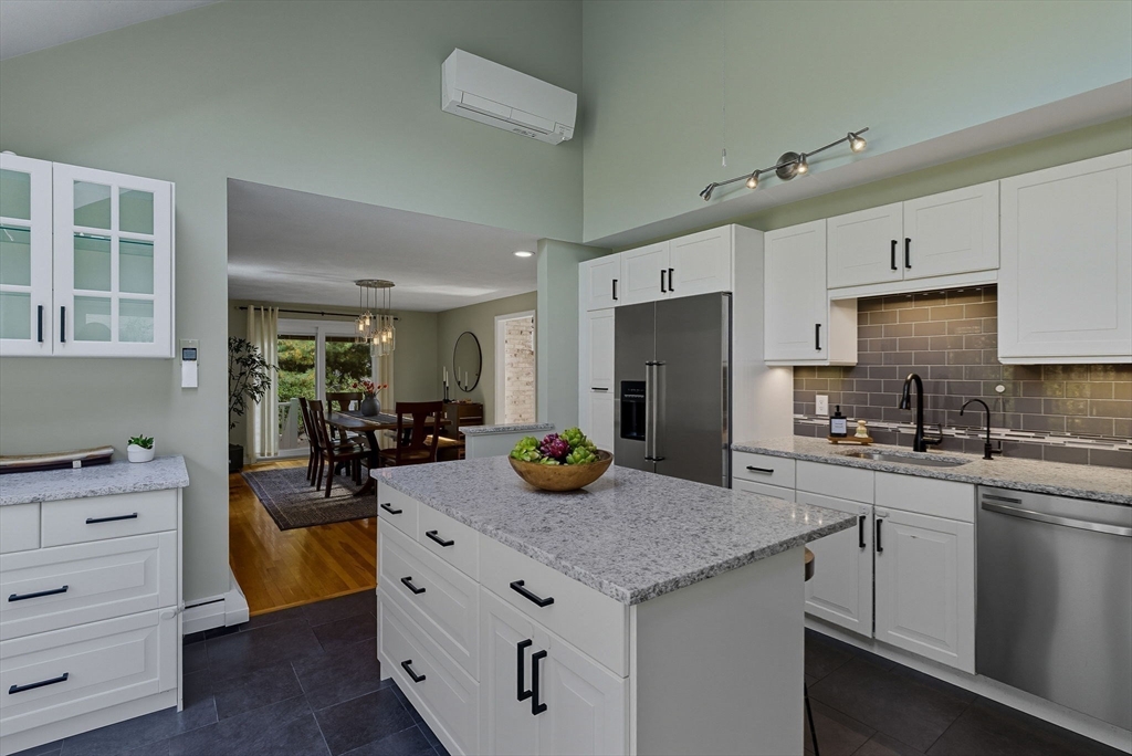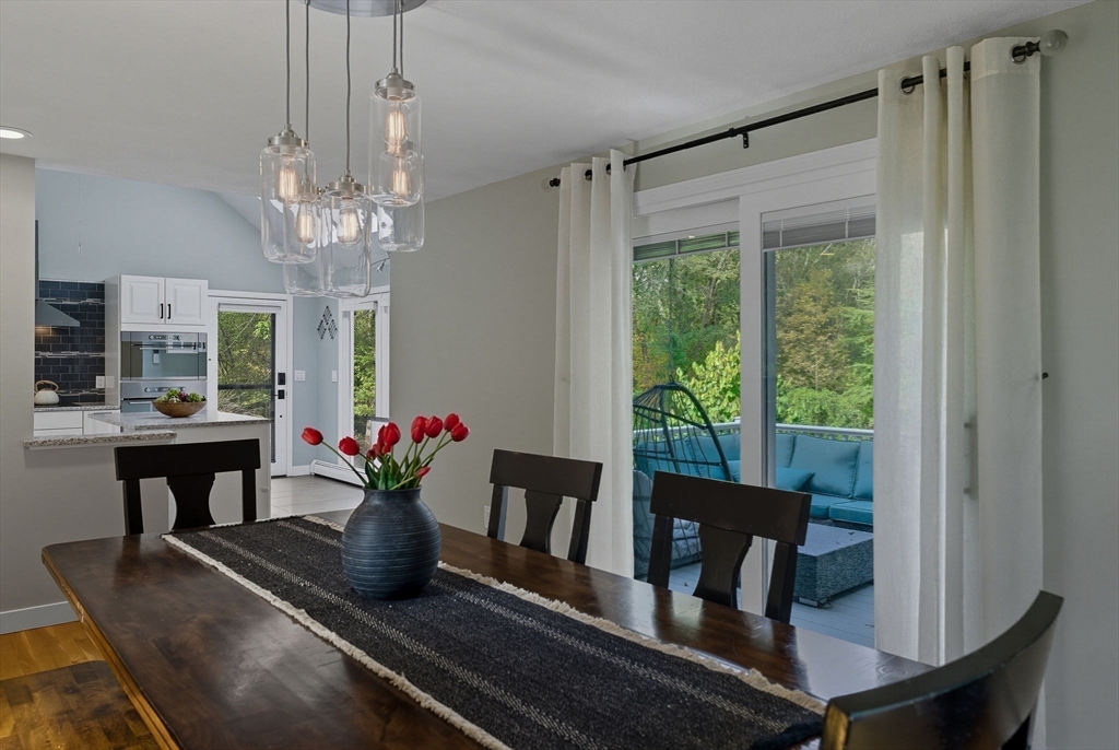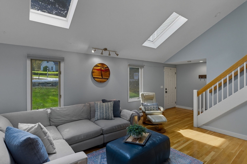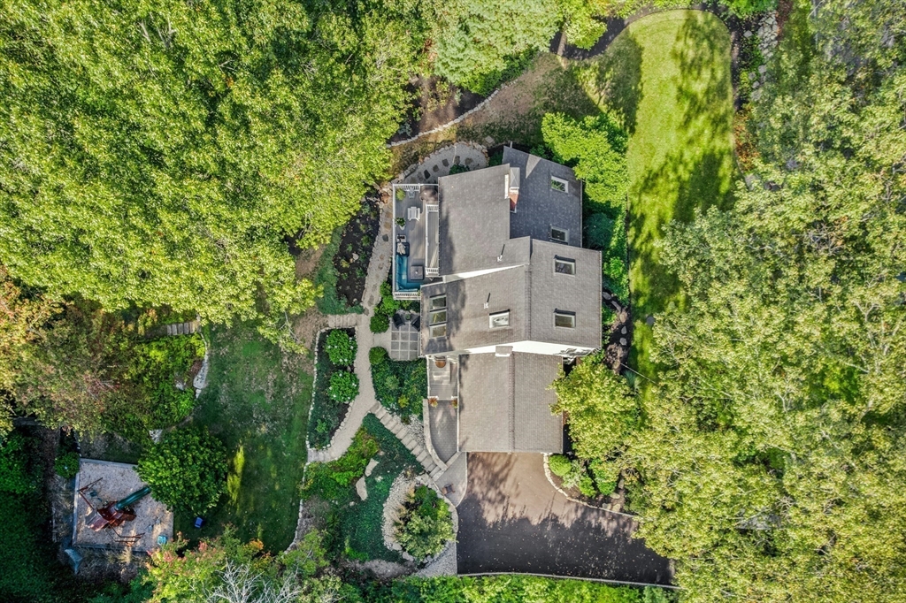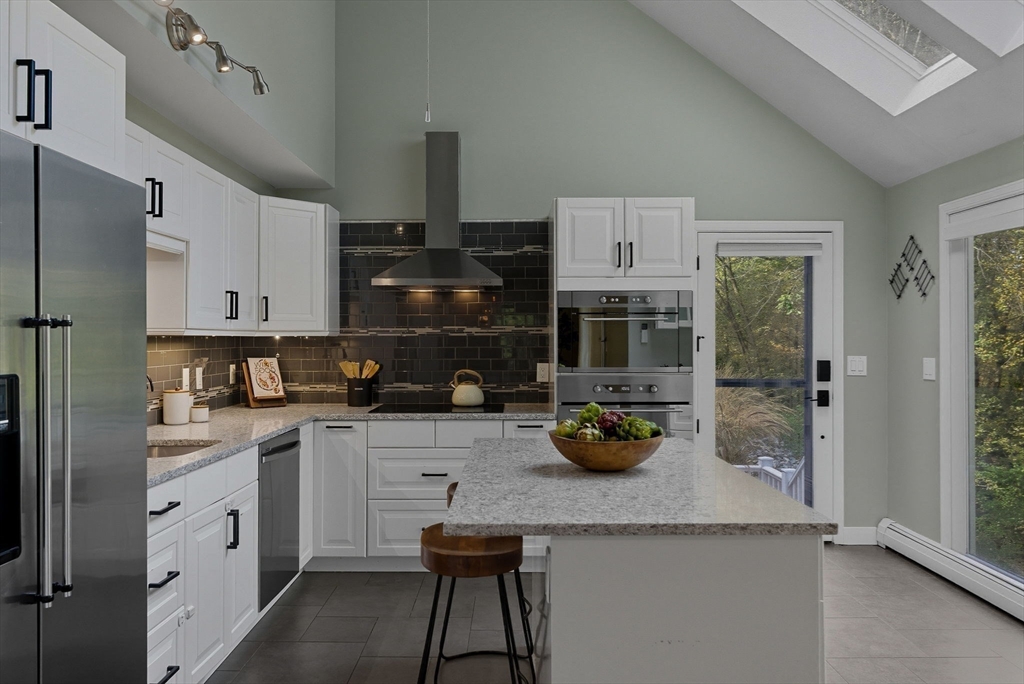 Situated on a private acre, this custom contemporary home welcomes you with soaring ceilings and walls of glass that fill the vaulted family room with natural light. A dramatic floor-to-ceiling fireplace creates a warm centerpiece, while the dining room opens to an expansive composite deck overlooking the backyard. The kitchen is bright and airy with vaulted ceilings, skylights, granite counters, stainless steel appliances, and a large center island. A first-floor bedroom and full bath offers versatility for guests or extended family. Upstairs, the primary suite is a retreat with cathedral ceilings, exposed beams, skylights, and a spa-like bath with double sinks and a beautifully tiled shower. Another spacious bedroom enjoys its own private balcony. The walk-out lower level features a wall of windows, slider access to the yard, and a cozy wood stove. Outside, meandering walkways, lush landscaping, and multiple gathering areas make the backyard a true private retreat.