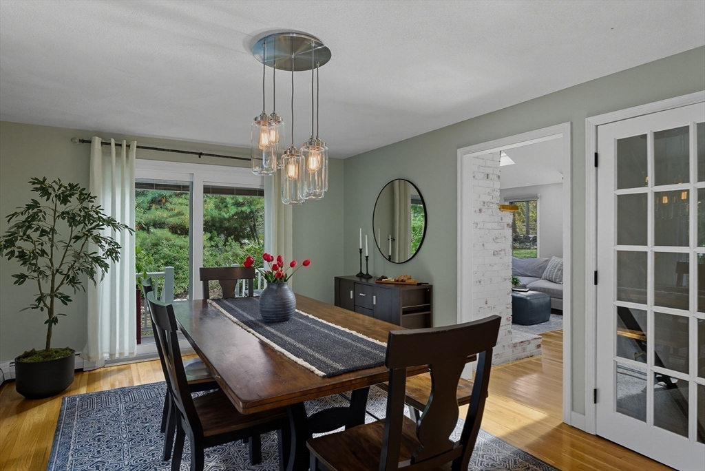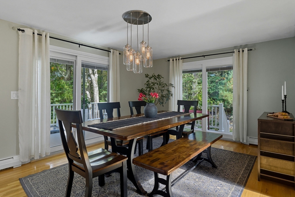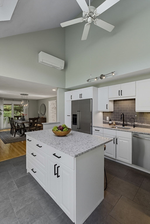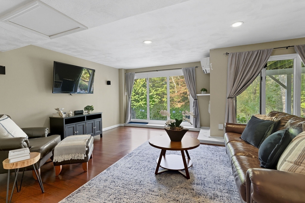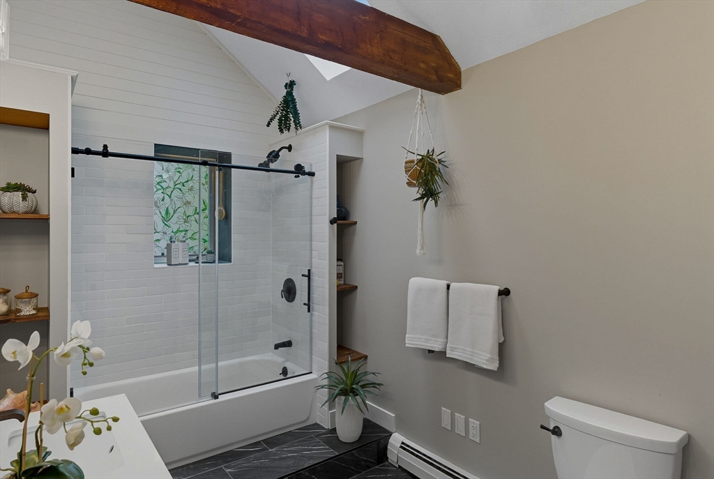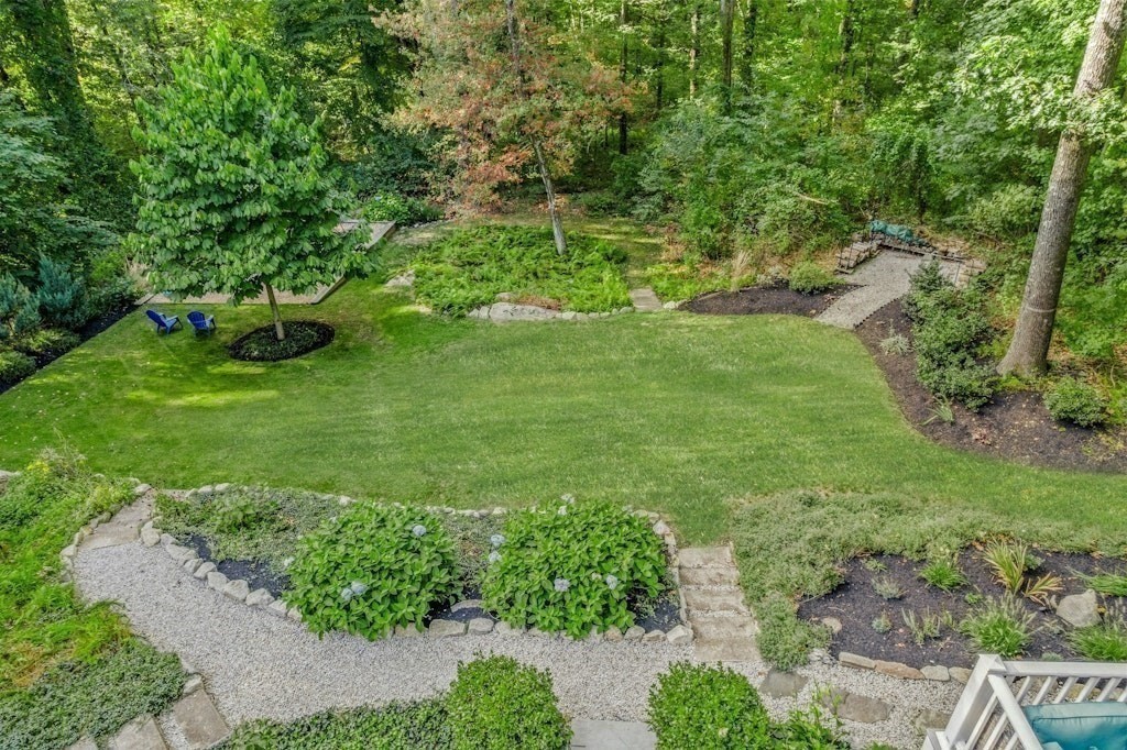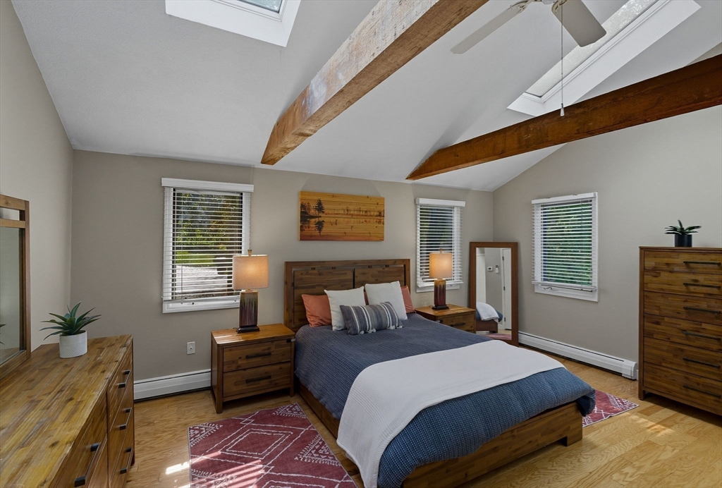 Situated on a private acre, this custom contemporary home welcomes you with soaring ceilings and walls of glass that fill the vaulted family room with natural light. A dramatic floor-to-ceiling fireplace creates a warm centerpiece, while the dining room opens to an expansive composite deck overlooking the backyard. The kitchen is bright and airy with vaulted ceilings, skylights, granite counters, stainless steel appliances, and a large center island. A first-floor bedroom and full bath offers versatility for guests or extended family. Upstairs, the primary suite is a retreat with cathedral ceilings, exposed beams, skylights, and a spa-like bath with double sinks and a beautifully tiled shower. Another spacious bedroom enjoys its own private balcony. The walk-out lower level features a wall of windows, slider access to the yard, and a cozy wood stove. Outside, meandering walkways, lush landscaping, and multiple gathering areas make the backyard a true private retreat.