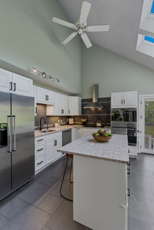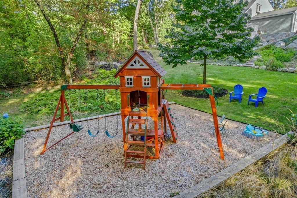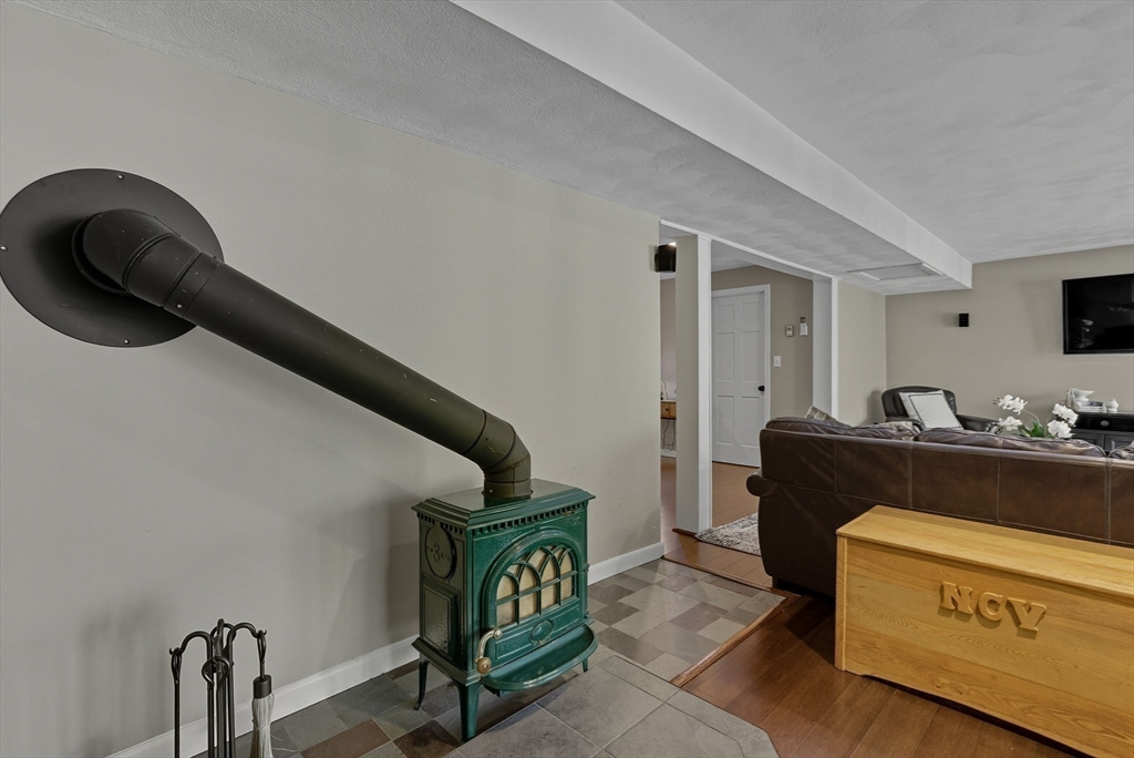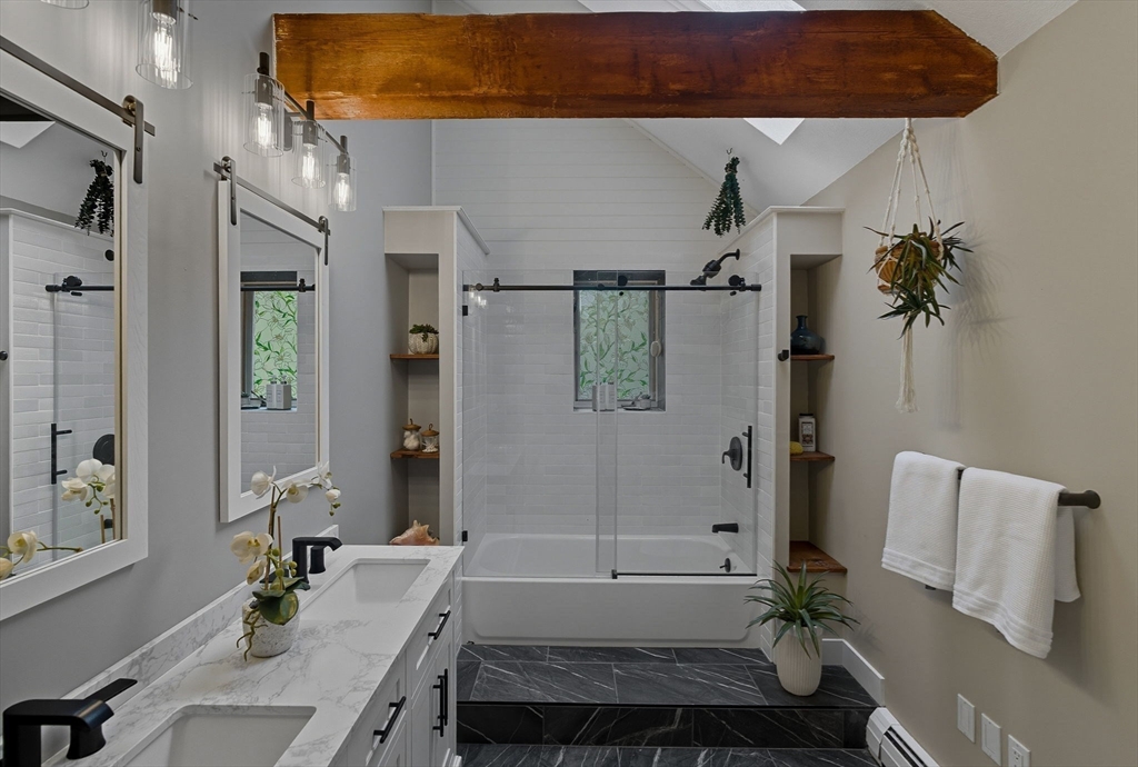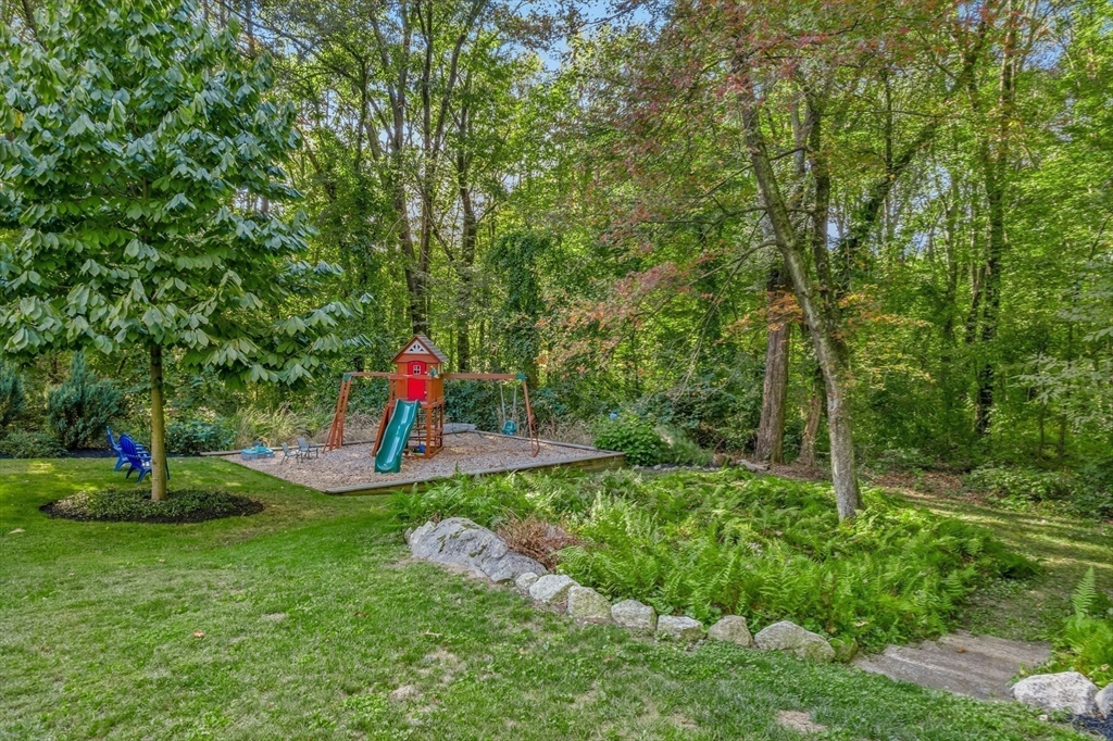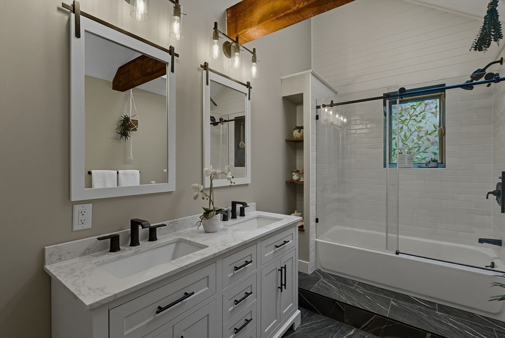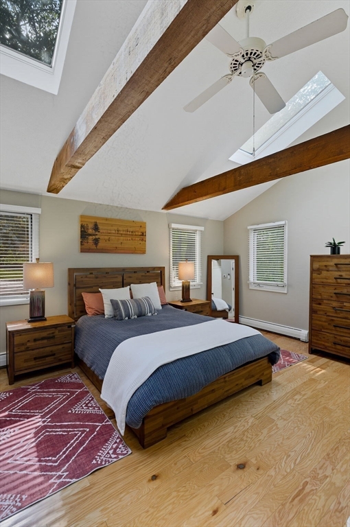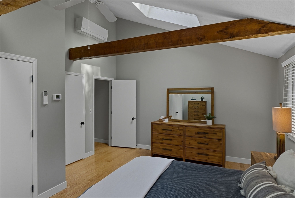 Situated on a private acre, this custom contemporary home welcomes you with soaring ceilings and walls of glass that fill the vaulted family room with natural light. A dramatic floor-to-ceiling fireplace creates a warm centerpiece, while the dining room opens to an expansive composite deck overlooking the backyard. The kitchen is bright and airy with vaulted ceilings, skylights, granite counters, stainless steel appliances, and a large center island. A first-floor bedroom and full bath offers versatility for guests or extended family. Upstairs, the primary suite is a retreat with cathedral ceilings, exposed beams, skylights, and a spa-like bath with double sinks and a beautifully tiled shower. Another spacious bedroom enjoys its own private balcony. The walk-out lower level features a wall of windows, slider access to the yard, and a cozy wood stove. Outside, meandering walkways, lush landscaping, and multiple gathering areas make the backyard a true private retreat.