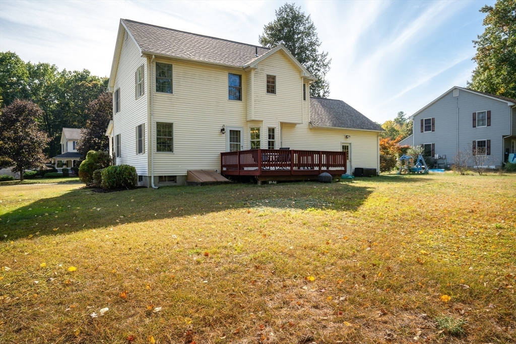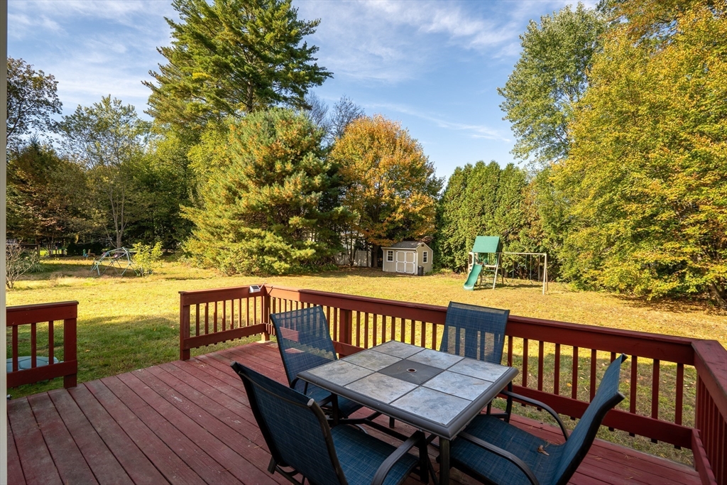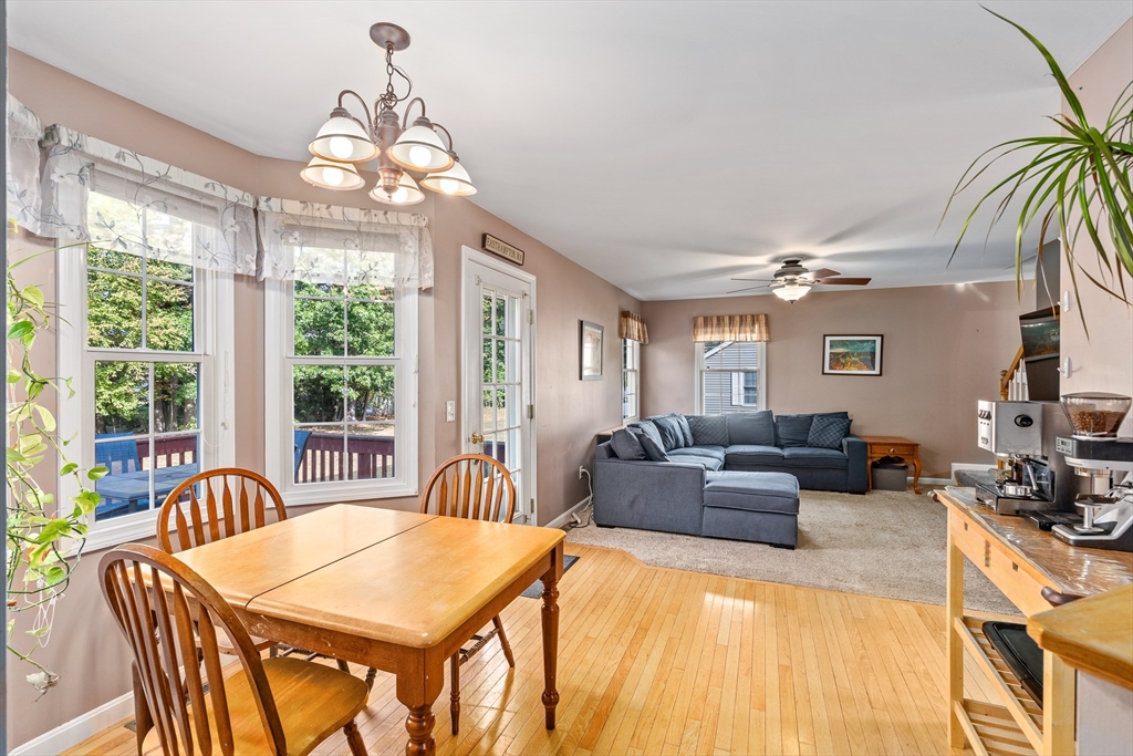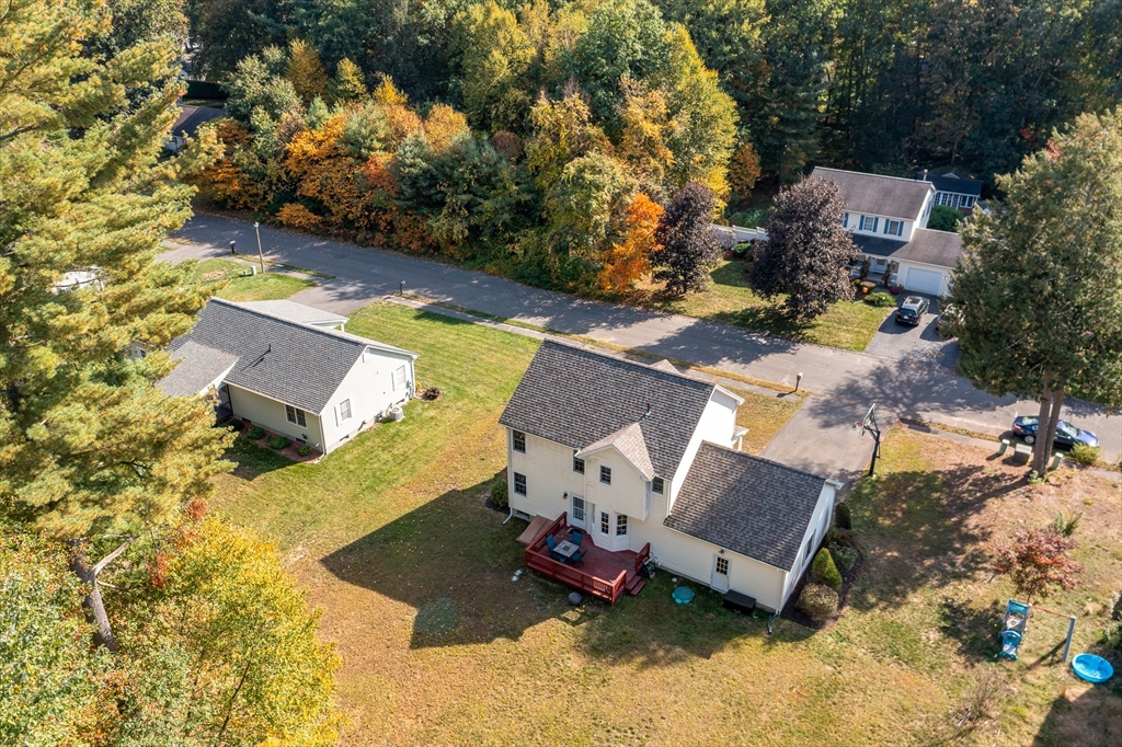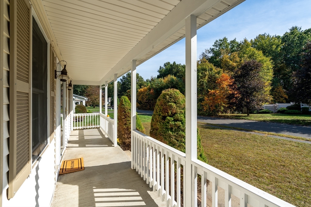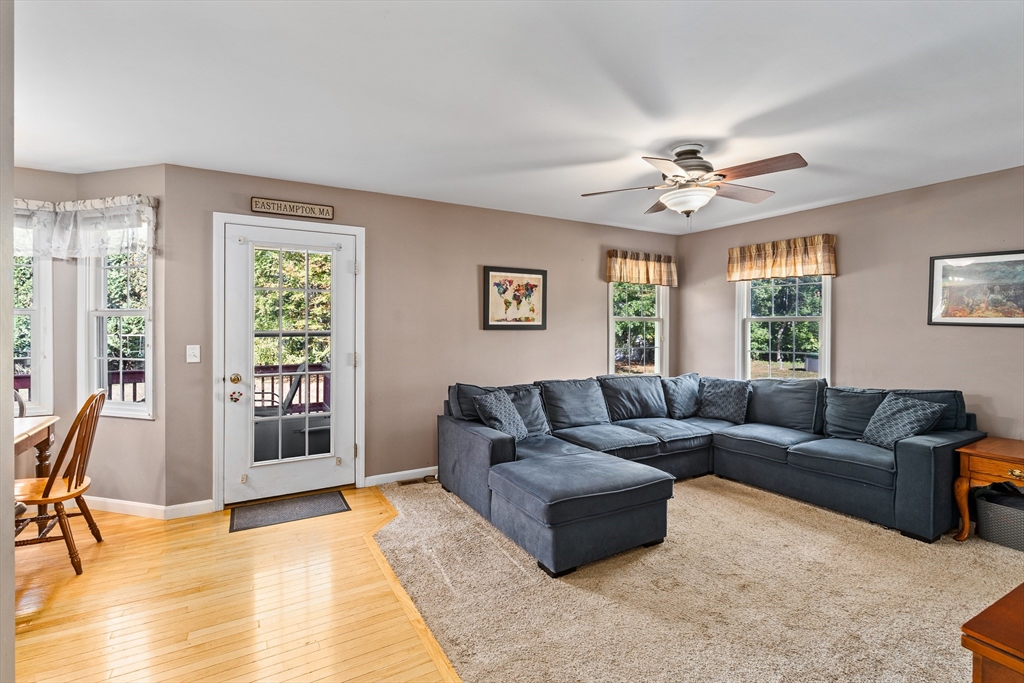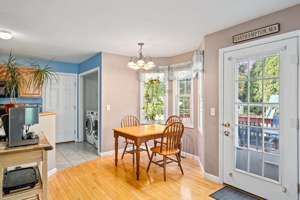 Charming colonial in one of Easthampton's most sought after neighborhoods. The inviting front porch leads to a spacious first floor with living room open to kitchen with breakfast nook, formal dining room with hardwood floors, office or family room, convenient 1/2 bath and laundry. Upstairs are three bedrooms, including a primary bedroom with ensuite bath with a jacuzzi tub and separate shower, plus an additional full bath. Relax on the deck overlooking the peaceful backyard. Recent updates include a newer roof, furnace, hot water and central air condenser and also featuring economical natural gas heat and central air. Well maintained home with beautiful curb appeal!