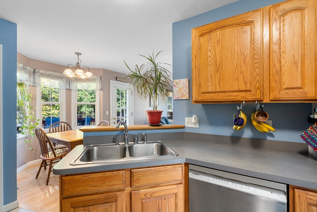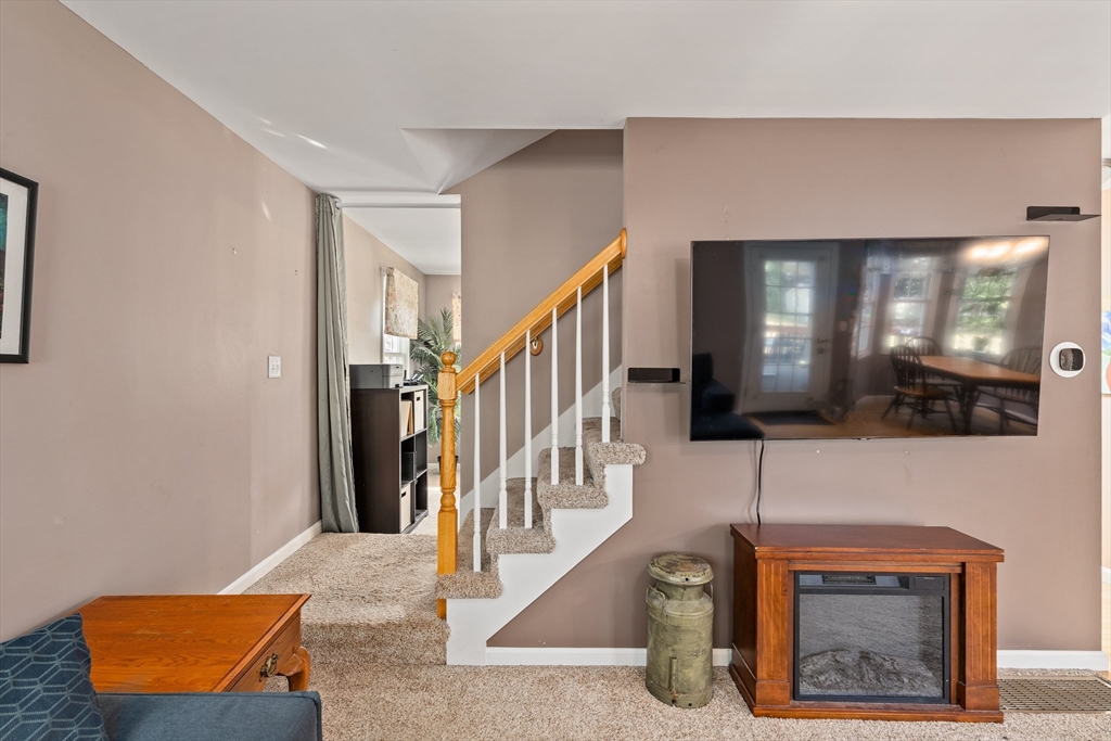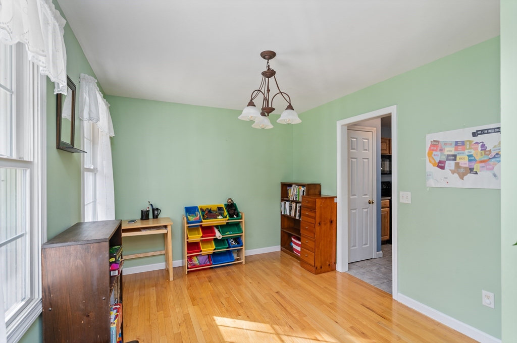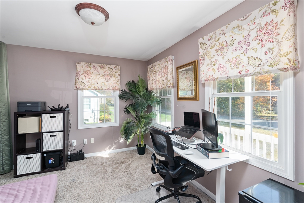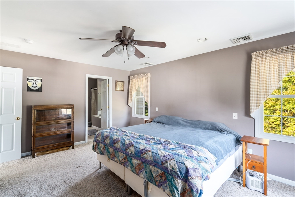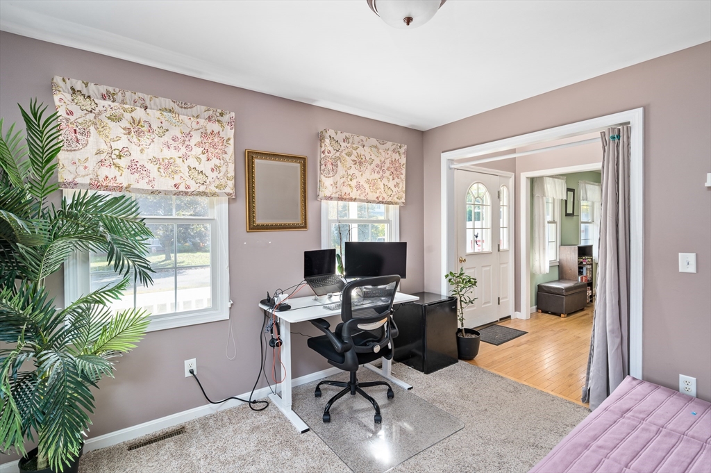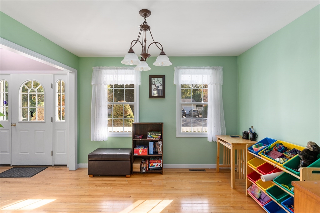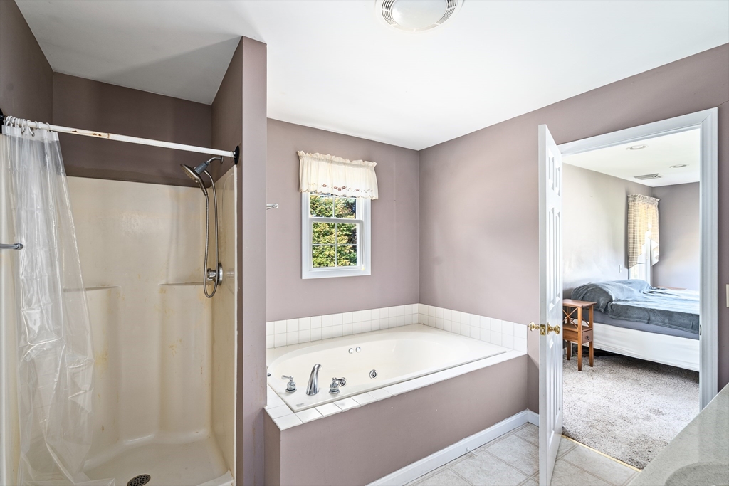 Charming colonial in one of Easthampton's most sought after neighborhoods. The inviting front porch leads to a spacious first floor with living room open to kitchen with breakfast nook, formal dining room with hardwood floors, office or family room, convenient 1/2 bath and laundry. Upstairs are three bedrooms, including a primary bedroom with ensuite bath with a jacuzzi tub and separate shower, plus an additional full bath. Relax on the deck overlooking the peaceful backyard. Recent updates include a newer roof, furnace, hot water and central air condenser and also featuring economical natural gas heat and central air. Well maintained home with beautiful curb appeal!