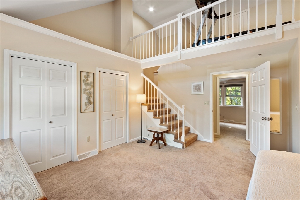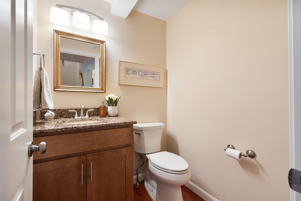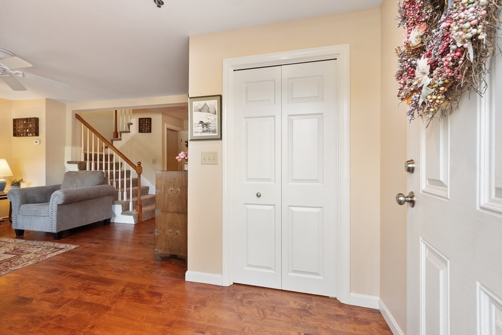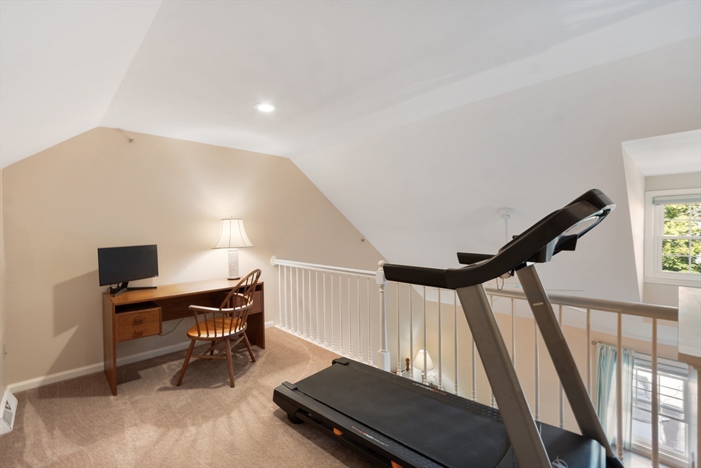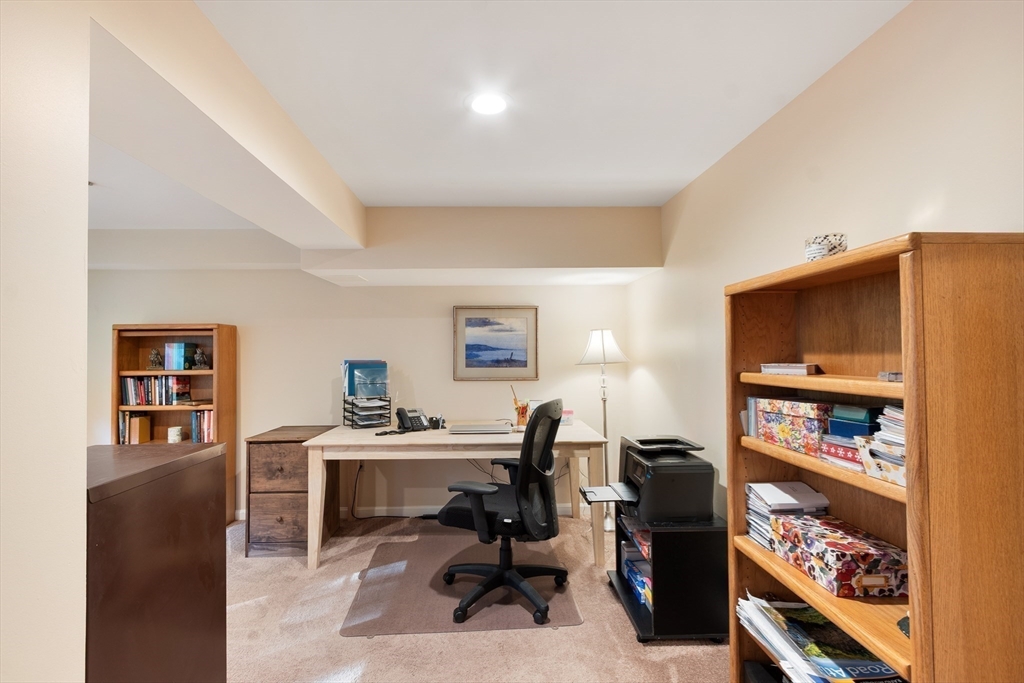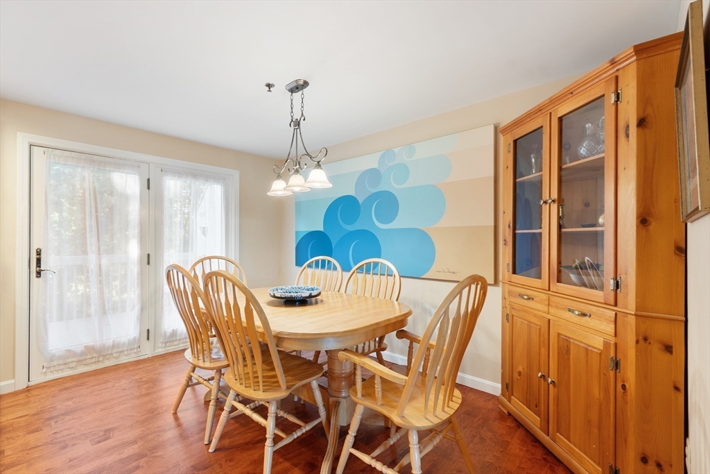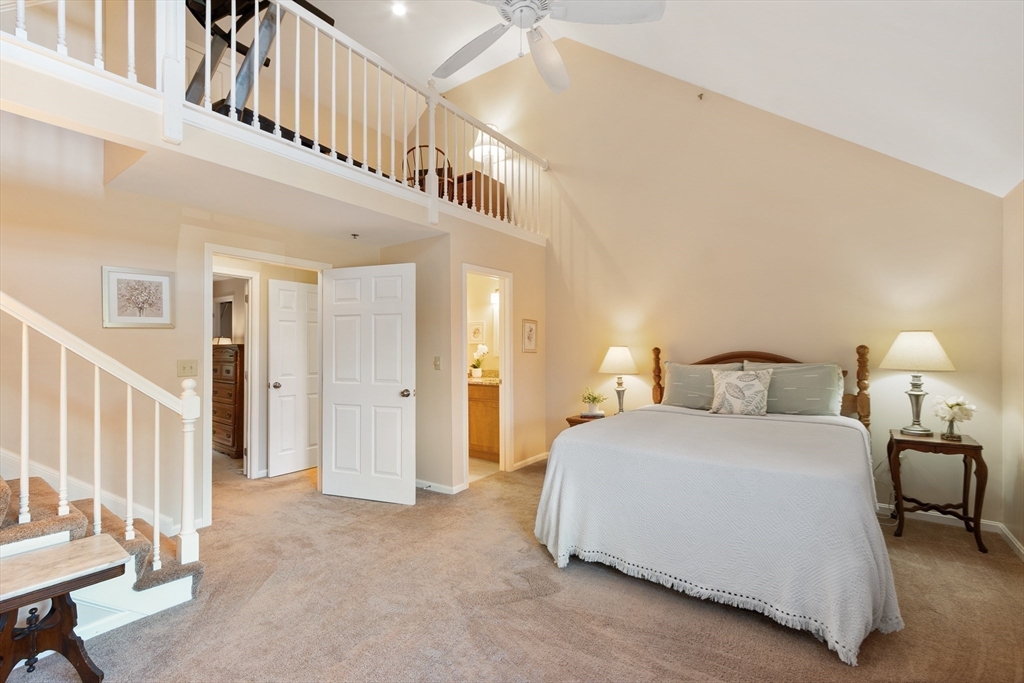 Welcome to this beautifully updated townhouse in Pilgrim Village II, offering modern updates and flexible living spaces! This home features 2 spacious bedrooms, an open floor plan, a versatile finished basement, and a cozy loft—perfect for both relaxation and productivity. Gleaming hardwood floors span the first level, while the updated kitchen shines with stainless steel appliances, granite countertops, and a dining area overlooking nature. Step out to the spacious composite deck with freshly painted railings—ideal for morning coffee or quiet evenings. Upstairs, the primary suite includes an adjoining loft that makes a perfect retreat or office nook. The main bath offers double sinks and a tiled tub/shower. The partially finished basement expands your options with a dedicated home office, and direct walkout access to a peaceful outdoor space, plus ample storage. Conveniently located near schools, shopping, the hospital, and conservation trails for year-round recreation.
