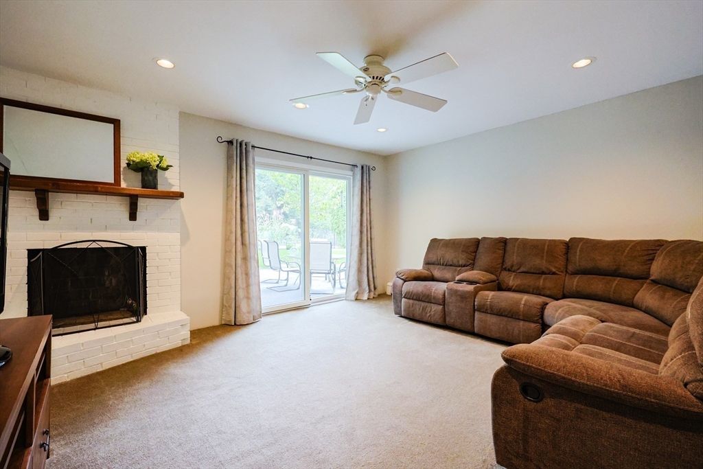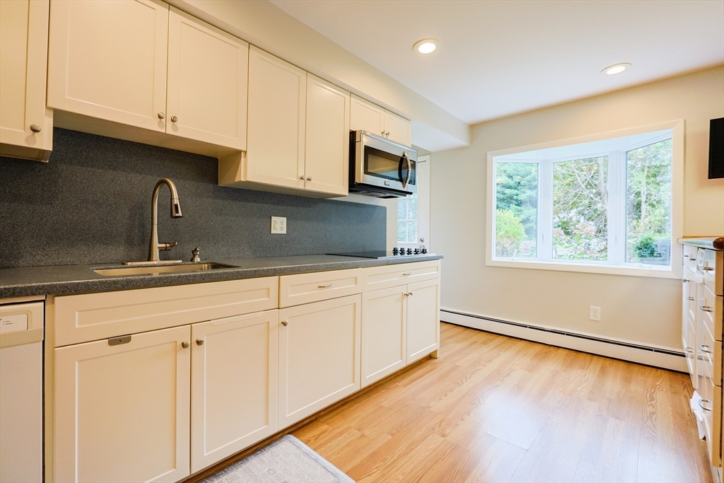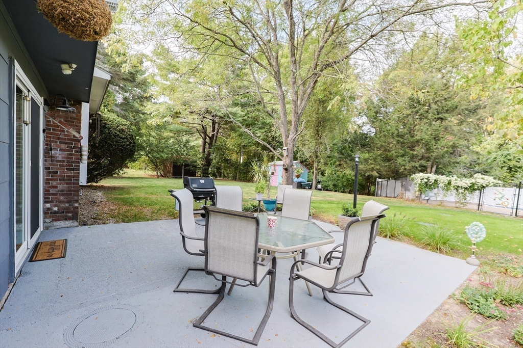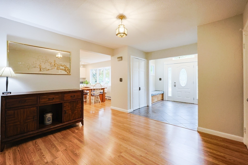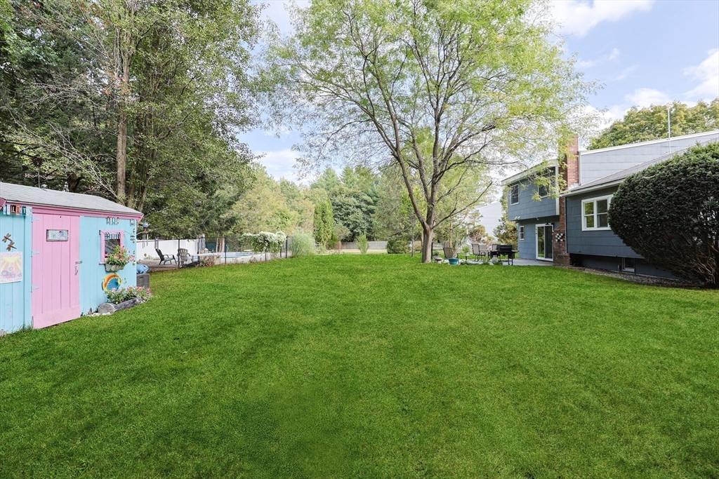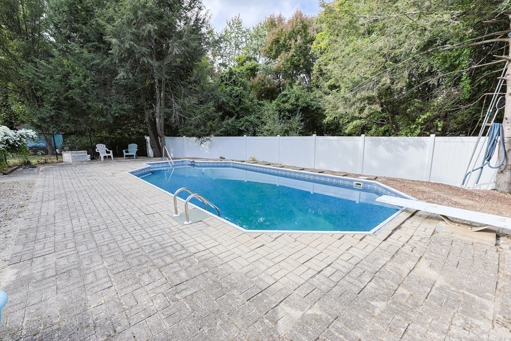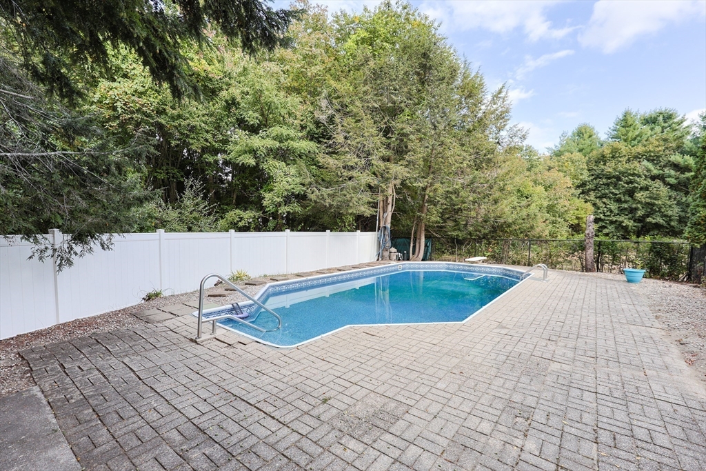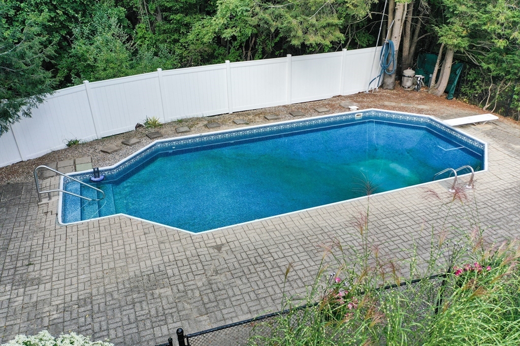 Spacious and sunny colonial with central AC and inground pool is ideally located in one of Holliston's most popular neighborhoods, close to commuter rail, shops, and major routes. Fabulous open kitchen is bathed in sunlight, featuring white cabinetry, stainless appliances (including the double oven!), large eating area with bay window, oversized peninsula w/storage and seating, pantry and abundant countertop space. Fireplaced family room with slider to patio and lovely patio and backyard; vaulted ceiling living room with HW floors under carpet; convenient 1st floor laundry and powder room complete the main level. Upstairs are all four bedrooms with hardwood floors PLUS a bonus room or additional bedroom. Primary bedroom offers two closets plus its own private full bathroom. Updates include: 4 BR septic system (2025); interior painting; oil tank and HW heater (2022); windows; pool liner, pump & filter. Flat, beautiful yard with fenced pool area. Such great space, both inside and out