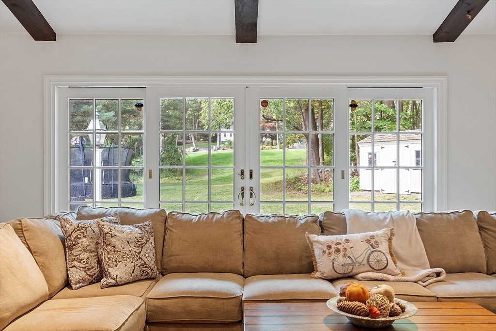Welcome to this Custom Royal Barry Will’s home offering effortless one-level living in one of Lynnfield's most sought-after neighborhoods. Formal foyer opens to a bright living room, featuring vaulted beamed ceilings, brick FP, HW floors, recessed lighting, & sliding French doors to private patio, perfect for entertaining. Formal dining room showcases crown molding & chair rail detailing. Snuggle up in front of the FP in the warm & inviting Fam Rm w/beamed ceilings & recessed lights. Sit by the window & enjoy your morning coffee in the eat-in kitchen w/sleek granite countertops, tiled backsplash & double ovens. Four spacious bedrooms all w/HW floors & crown molding. Primary suite boasts two double closets, updated en-suite bath w/marble flooring & counters, a jacuzzi tub & tiled shower. Fourth BR has private bath for guests, au pair or extended family. Set on level acre w/two newer patios, central AC, 2-car garage, shed, & circular driveway - all adding up to one perfect package!