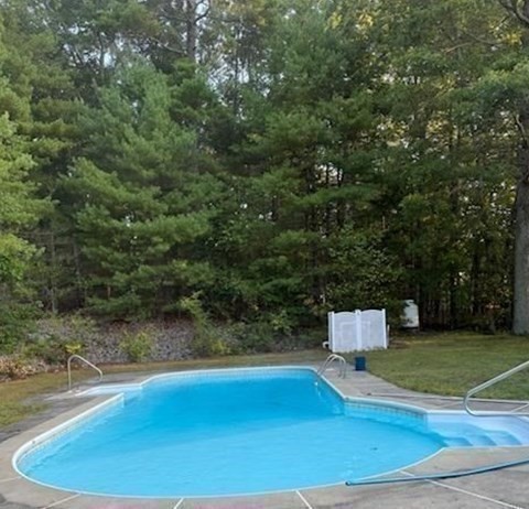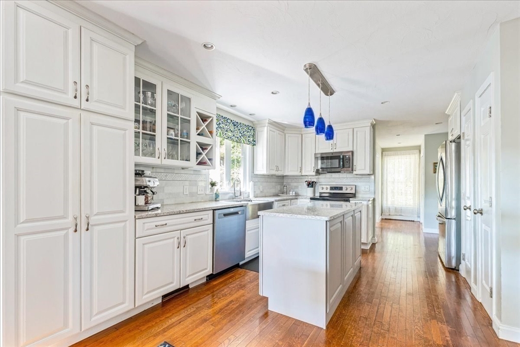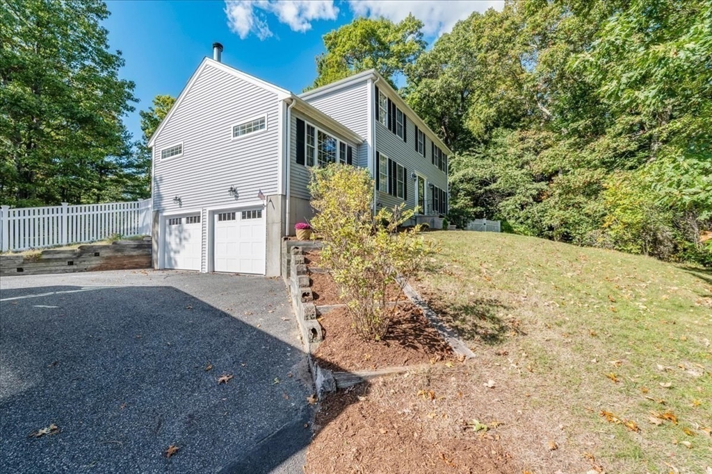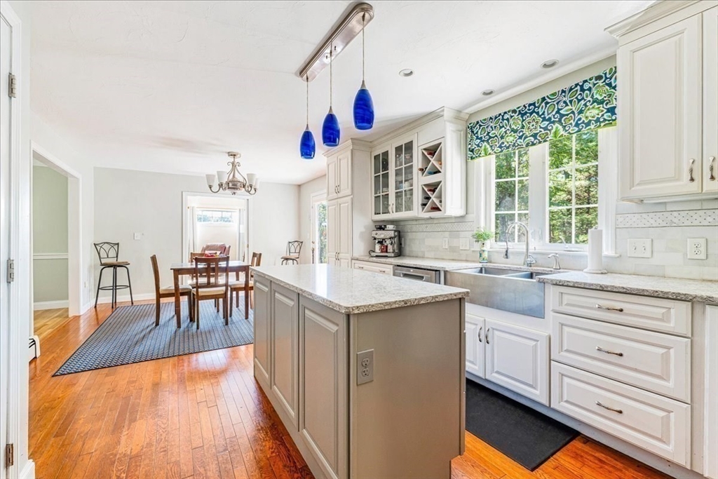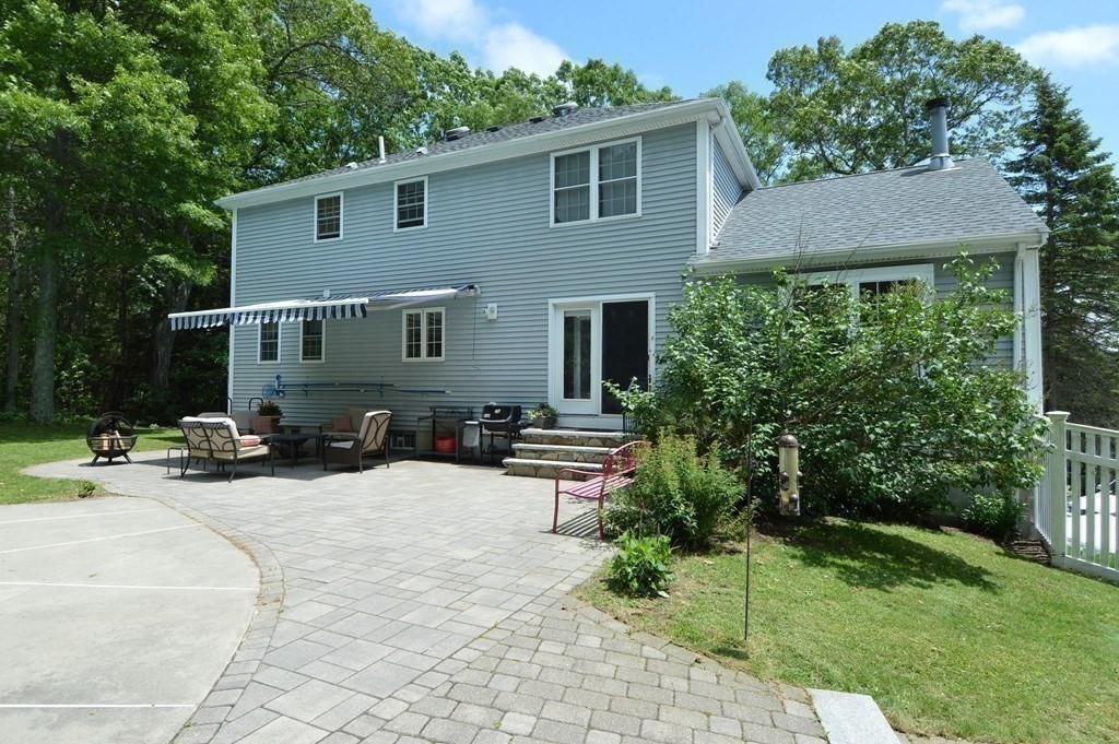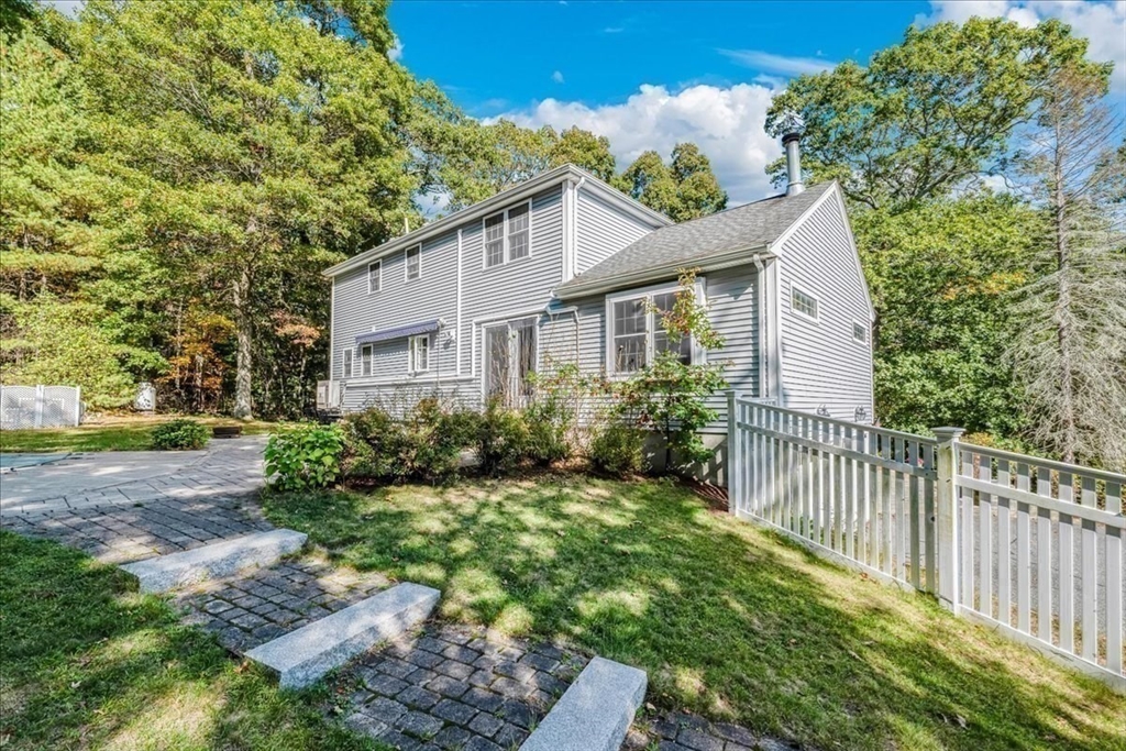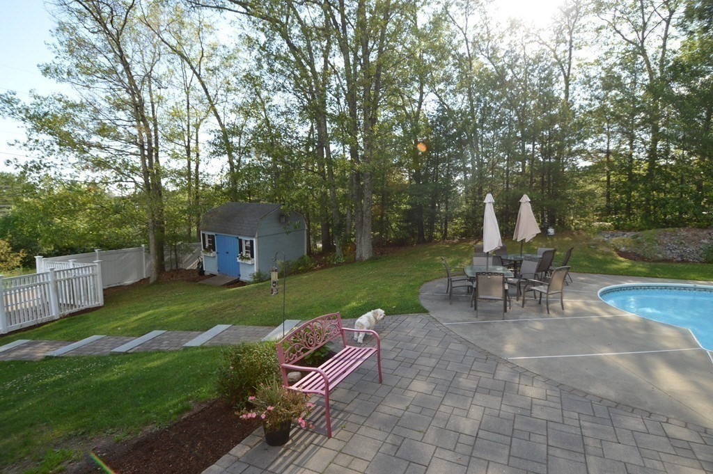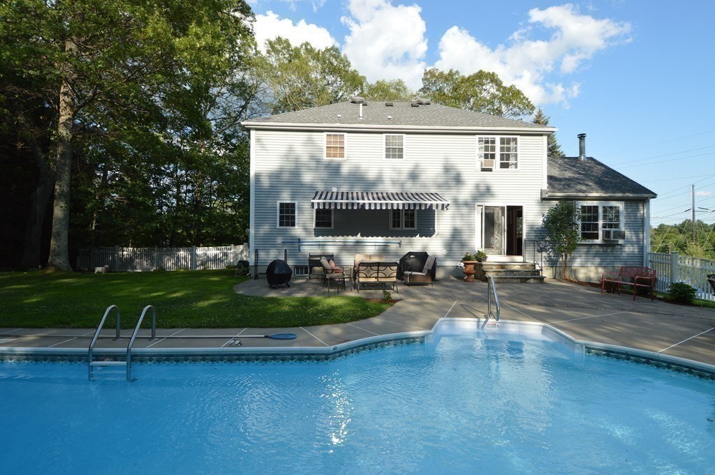 This welcoming 4-bedroom, 2.5-bath Center Entrance Colonial is set on 1.3 private wooded acres abutting Granite Estates. The heart of the home is the stunning remodeled kitchen, showcasing quartz countertops, marble backsplash, center island, stainless steel appliances, pantry, and gleaming hardwood floors. French pocket doors lead to a spectacular vaulted family room with fireplace and transom windows perfect for relaxing or entertaining. Step outside and discover your own backyard retreat featuring a sparkling kidney-shaped in-ground pool, large patio, awning, fencing, and storage shed, ideal for endless summer gatherings with family and friends. The first floor also offers a formal dining room, home office, convenient laundry room, and a half bath with ceramic tile flooring. Upstairs, you’ll find 4 generous bedrooms and 2 beautiful full baths. The finished LL provides incredible versatility w/mudroom and 2 bonus rooms perfect for media room, playroom or gym. ~3 mi to Commuter Rail.