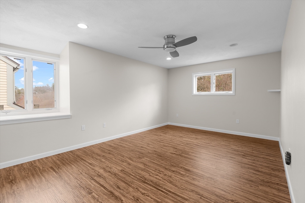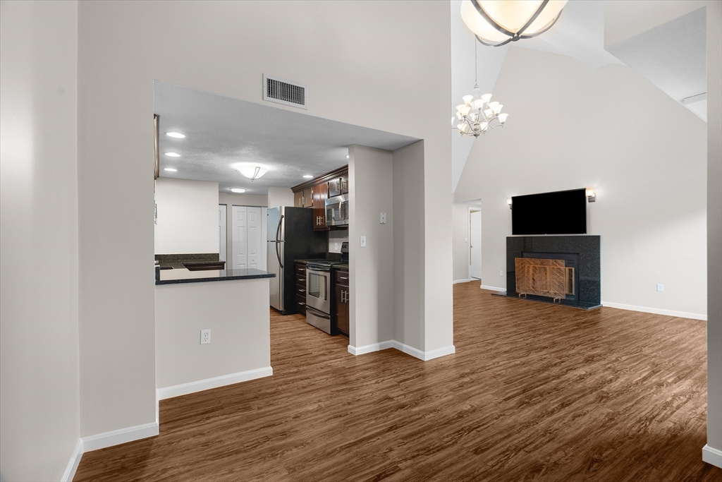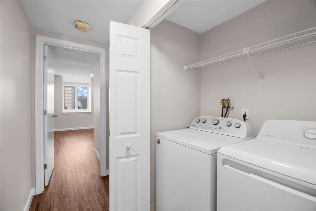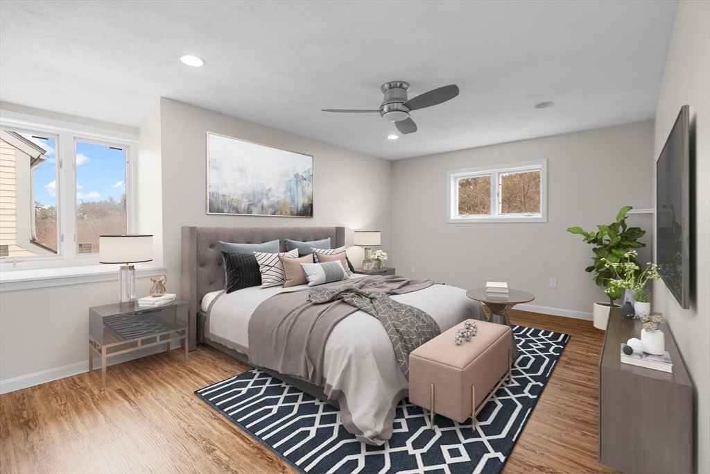 Rarely available 2 bedroom 2 bath unit in ideal Peabody/Lynnfield location. Cedar Pond Village is close to everything yet the complex is completely secluded from it all. Come see this spacious and well laid out upper level condo which is part of a well-run high owner occupancy association. Highlights include kitchen with wine fridge, in-unit laundry, central AC, master bedroom with walk-in California closet, master bath with glass walk in shower, custom light fixtures, cathedral ceiling, fireplaced living room and private porch overlooking the beautifully landscaped property. Recent updates include new heating and cooling unit, dishwaster, microwave and flooring.