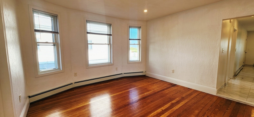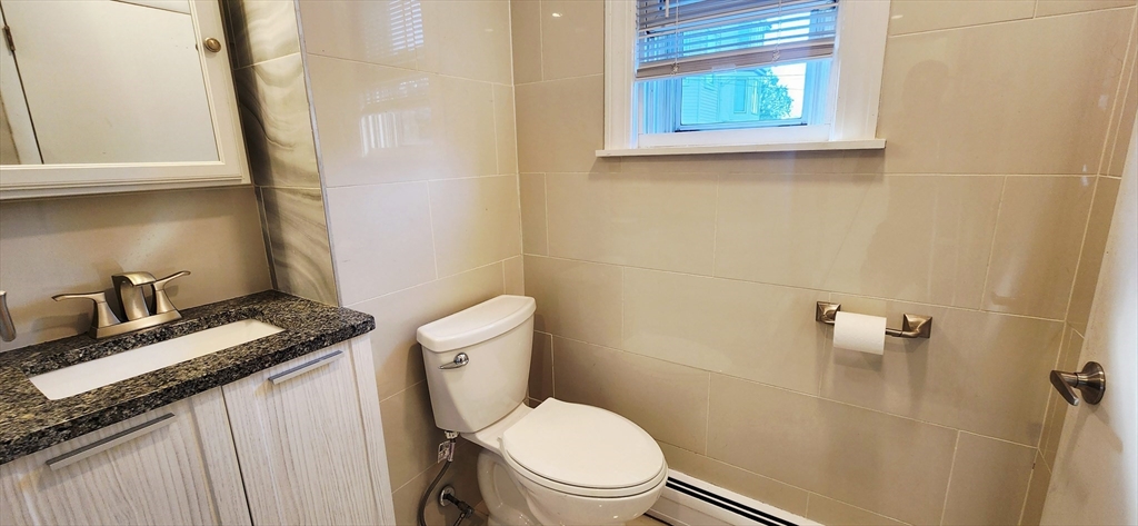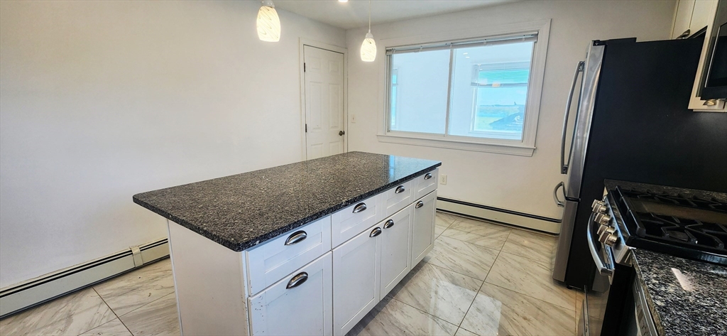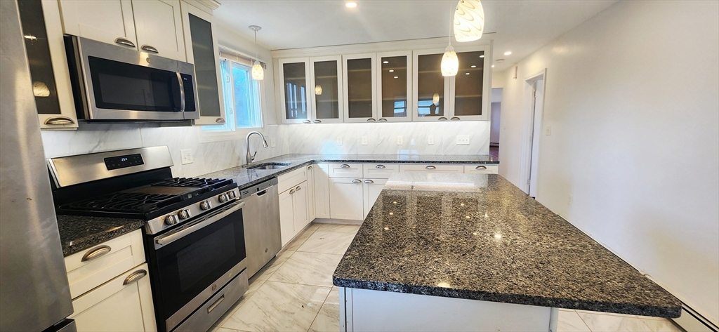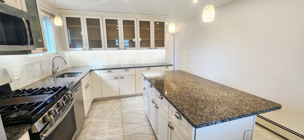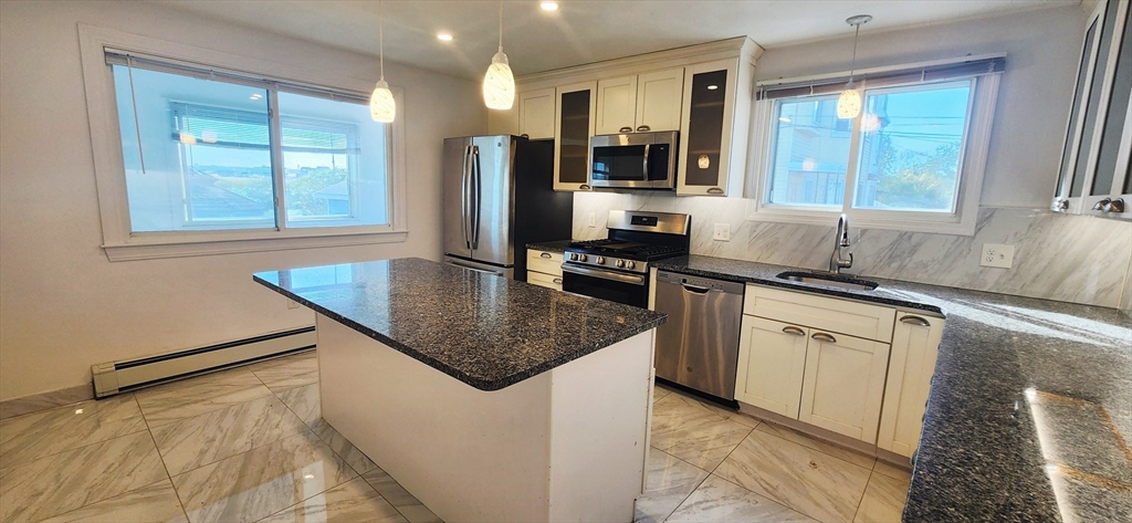 Available now for rent! Renovated apartment with 1 off-street parking near Wood Island T station in East Boston. This first floor, spacious 1300+ sqft, 3 bed 1 bath apartment features a modern chef's kitchen with tiled floors, granite counters and island, dishwasher, stainless steel appliances, plenty of cabinet space and windows overlooking the Boston Harbor. Other features include hardwood floors, tiled bathroom with stand-up shower, one large bedroom, one medium bedroom and one slightly smaller third bedroom, separate living room, shared coin op laundry in basement, 1 off-street parking space included, shared large backyard with gazebo and fenced yard with views of the airport and Boston skyline. Location is a very quiet and secluded, residential area of the neighborhood that is walking distance to the Blue Line (Wood Island T) with direct access to downtown Boston. Enjoy plenty of green space and walking paths with close proximity to Constitution Beach.