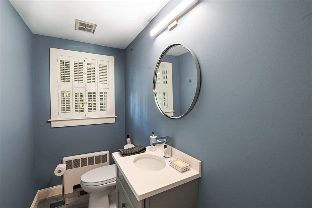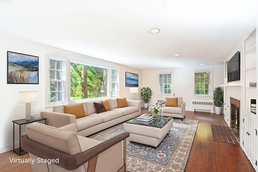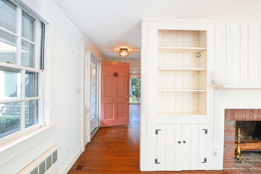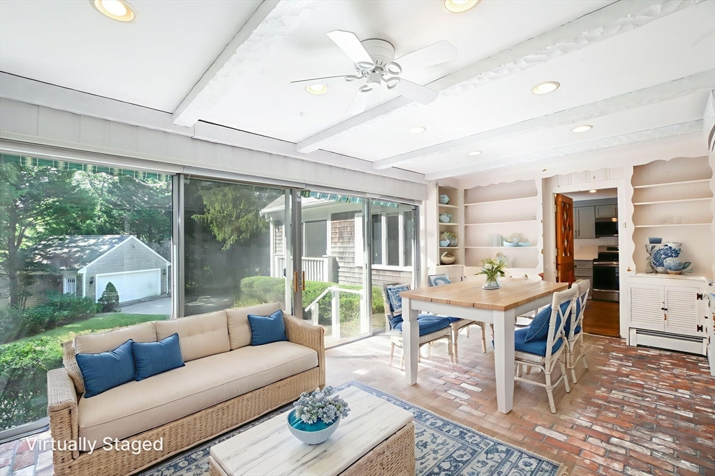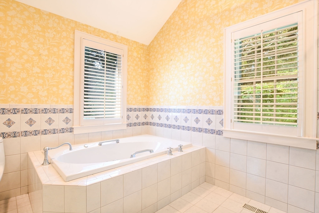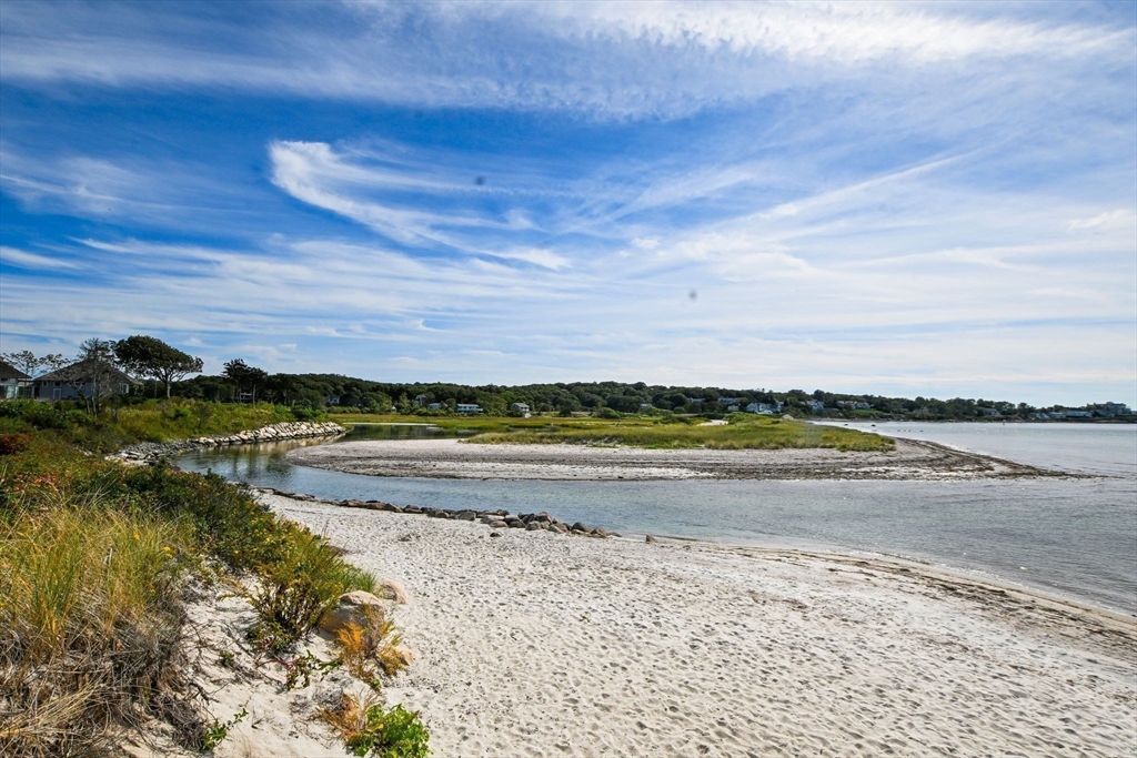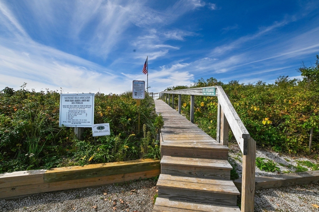 Exciting opportunity awaits in sought after Saconesset Hills in West Falmouth. This 4BR 4.5 bath Colonial residence features classic hardwood floor thru-out. First floor primary with volume ceiling is spacious and has 2 full baths, laundry and multiple closets. Large front to back LR/DR with fireplace and picture windows. Hall den with french doors to side yard. Powder room. Eat-in kitchen with quartz counters and subway tile backsplash and Frigidaire and Bosch appliances. Sunroom with brick floor. 2nd level finds 3 additional bedrooms and 2 full baths one ensuite. Lower level has an additional laundry room. Golf cart garage and storage. 2 car detached garage. FHA by gas. Central AC. Convenient Bike path access. Sprinkler system. Numerous perennials and home to a majestic Tulip tree in rear yard.