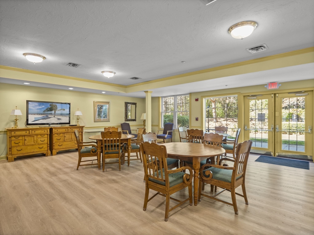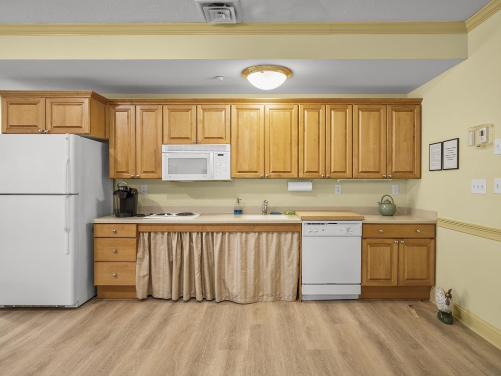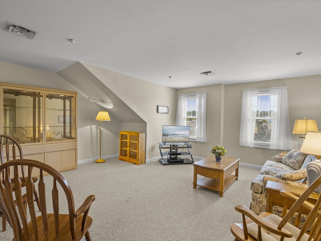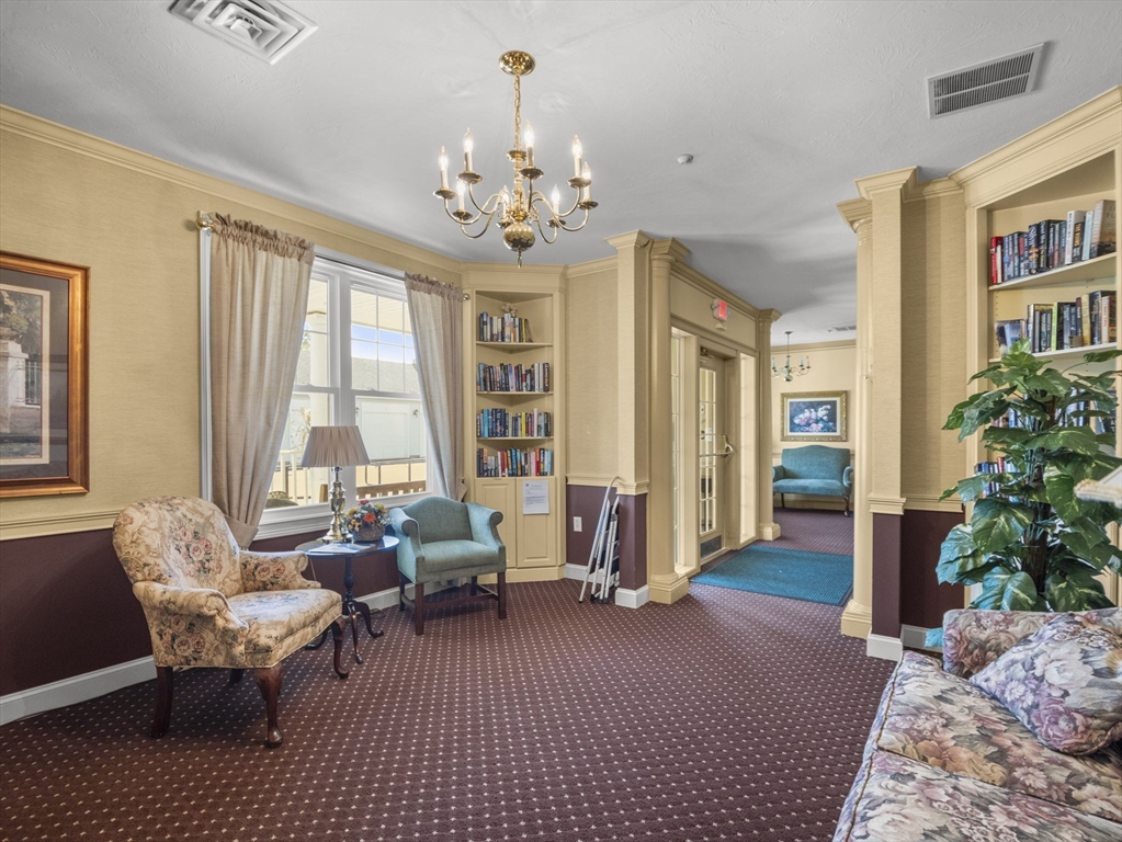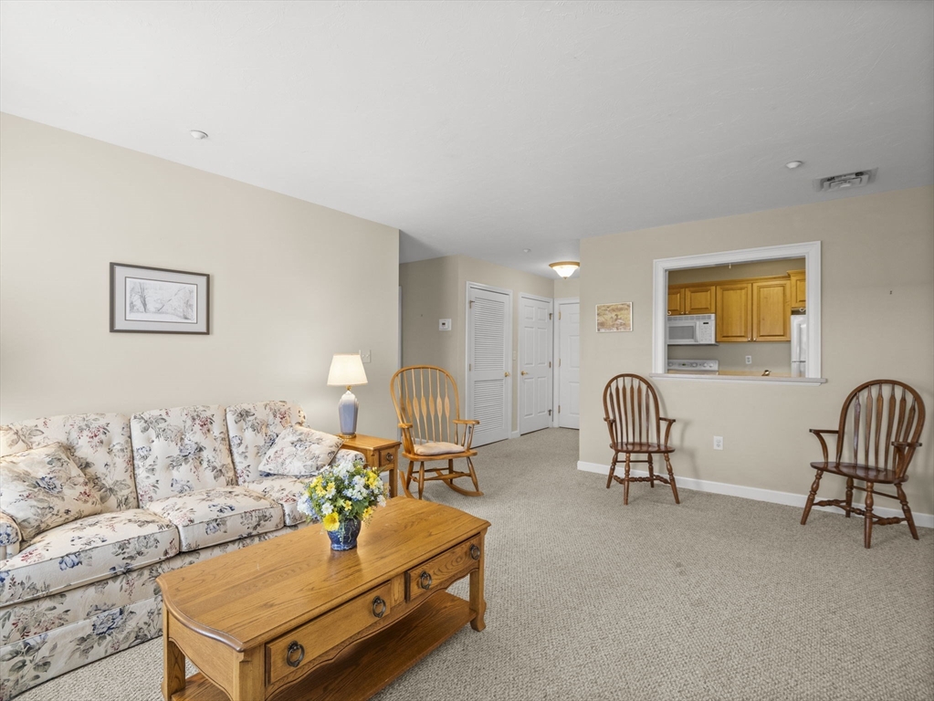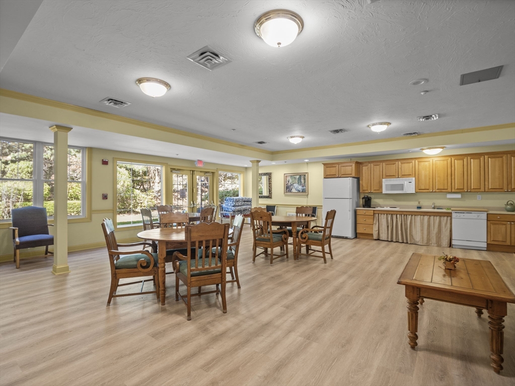 Welcome to the PINES AT ROBBINS BROOK a 55+ community in a peaceful, scenic country setting. You will feel safe in a secure, handicap accessible building, with an elevator for easy access. There is a common area library/sitting room, a large community room with a kitchen & a furnished outdoor patio for parties and a beautiful front porch. Nearby is The Bruce Freeman Rail Trail with a 1/4 mile walk to NARA Park for summer concerts, picnics and swimming, plus Quail Ridge CC (golf, pickle ball, pool). Just two miles away is Butter Brook Golf Club & many shops and restaurants. Enjoy One-level living in this EAST-FACING home. The pristine kitchen has Corian Counters and is fully applianced w/maple cabinets. The unit bosts a large bright dining - living room open floor plan, There is a large master bedroom suite with a large walk in closet & a handicap accessible bathroom with a walk-in shower. An ample sized Bedroom 2 for a guest, hobby, or office with an adjacent 1/2 bath. MOVE IN READY