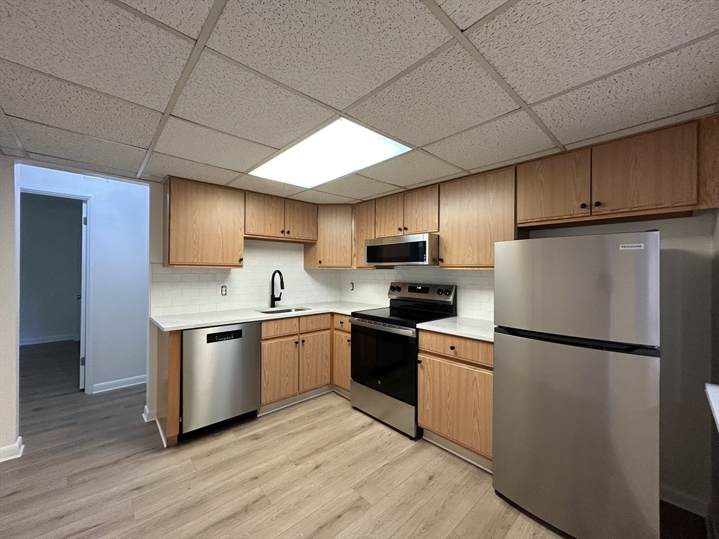Move-in-ready condo in a prime in-town location offers modern convenience and low-maintenance living. The interior features an open-concept layout with fresh paint, updated flooring, and contemporary fixtures. The kitchen boasts newer stainless steel appliances (refrigerator, dishwasher, oven, and microwave), sleek cabinetry, tiled backsplash, and quartz countertops. Bathroom is updated with modern vanity, quartz counter, tiled shower, and new floor tile. Large windows in unit provide natural light. Private balcony overlooks rear yard. The condo fee covers an extensive list of inclusions, such as HEAT, hot water, sewer, trash, exterior maintenance, landscaping, snow removal, and loads of extra parking. With all of the upgrades complete just move in and enjoy.