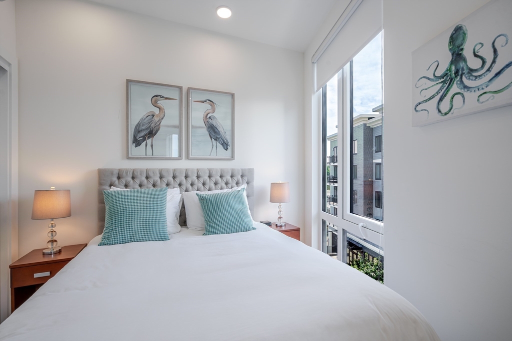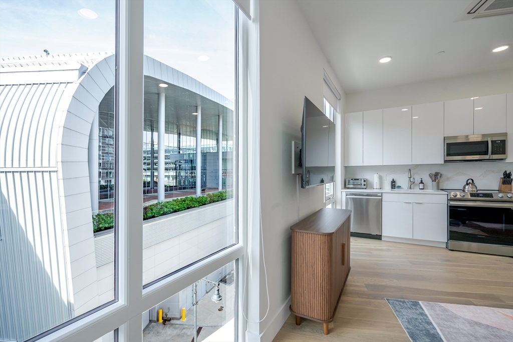 Welcome to this bright one-bedroom at The Vera in Boston Landing/Allston–Brighton, a brand new boutique luxury building offering floor-to-ceiling windows, high-end systems, and an open layout that makes everyday living effortless. The living area is filled with natural light and offers comfortable seating, a TV, and a dining nook for two. The modern kitchen is fully equipped, making at-home dining seamless and convenient. The bedroom features a queen bed, set against tall inviting windows. A sleek bathroom with heated floors and mirror, along with in-unit laundry and central air conditioning, add everyday ease. Building amenities include an elevator, a secure mailroom, keyless entry, and access to a spacious roof deck with BBQ. Garage parking is available, dedicated bike room with garage-level access makes commuting straightforward. Residents enjoy discounted membership to NB Fitness Club. You’ll also find a community dog park, green spaces, and scenic Charles R