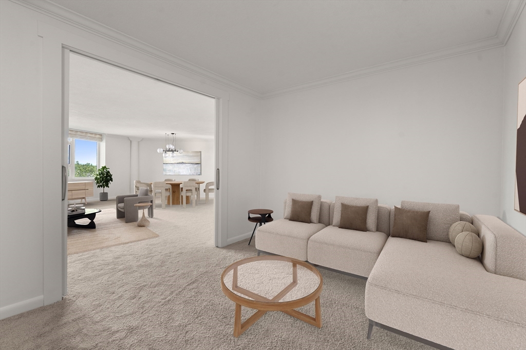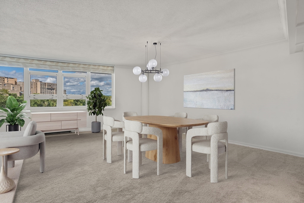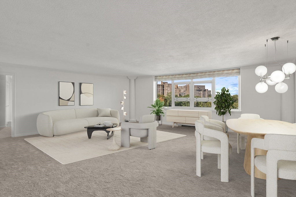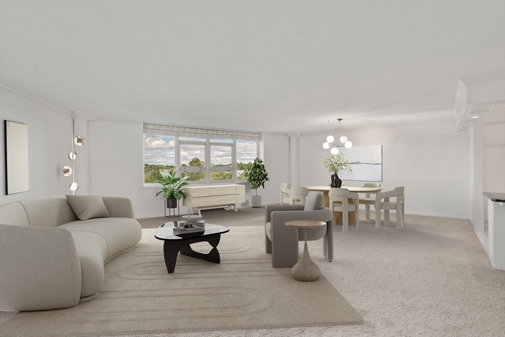 Beautifully designed 1-bedroom plus den residence on the 9th floor, offering sweeping views and abundant natural light throughout. The open-concept kitchen, living, and dining areas create a seamless flow, ideal for both everyday living and entertaining. The versatile den can easily function as a home office, family room, or guest space. A spacious primary suite features a walk-in closet and en-suite bath for comfort and privacy. Enjoy summer days by the pool and take advantage of the building’s exceptional amenities: a welcoming lounge for gatherings, fitness center, sauna, library, and tastefully appointed common areas. This full-service, elevator building also offers 24-hour concierge, on-site manager, guest parking, and additional storage. The unit includes one garage and one outdoor parking space. Perfectly located with easy access to Chestnut Hill’s premier shopping and dining destinations, combining luxury, convenience, and lifestyle.