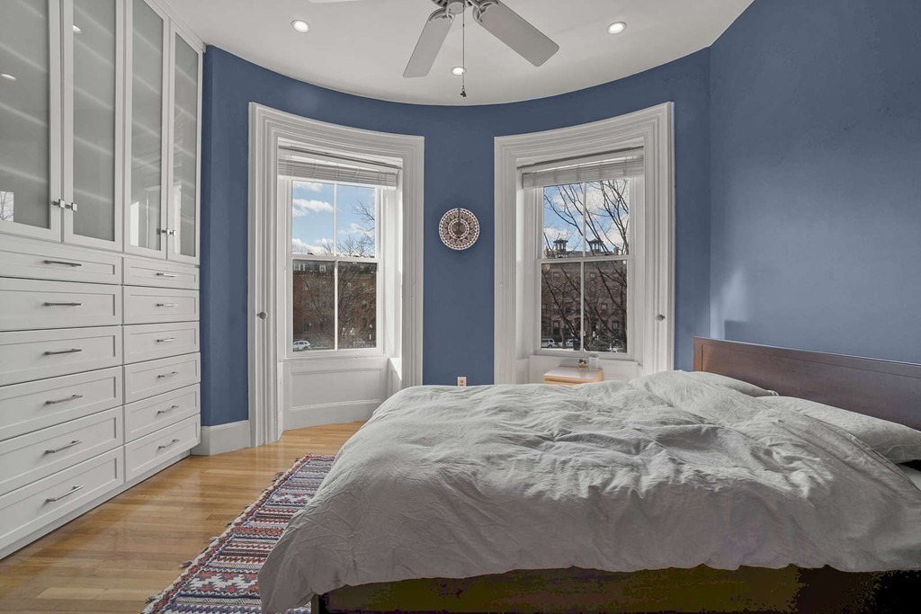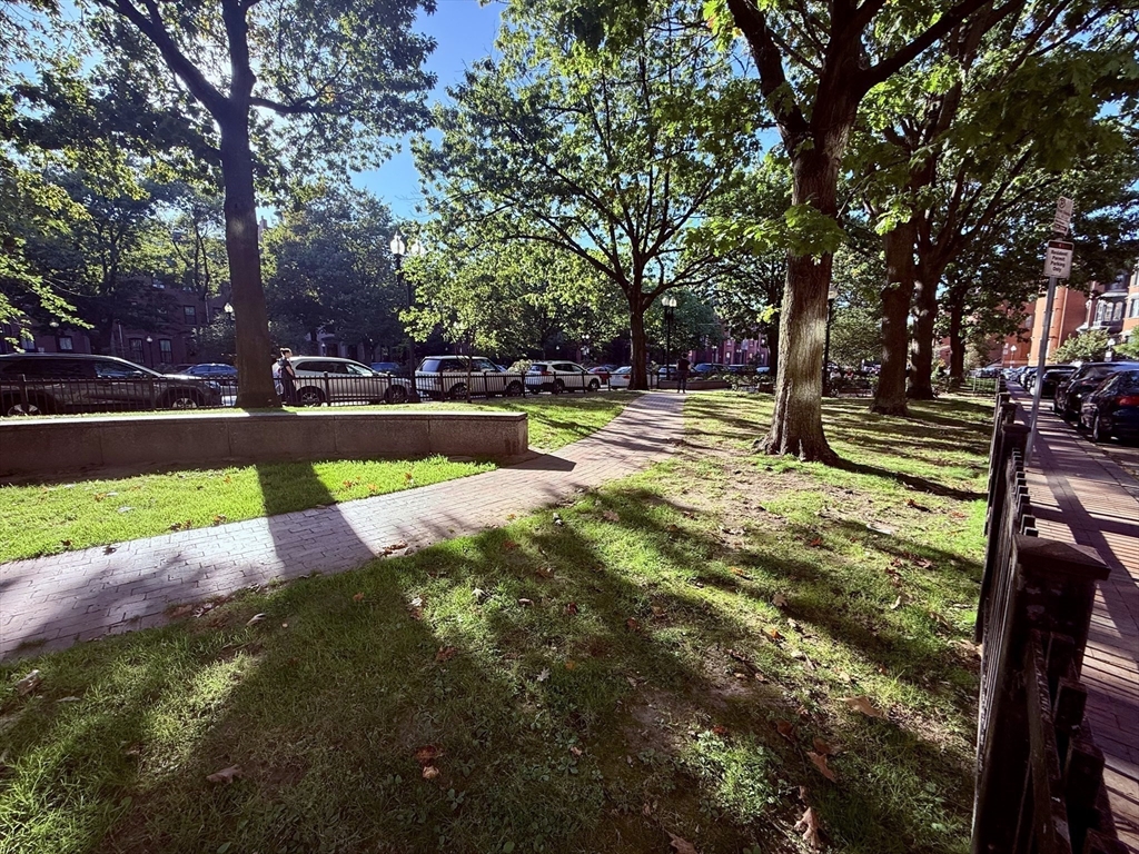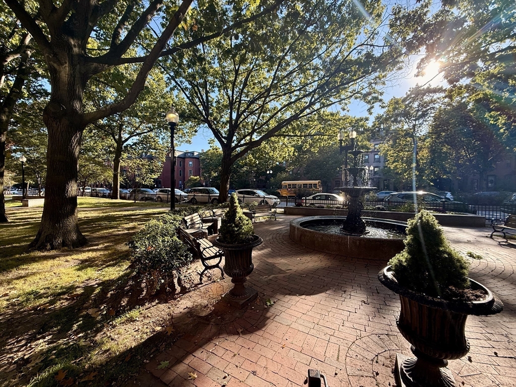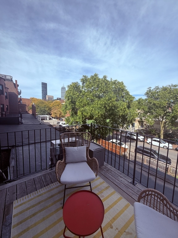 Gorgeous renovated 2 bedroom floor through overlooking Chester Square with a private deck and Back Bay views. Unit is 1 level above parlor with tons of natural light, beautiful hardwood floors and great ceiling height. The renovated kitchen with granite countertops and a breakfast bar opens to the living and dining rooms with a hidden office nook. Tons of storage throughout with custom built-ins and closets. A/C, in-unit laundry, private deck and common back yard, park and city views. No Pets. Available December 1