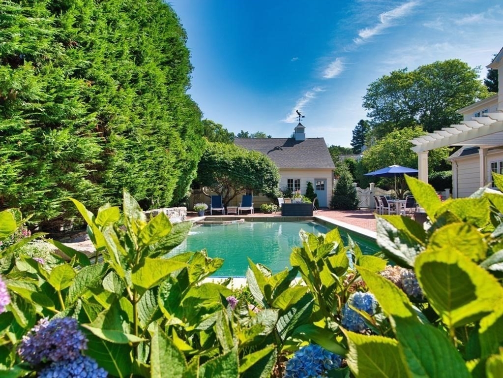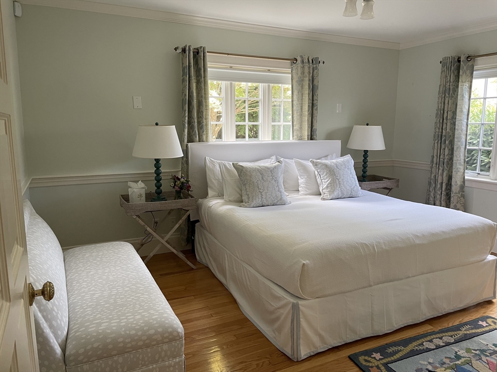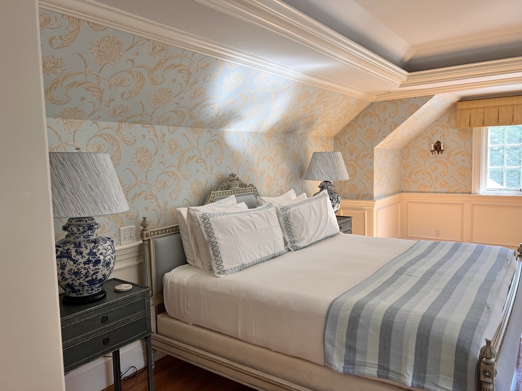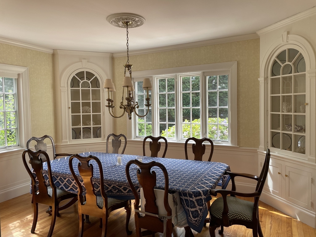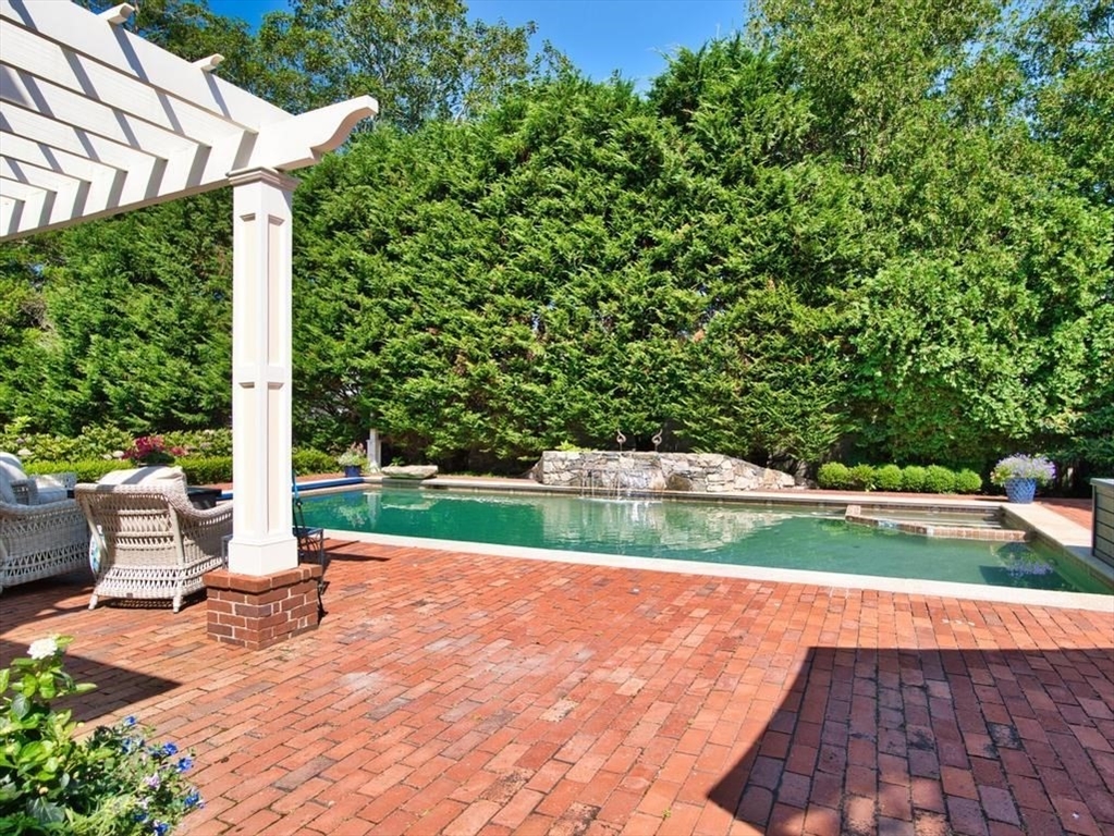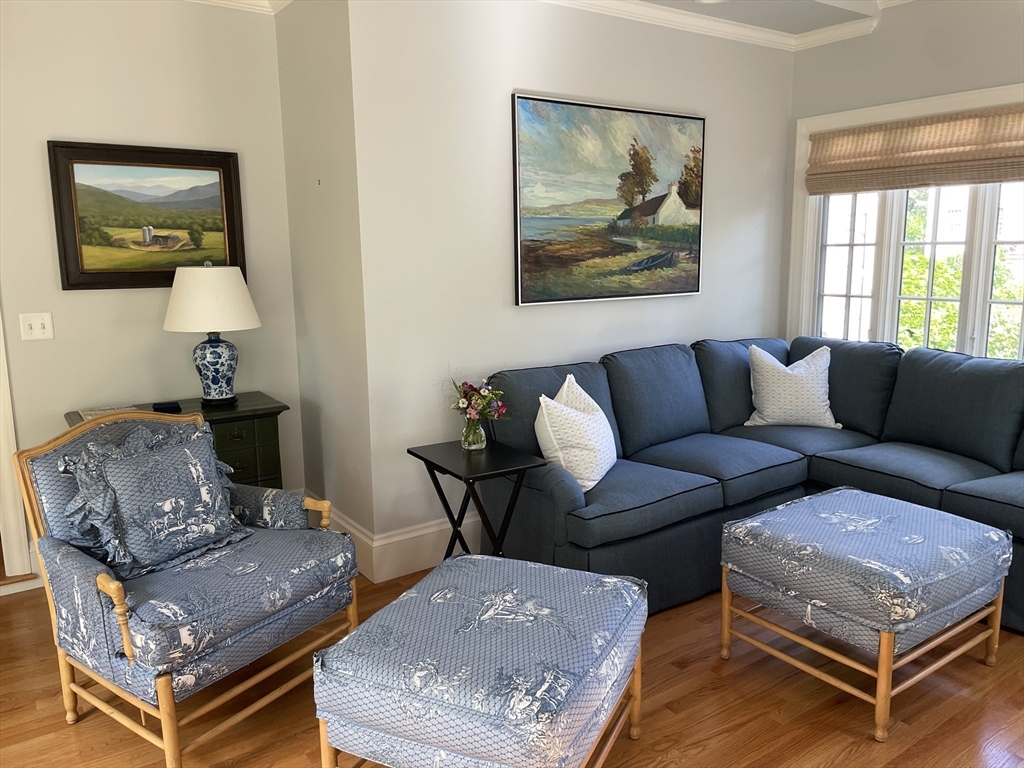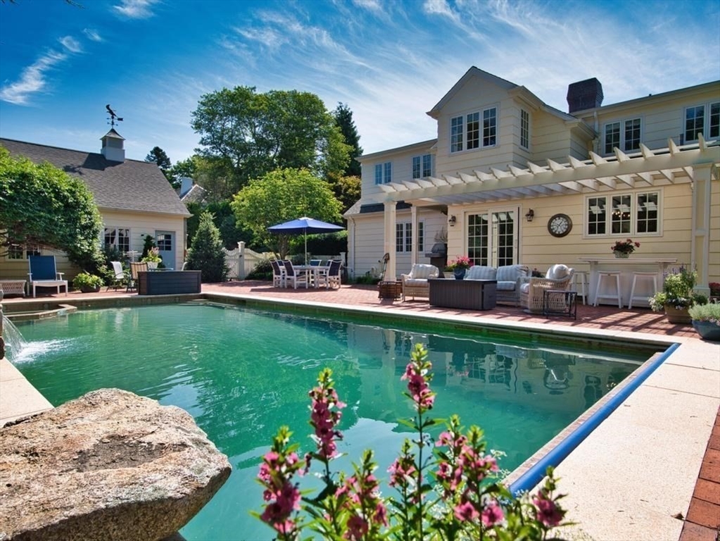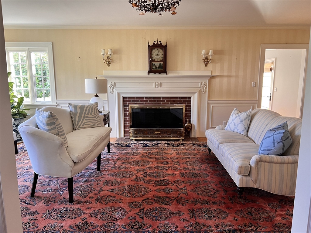 Located just one block from the New Bedford Yacht Club, this spacious and beautifully furnished home offers a rare opportunity to enjoy the off-season in the heart of Padanaram Village. Privately set behind stone walls and a picket fence, the property features professionally landscaped grounds and generous outdoor living spaces. Inside, the home offers a fireplaced living room, den, formal dining room, and a cathedral-ceilinged family room with a second fireplace. The open kitchen features a large island and casual dining area, all flowing out to a pergola-shaded brick terrace overlooking a private backyard and heated pool.The primary suite includes a fireplace, accent lighting, and a luxurious bath with soaking tub. Three additional bedrooms, gleaming hardwood floors, crown moldings, and wainscoting highlight the quality throughout. The finished lower level includes a playroom with fireplace, full bath. Just a short stroll to the harbor, shops, restaurants, and market.
