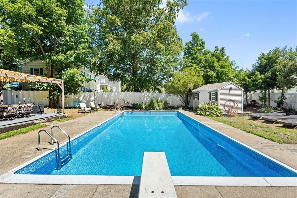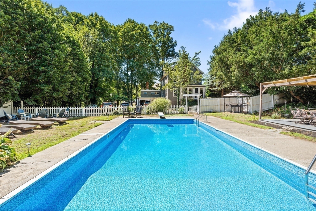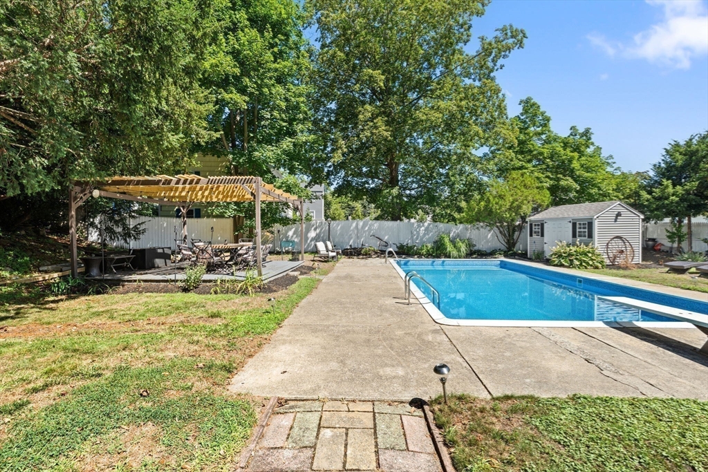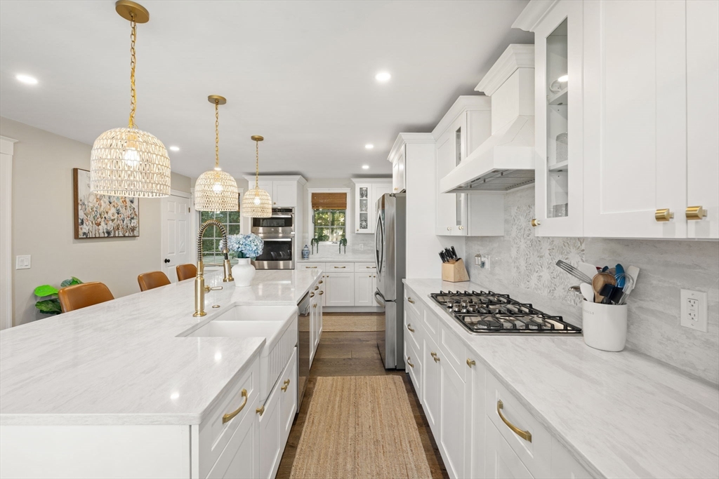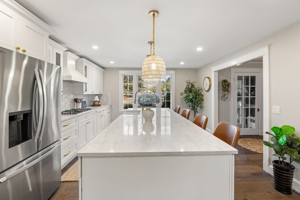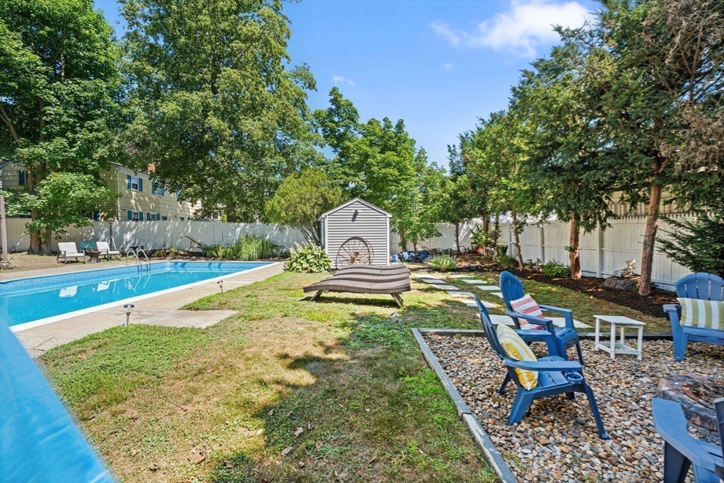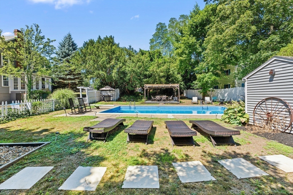 Beautifully maintained and spacious Colonial offering incredible flexibility, including an in-law suite with its own entrance, full kitchen, living room with gas fireplace, bedroom, full bath, and laundry. The main home features four additional bedrooms, two updated baths, a bright living room with pellet stove, and a formal dining room with fireplace. The chef’s kitchen shines with quartzite countertops, stainless steel appliances, gas range, and an oversized island perfect for entertaining. Two sunrooms add light and comfort year round. Upstairs, enjoy a luxurious primary suite with soaking tub, marble walk in shower, and double vanity. Situated on a double lot, the fenced in backyard is your own private oasis—complete with an in ground pool, fire pit, gazebo, and BBQ area—ideal for gatherings or relaxing weekends. Additional highlights include a two-car attached garage, ample parking, and convenient access to shopping, dining, and Routes 128/95