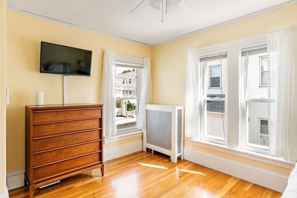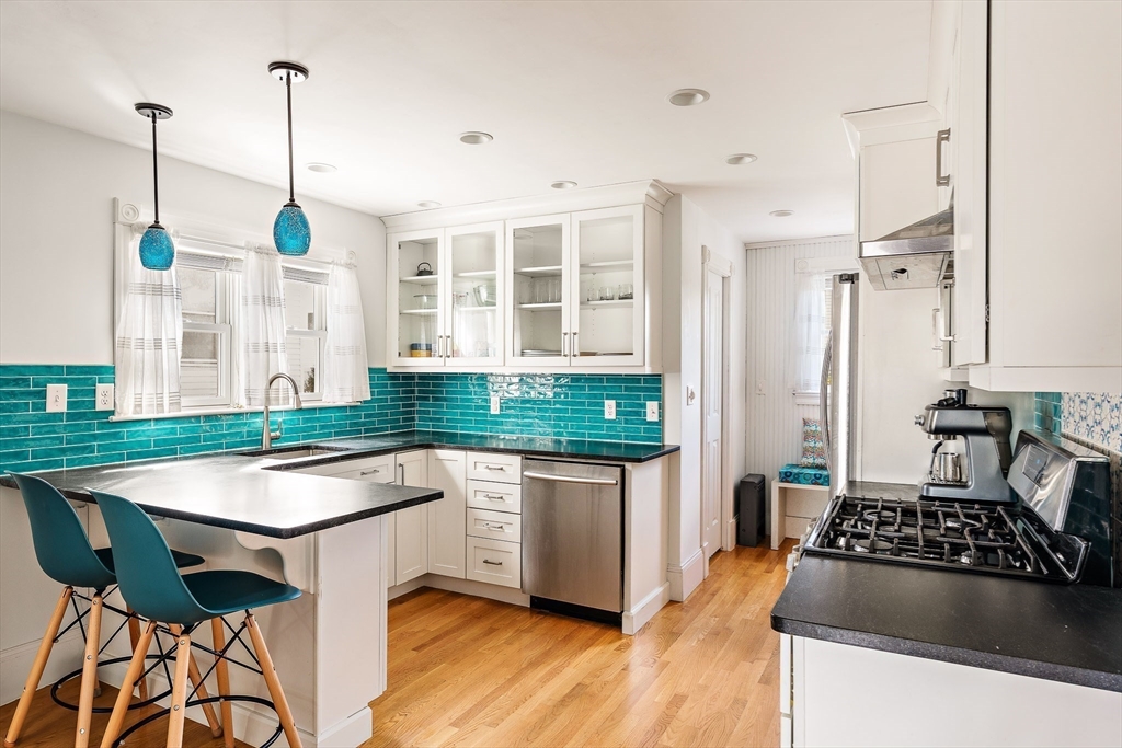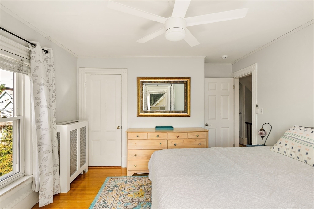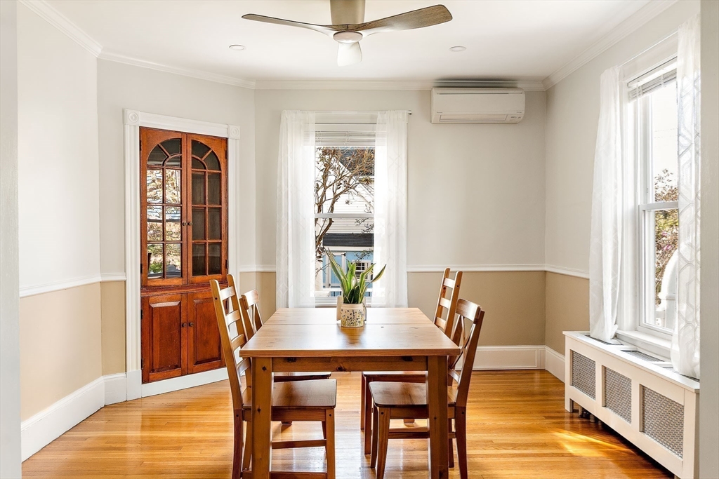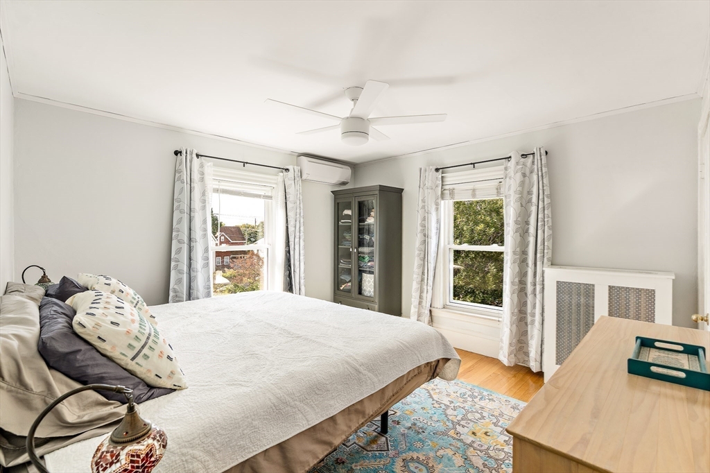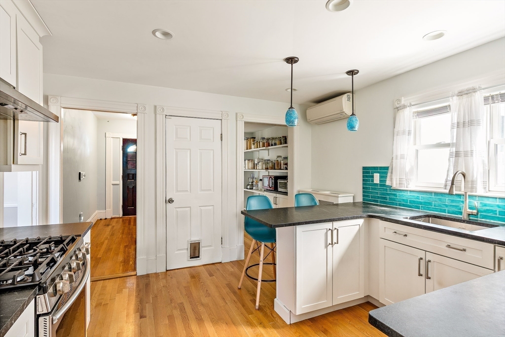 Enjoy suburban comfort & city convenience in 4 bed, 2 bath updated Colonial under a mile from bustling Malden Ctr w/ MBTA Orange line station, bus routes, vibrant dining & shopping! Beautiful hardwd floors, high ceilings, energy saving mini-splits A/C-heat & solar panels. Bright & airy kitchen w/ glass front white cabinetry, stone countertop, peninsula bar seating & gas range w/ exterior vent. Organized walk-in pantry leads to convenient laundry room. Full bath off mud-room. Dining room w/ elegant hutch has open floor plan to living room w/ cozy built-in storage window bench. Enclosed porch bonus space, perfect for office or sitting area. 2nd flr w/ 3 bedrms & full bath. Delightful knotty pine staircase leads up to 3rd flr w/ views of Boston skyline adding 4th bedrm & family room w/ stylish accent walls & built-in shelves. Fenced yard w/ Trex deck, shed, plantings & birdlife is ideal spot for relaxing. Off street parking driveway. Make this well-loved home yours!
