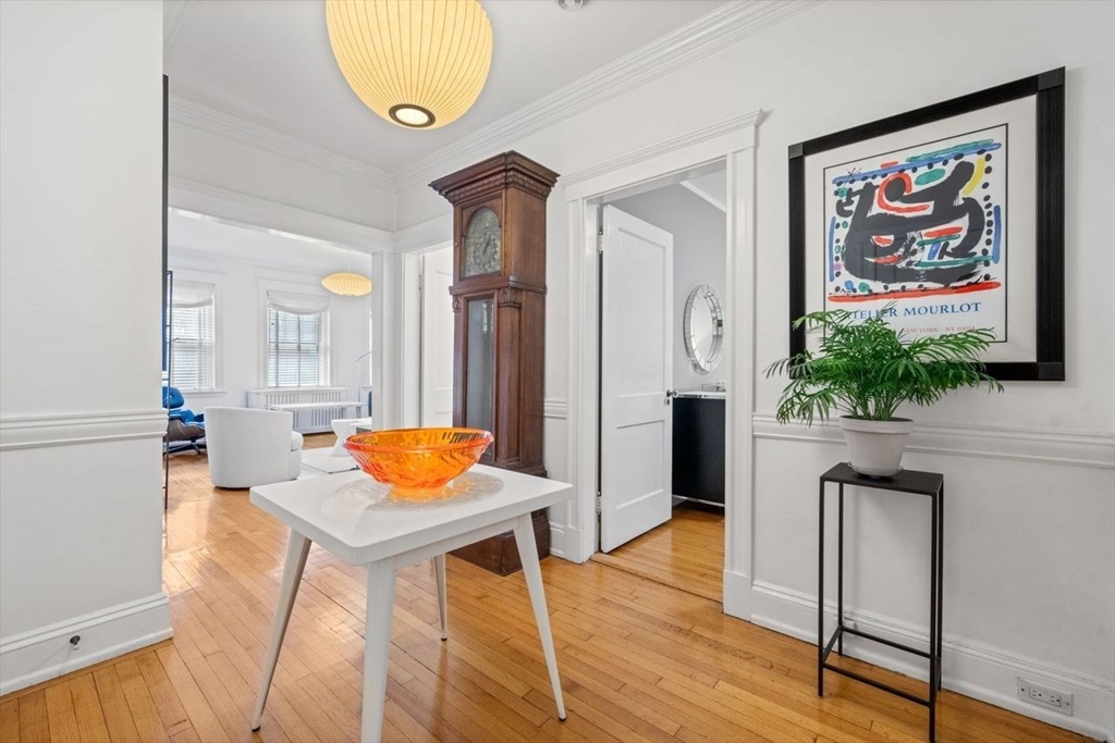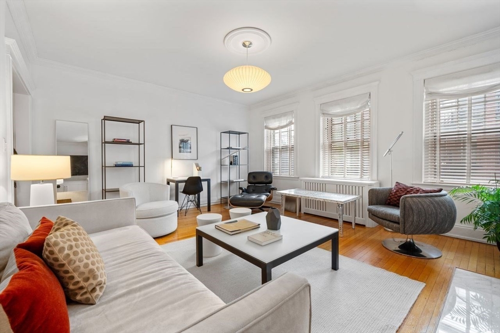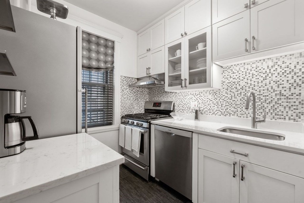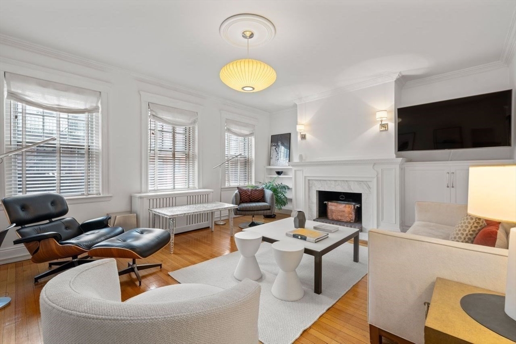 Welcome to 250 Commonwealth Avenue an exceptional Elevator building! This beautifully renovated one bed and one bath home blends timeless Back Bay elegance with modern living! Inside you will find marble flooring, quartz countertops, a marble fireplace, modern lighting, custom window treatments, and a spacious pantry with abundant storage. A flexible layout offers room for both a dining nook and a comfortable work-from-home setup. The rare in-unit washer/dryer ensures ease of living. This professionally managed building features recently updated common areas, a Butterfly entry system, private storage, and a beautifully planted front garden. Residents also enjoy a large shared roof deck with sweeping skyline views—perfect for morning coffee, evening sunsets, or entertaining. Perfectly situated in the heart of Back Bay, this move-in ready residence is ideal as a pied-à-terre or full-time city home!