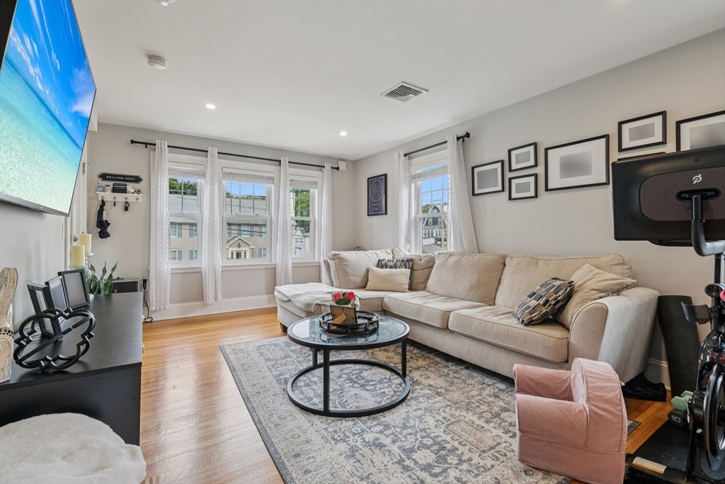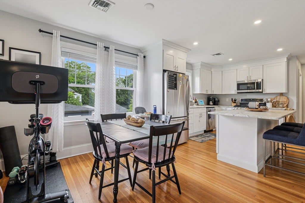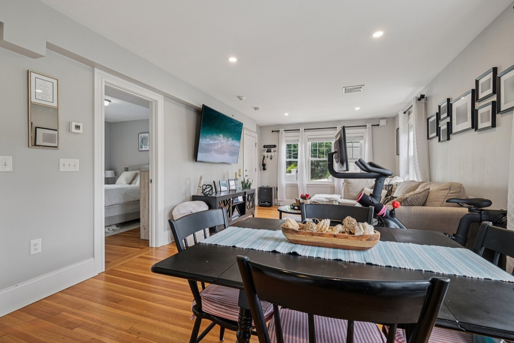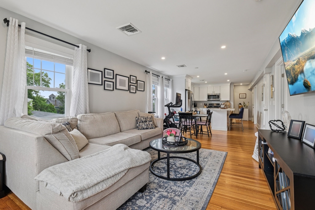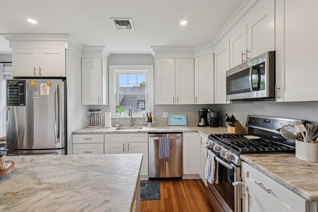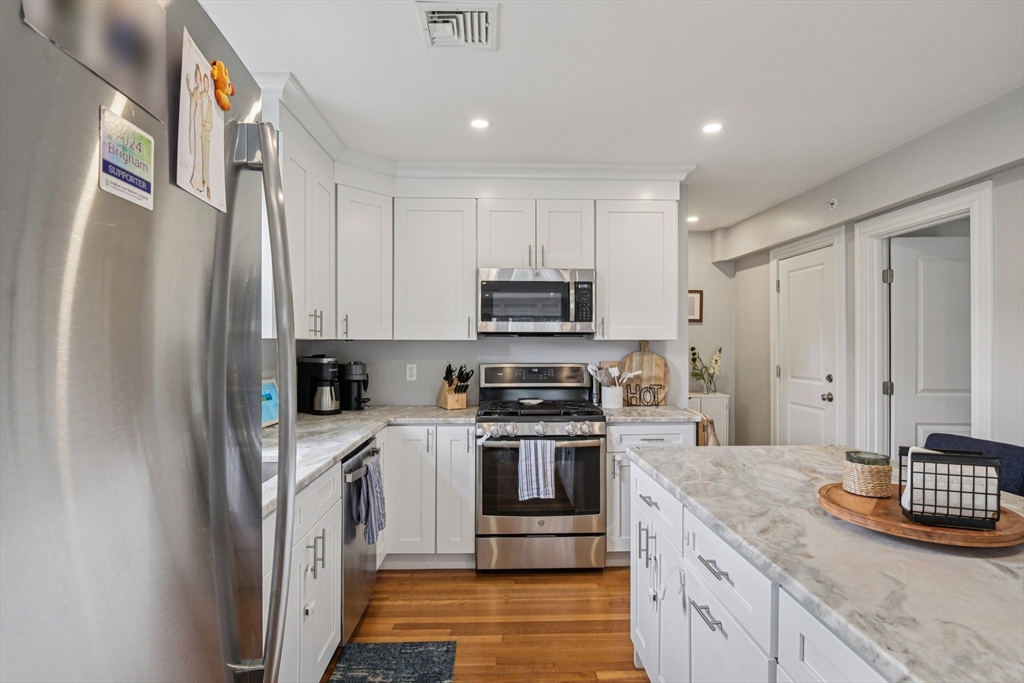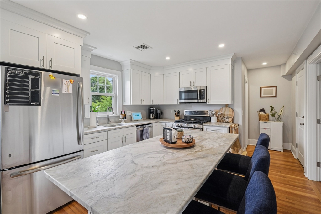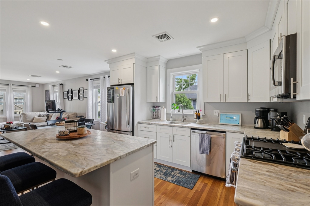 Fully renovated from top to bottom in 2020, this beautiful 2-bedroom, 2-bathroom condo offers the perfect blend of modern comfort and unbeatable convenience. Just steps from the vibrant Lower Mills scene—enjoy local favorites like restaurants, cafes, bakeries, shops, and public transit, all right outside your door. Inside, you'll find an open and airy floor plan featuring a chef’s kitchen with white shaker cabinetry, natural stone countertops, a spacious island, and stainless steel appliances. Both bedrooms are generously sized, and the bathrooms are sleek & modern. Enjoy hardwood floors throughout, in-unit laundry, garage parking with one additional spot, and dedicated basement storage. This home was completely gutted and rebuilt—everything is 5 years young, including the roof, windows, electrical, plumbing, siding, heating, and central air. Located in one of Dorchester’s most sought-after neighborhoods, this is city living at its best! Pets allowed!