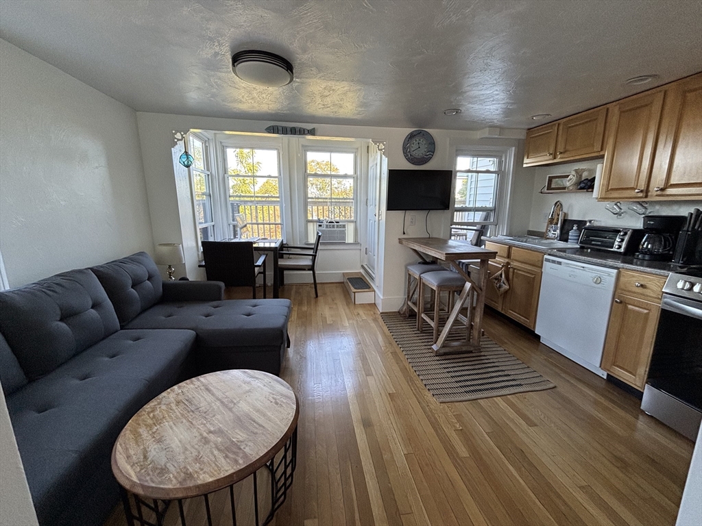 Charming one bedroom condo located close to historic downtown Plymouth & Long Beach. Beautiful hardwood floors throughout. Lots of windows to let the sun shine in & view the ocean from. Relax outside on the deck while enjoying the ocean view and the beautifully landscaped grounds. Kitchen, living room & nook all open. Conveniently located to shops, restaurants, beach, library, hospital & highway. Storage & washer/dryer in basement.