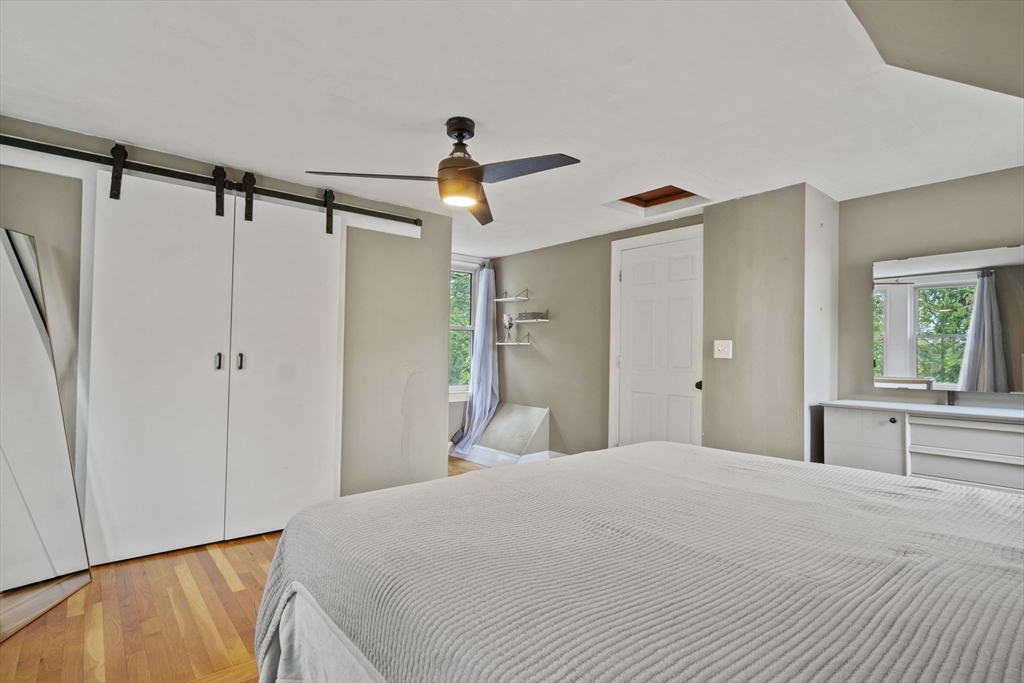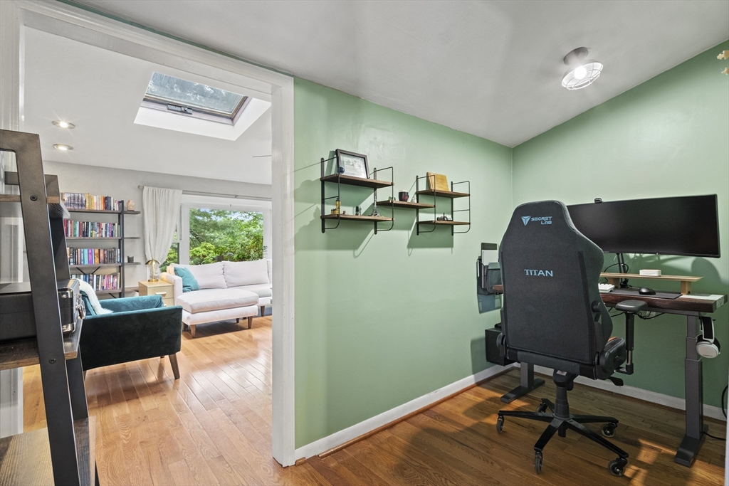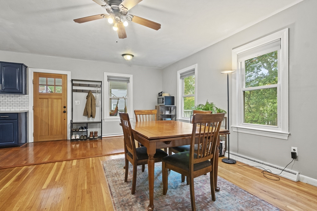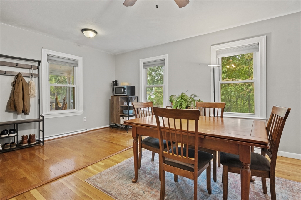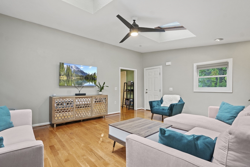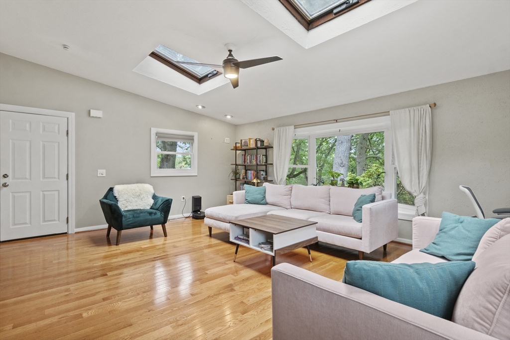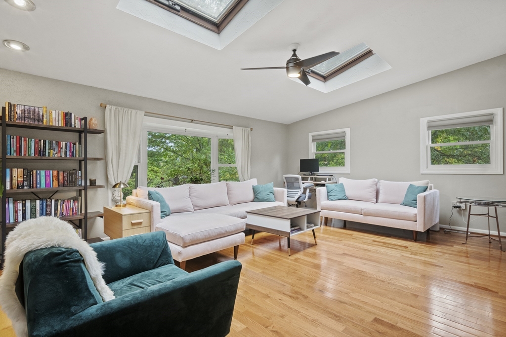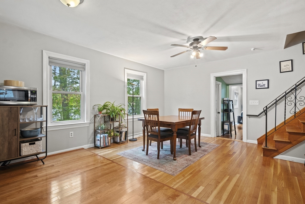 Charming Colonial in a quiet dead-end street setting with pond views. This 2-bedroom, 2-bath home offers over 1,300 sq ft of living space featuring hardwood floors throughout. The spacious living room is filled with natural light, accented by skylights, recessed lighting, and exterior access. An open dining area flows into the kitchen, perfect for entertaining. Upstairs, the oversized main bedroom includes custom built-ins, while the second bedroom provides comfort and versatility. A finished bath with shower is located in the walk-out basement, along with laundry hookups and plenty of storage potential. Enjoy relaxing on the screened porch, take in the fenced yard, or utilize the storage shed for convenience. With central air, off-street parking, and easy access to shopping, schools, transportation, and major routes, this home combines comfort, character, and convenience. No Showings Until the Open House!