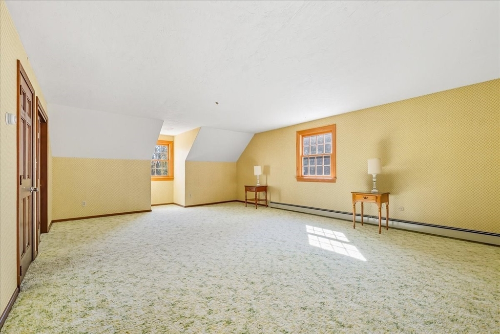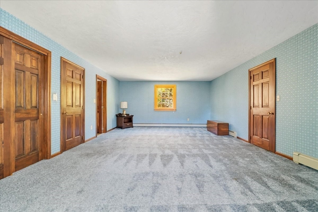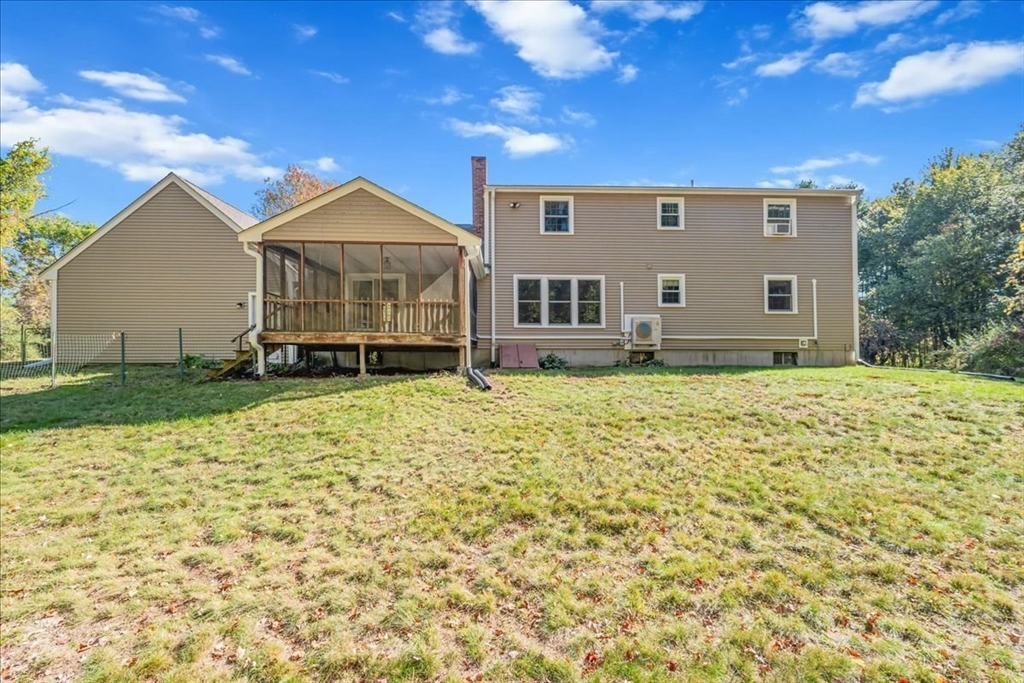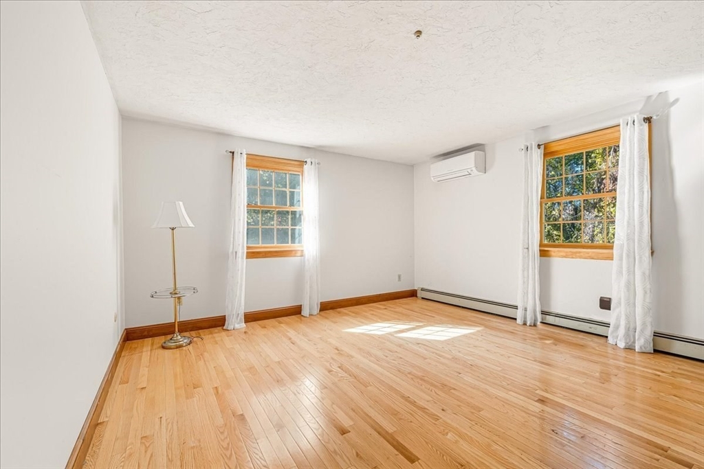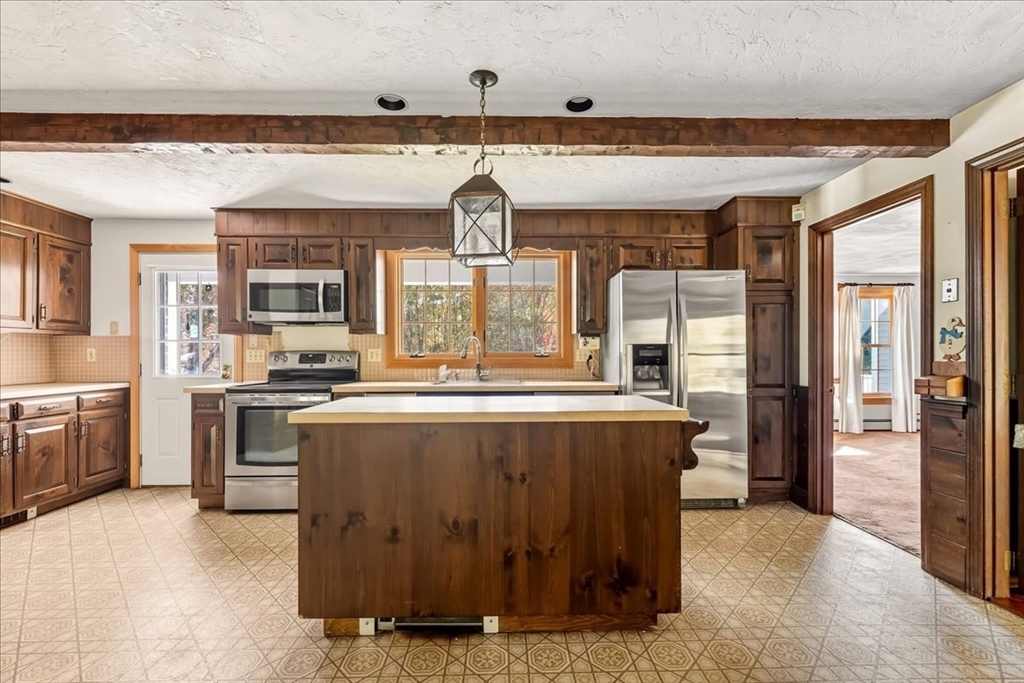 Custom Cape set on a picturesque 2.61-acre lot along a scenic country road with 474 feet of frontage. The first-floor primary suite offers hardwood floors and private bath with tiled flooring. A formal living room with fireplace and brick hearth offers abundant natural light opening to a large formal dining room. The family room features cherry hardwood flooring, a brick fireplace, beamed ceiling, and wainscoting. The spacious kitchen boasts a fireplace, center island, walk-in pantry, laundry area, and slider to a screened porch overlooking a private wooded lot. Upstairs features two generous bedrooms with a Jack & Jill full bath. The huge unfinished lower level includes a versatile additional room, once a professional woodshop. Relax with your morning coffee on the front farmer’s porch with fabulous views of towering pines. Two car attached garage. Town Water. Award-winning school district with language immersion. Close to Oak Grove Farm and ~4 miles to the commuter rail.