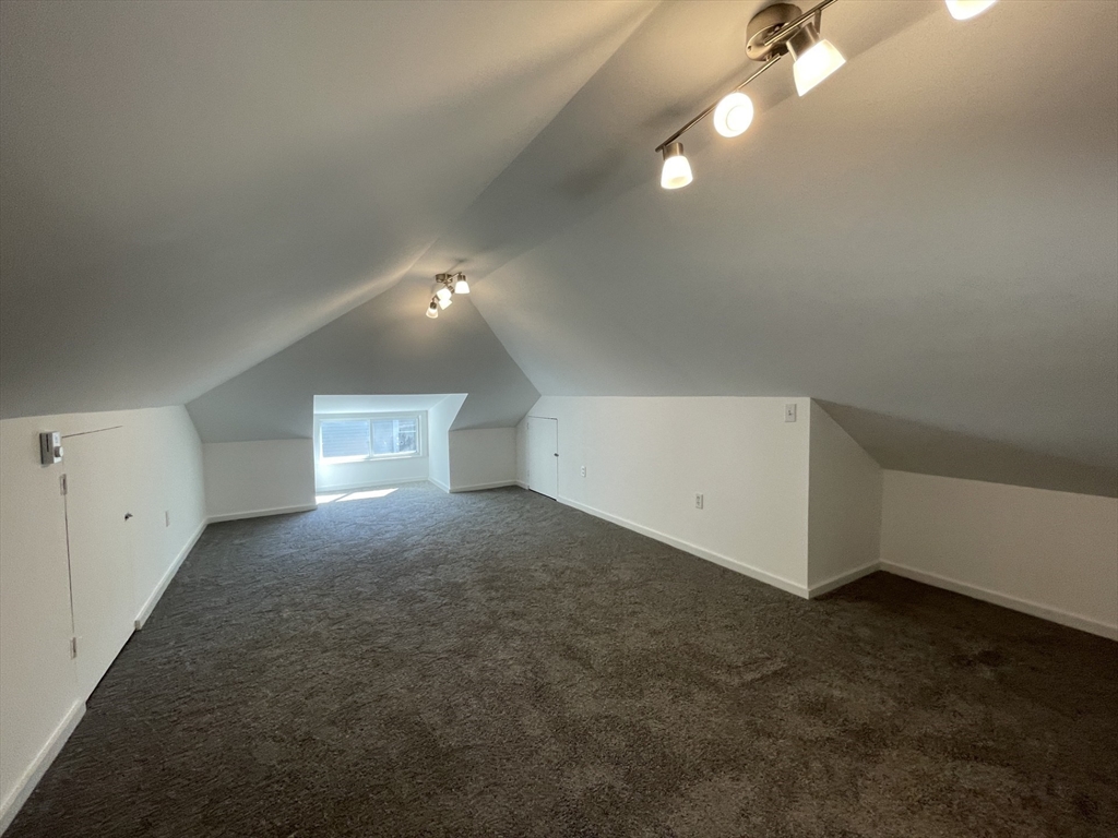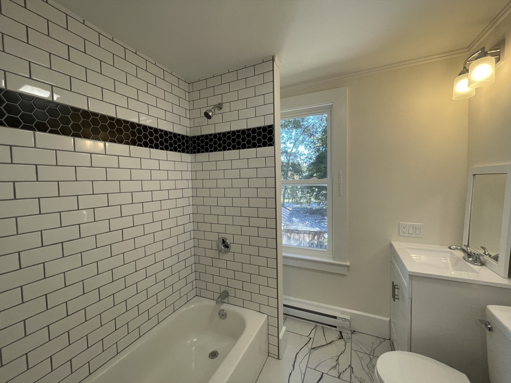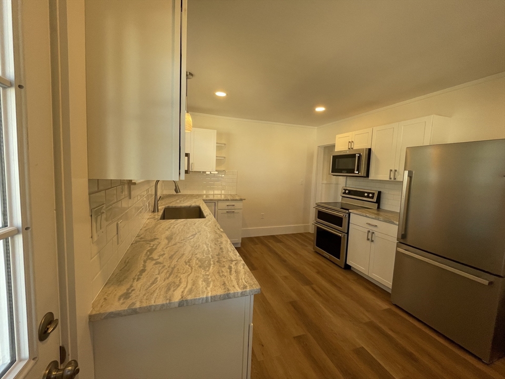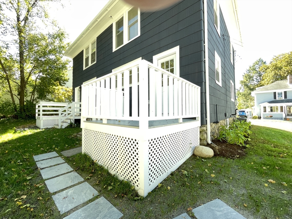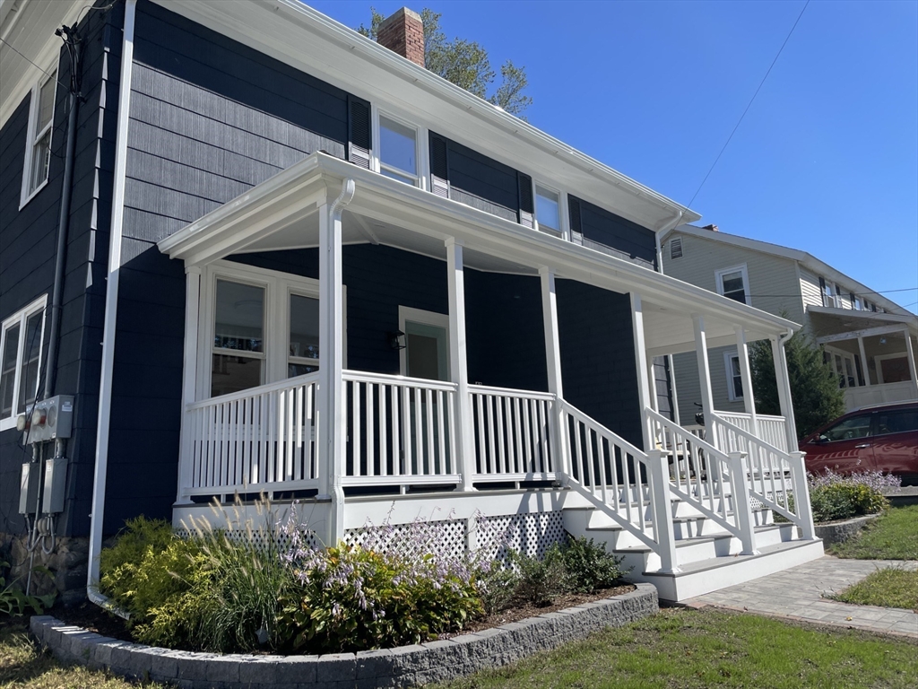 Beautifully renovated 1/2 duplex located in Maynard’s Presidential neighborhood. Brand new kitchen with white cabinetry, stainless appliances, recessed lighting and access to rear deck. Wonderful high ceilings, beautiful birch flooring throughout, and all freshly painted. Upstairs, 2 bedrooms plus a 3rd floor bonus room, and a gorgeous full bath. The full unfinished basement offers wonderful storage space. Covered front porch, rear deck, and a detached 2 car garage. Tenant to pay First, Security and Utilities. Excellent Credit and References. No smoking. This gem won’t last!