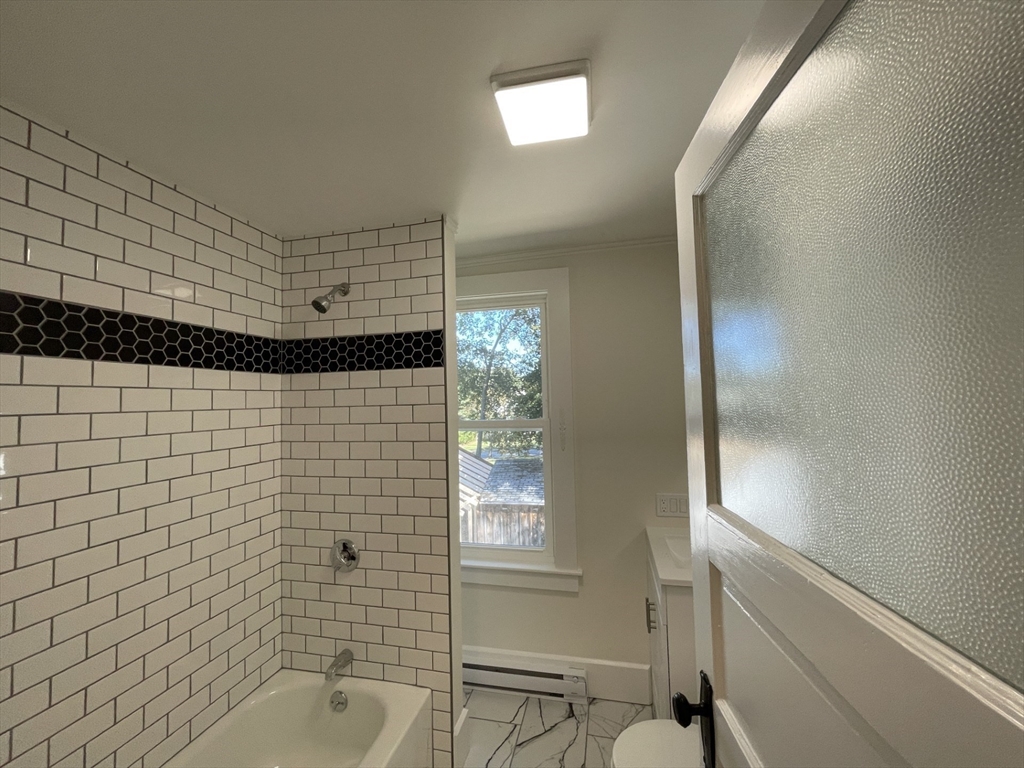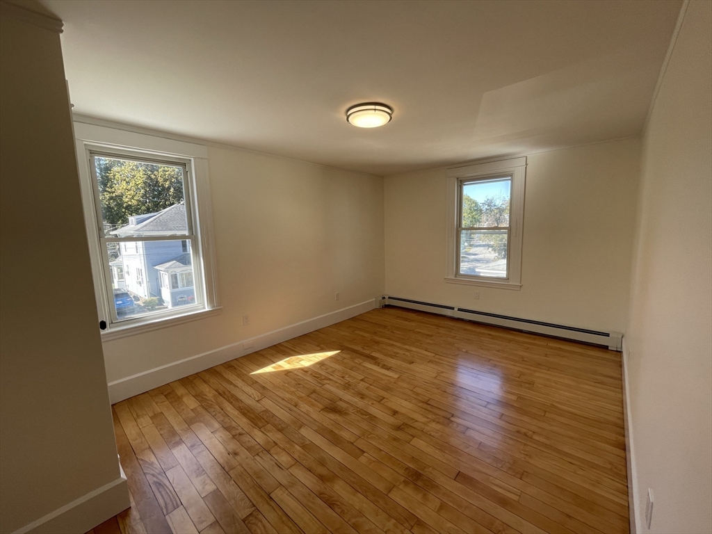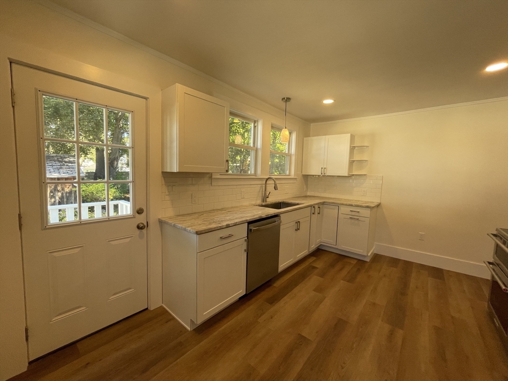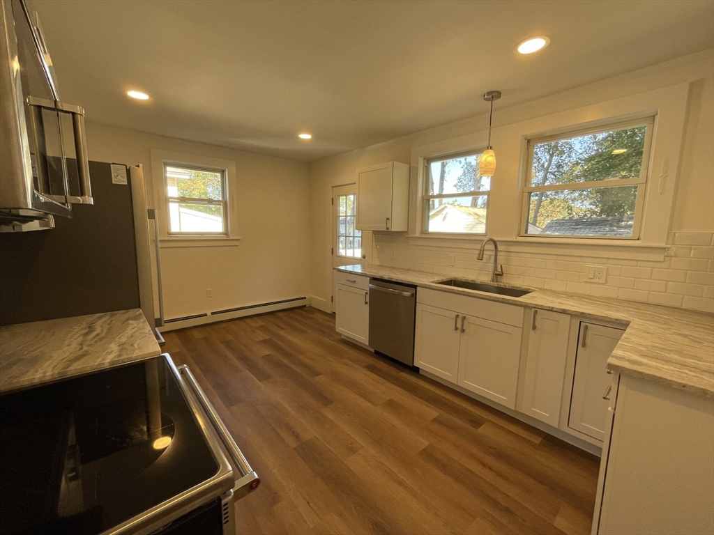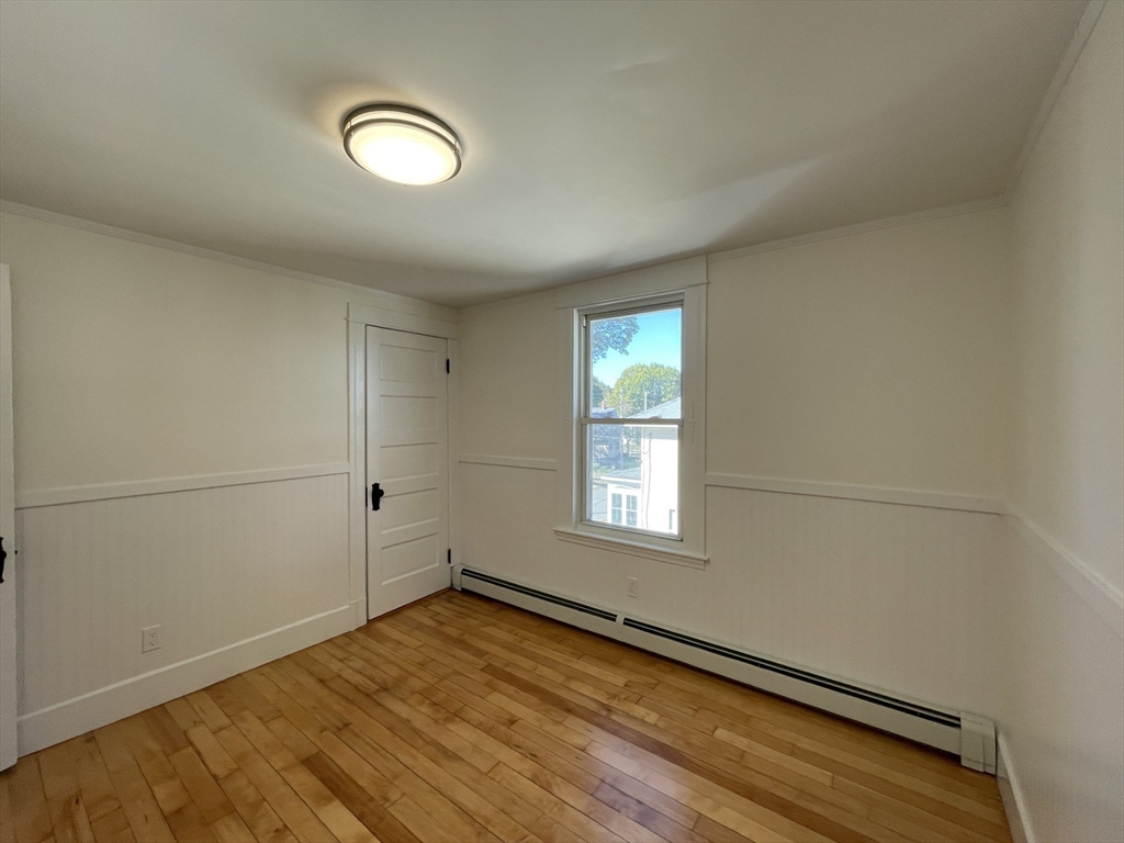 Beautifully renovated 1/2 duplex located in Maynard’s Presidential neighborhood. Brand new kitchen with white cabinetry, stainless appliances, recessed lighting and access to rear deck. Wonderful high ceilings, beautiful birch flooring throughout, and all freshly painted. Upstairs, 2 bedrooms plus a 3rd floor bonus room, and a gorgeous full bath. The full unfinished basement offers wonderful storage space. Covered front porch, rear deck, and a detached 2 car garage. Tenant to pay First, Security and Utilities. Excellent Credit and References. No smoking. This gem won’t last!