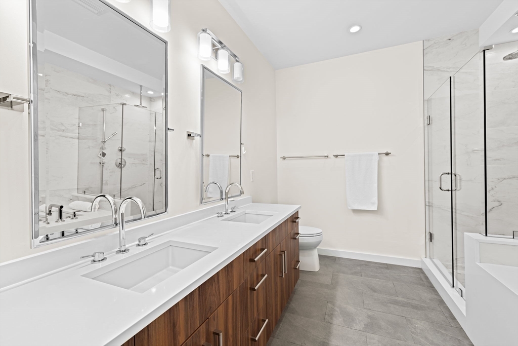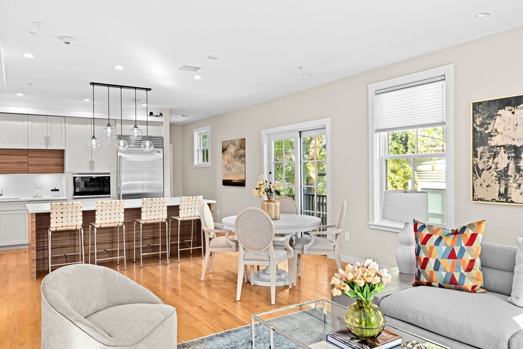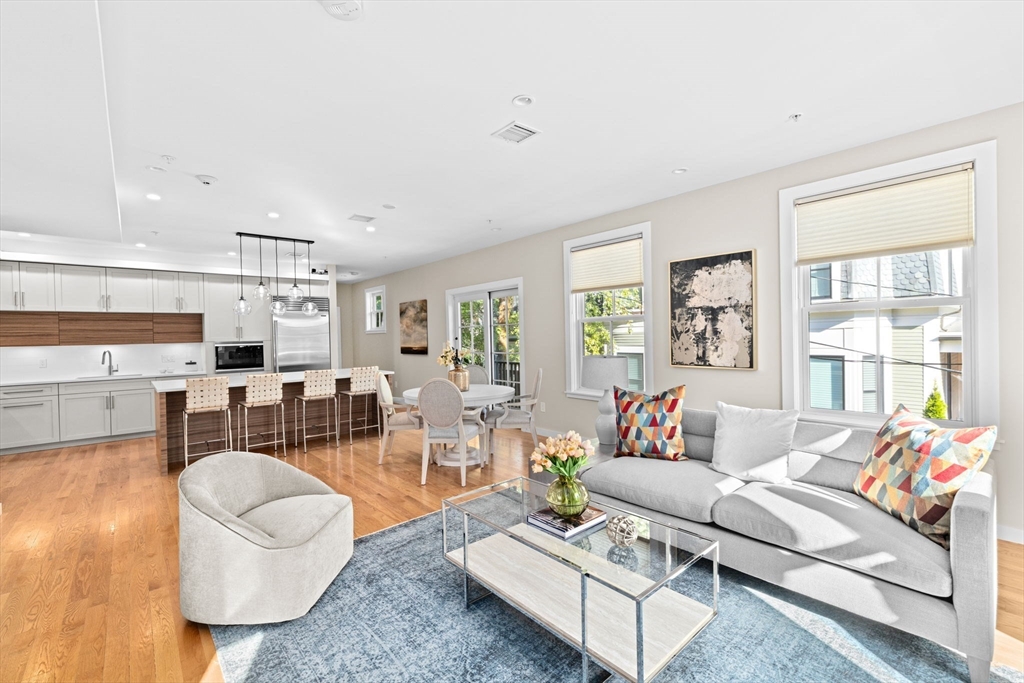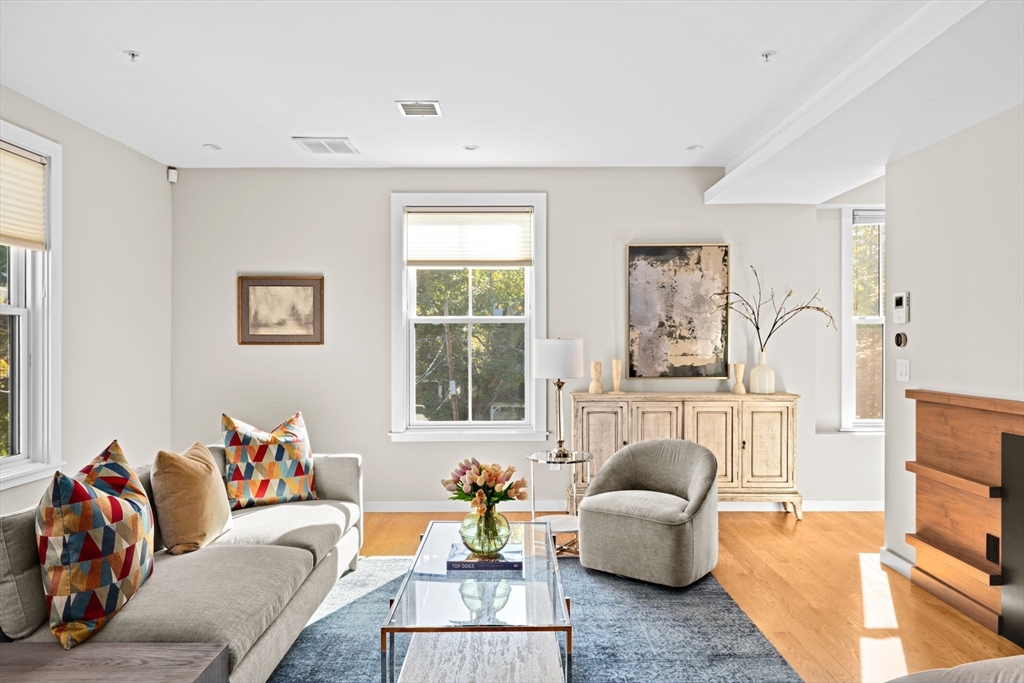 Nestled between the charming enclaves of Brookline Village & Coolidge Corner is this gorgeous newer construction (2019) duplex condo with 3+ bedrooms & 3.5 baths. This residence exudes sophistication with its 2,070 square feet of thoughtfully designed space & high ceilings. The heart of this home is the stunning open kitchen, boasting top-of-the-line stainless steel appliances, an expansive island & seamless flow into the family room, complete with a gas fireplace & oversized windows that invite natural light leading to a deck. Comfort meets style in the serene primary suite featuring a walk-in closet, an indulgent full bath with a soaking tub & a glass-enclosed shower. The 2nd level reveals an ensuite bedroom, an add'l bedroom & a versatile full bath connected to an office or optional bedroom with deck access. Add'l conveniences include in-unit laundry, central air & 2 parking spaces. Just minutes to parks, the Green Line, Longwood Medical, top-rated schools, shops and restaurants!