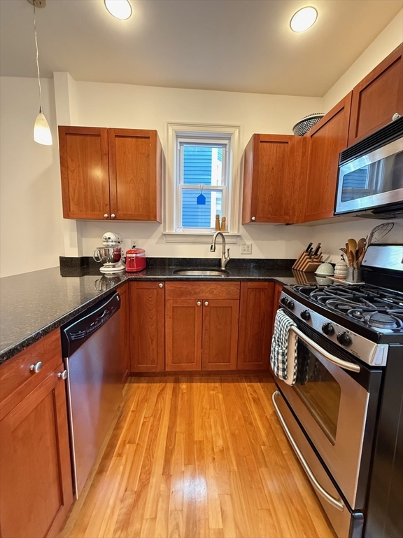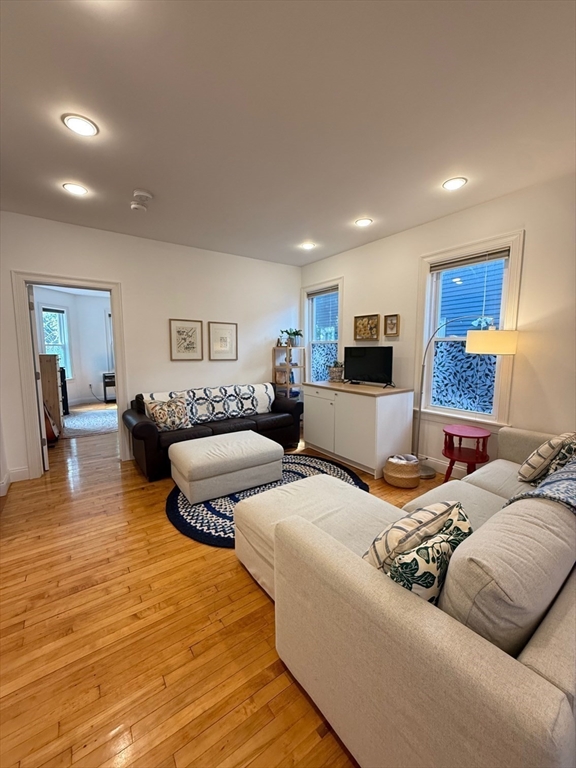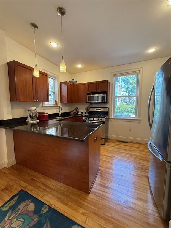 Located just steps away from popular destinations like Savenor's Market, Wine & Cheese Cask, and Broadsheet Coffee Roasters, this sleek one-bedroom condo boasts a prime location with easy access to both Harvard Red Line T. The unit has a well-designed floor plan, beginning with a spacious coat closet in the entryway that leads to the open-concept living, dining, and kitchen area featuring wood floors, ample natural light from large windows, and impressive ceiling height. The kitchen is equipped with high-end cherry cabinetry, granite counters, and stainless steel appliances. The expansive bathroom features a tiled tub/shower and cherry vanity, while the bedroom features a comfortable layout with a bay window and a double closet. Convenient in-unit laundry and central air complete this delightful living experience.