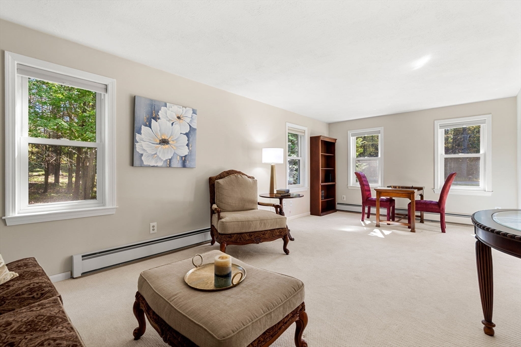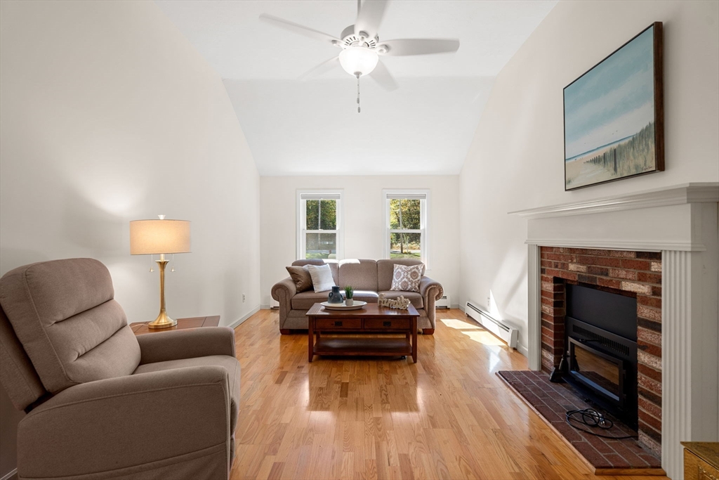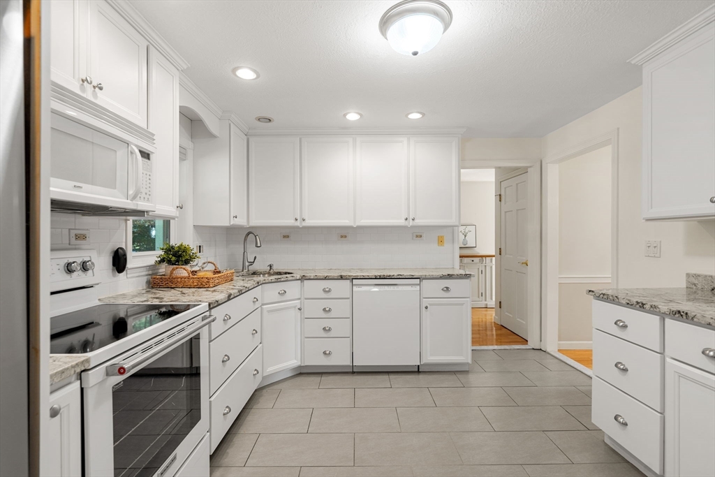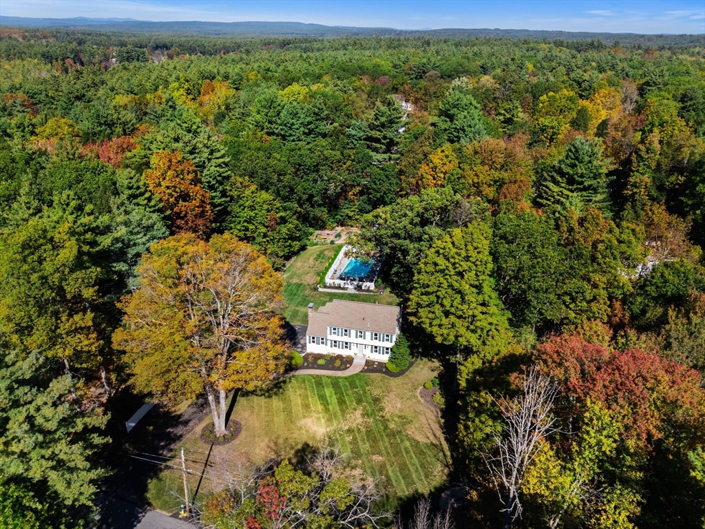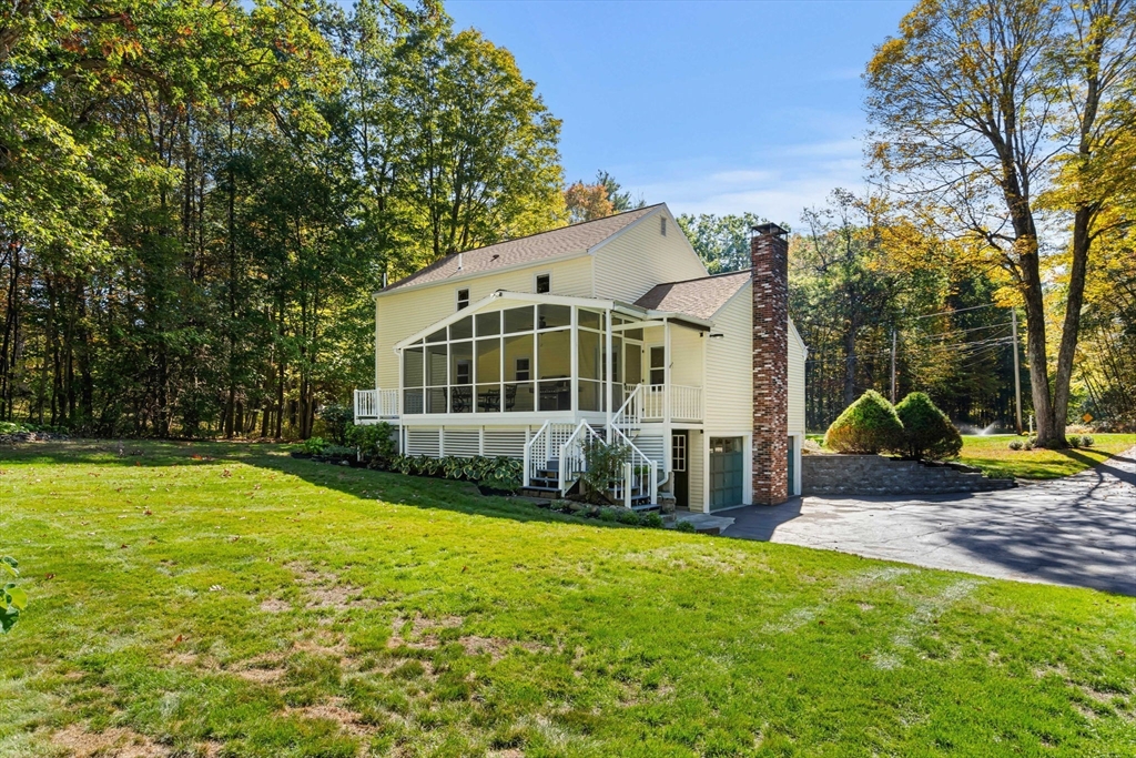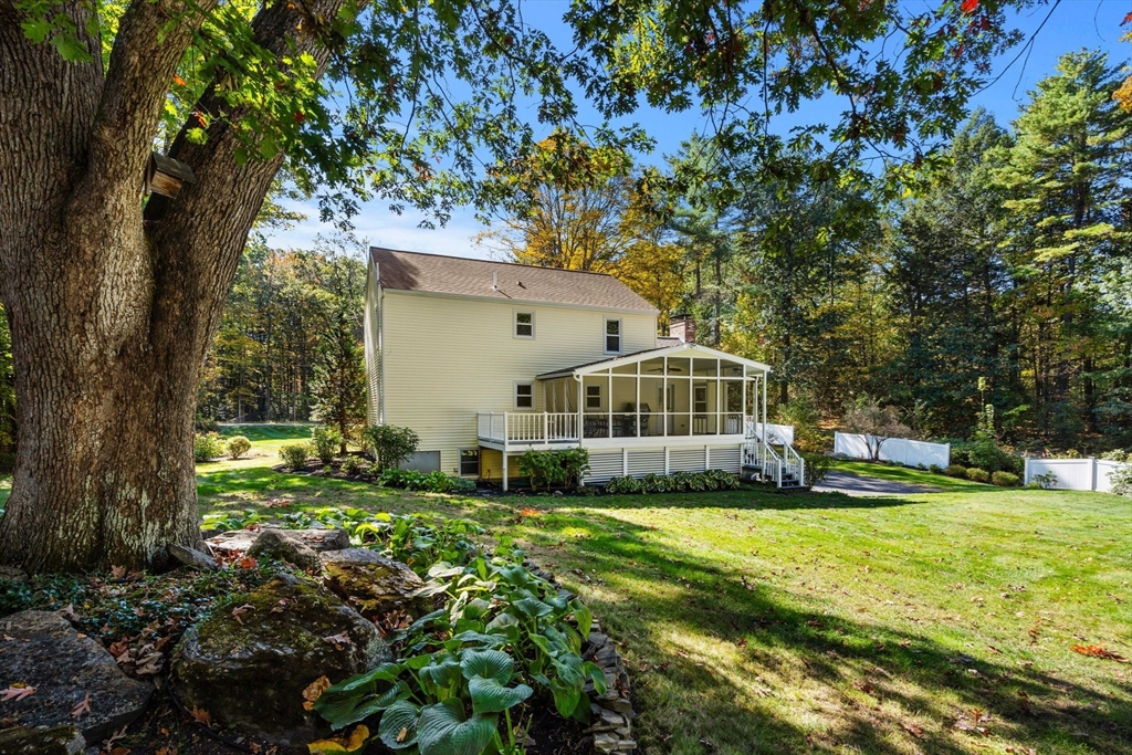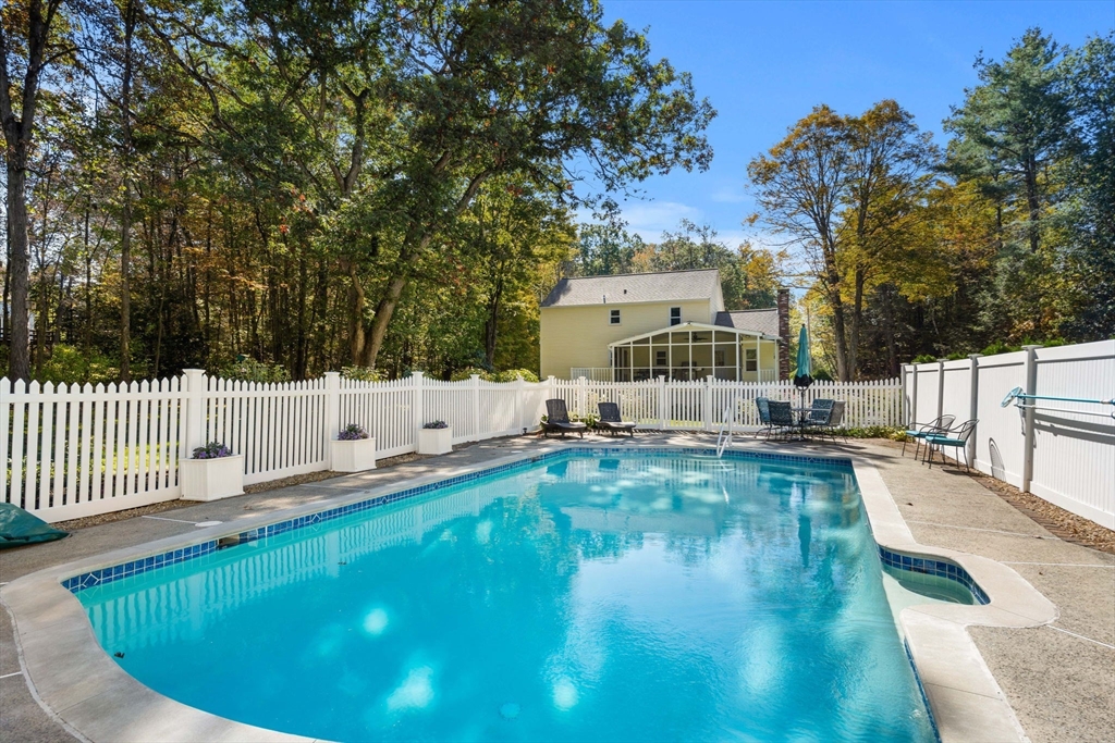 Beautifully maintained 4-bedroom, 2.5-bath Colonial set on gorgeous grounds with mature plantings, in-ground gunite pool, and an estate-like feel. The sun-filled first floor flows beautifully with a spacious front-to-back living room, a formal dining room with hardwood floors and chair rail, and an updated kitchen featuring custom white cabinetry and granite counters. A front-to-back family room with fireplace opens to the screened porch and deck, overlooking the stunning yard. A half bath and laundry room with built-ins complete the main level. Upstairs are four bedrooms and two full baths with tile floors and granite vanities. The primary suite offers hardwood floors and a private bath. Exterior highlights include a two-car garage plus a small third bay—perfect for a motorcycle or hobbies—along with sheds, a deck, and lush front and rear green space. With public water and sewer and a central Pepperell location, 19 Sartelle Street is a wonderful place to call home.