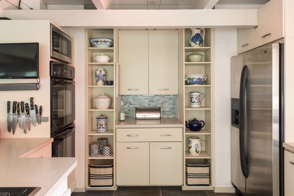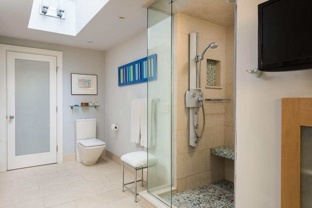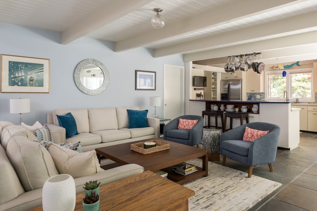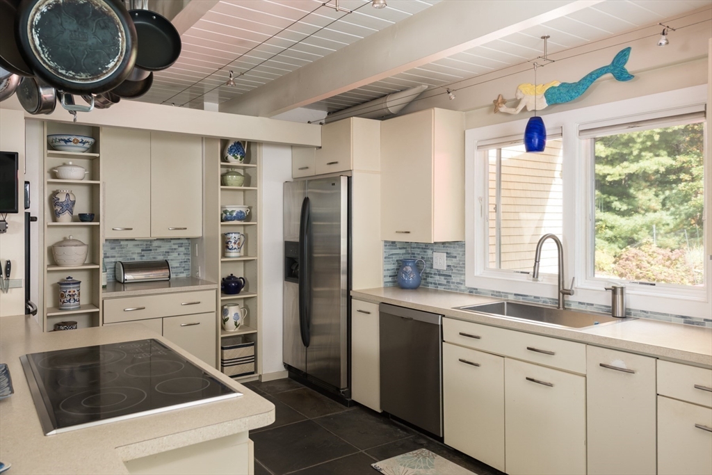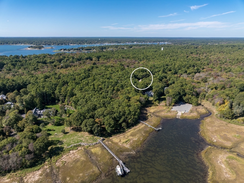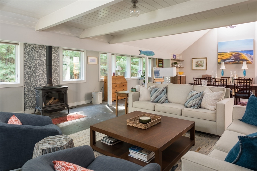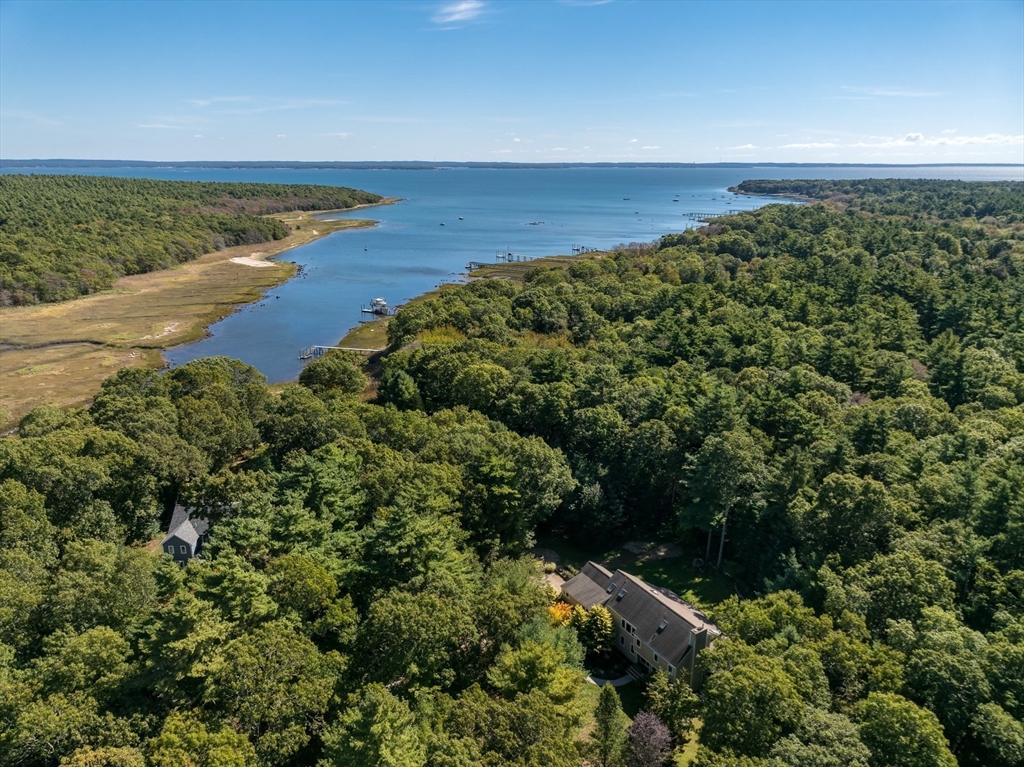 Discover this exceptional Contemporary home, privately situated on 2.25 acres in a premier Marion neighborhood, steps to Wings Cove Landing and the Stone Estate. This 4-bedroom, 4-bath residence offers a seamless open floor plan, featuring a cathedral room inside the front door that contains the dining area, a cozy wood stove in the living room, a kitchen with a breakfast nook, and a fireplace-detailed den. A first-floor bedroom with direct bath access provides convenience. The primary suite is a true retreat with a large walk-in closet and a luxurious bath featuring a soaking tub, steam shower, double vanities, and a heated floor. Relax on the screened porch overlooking the yard with its fire pit and outdoor shower. A separate converted carriage house offers potential for a one-bedroom, one-bath apartment, entertainment room, and workshop; note that a special permit is required and does not convey with the property. Your private South Coast oasis awaits.