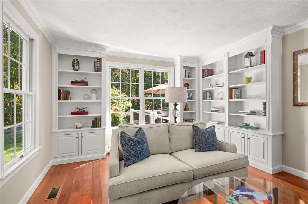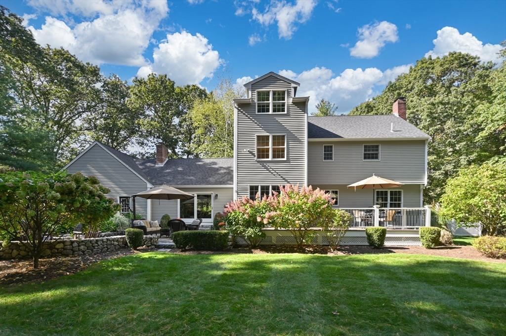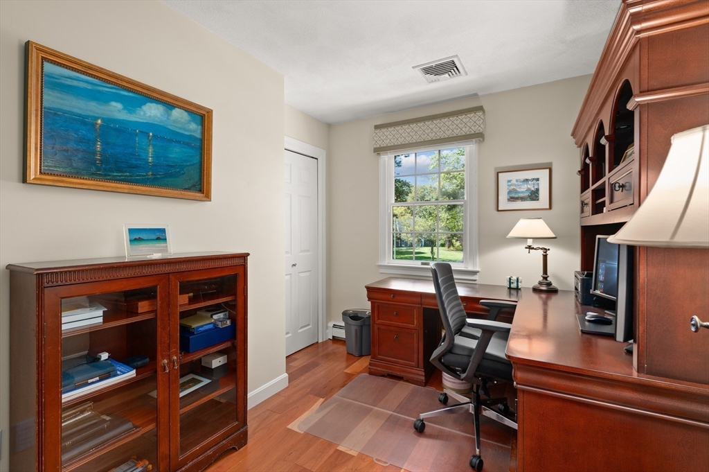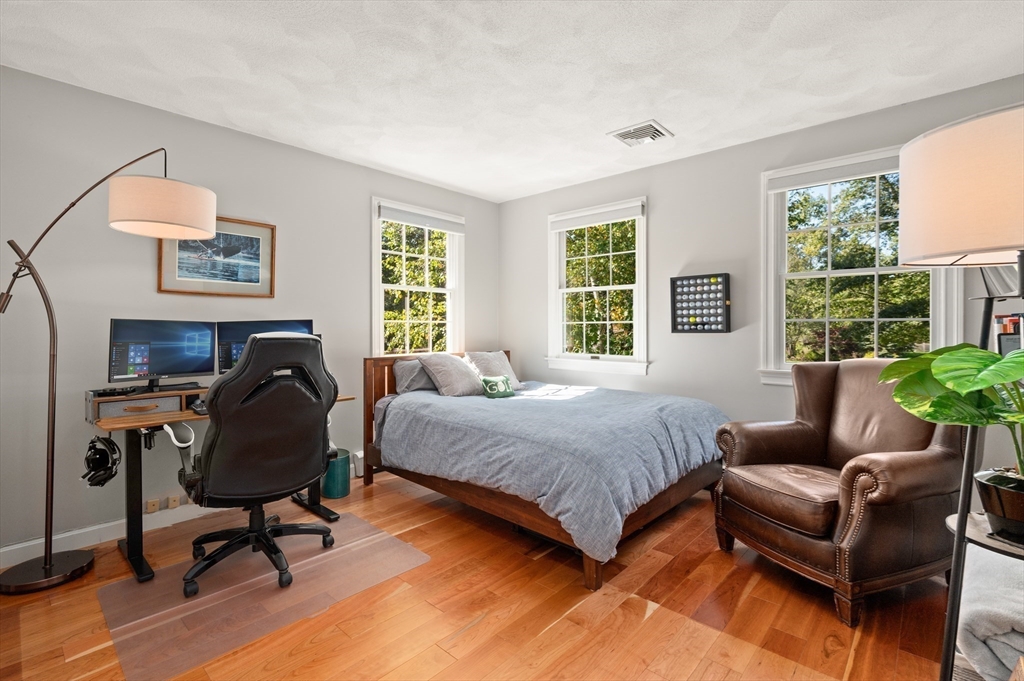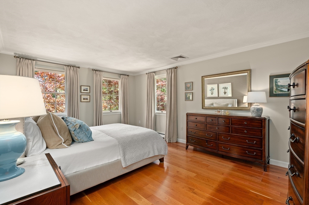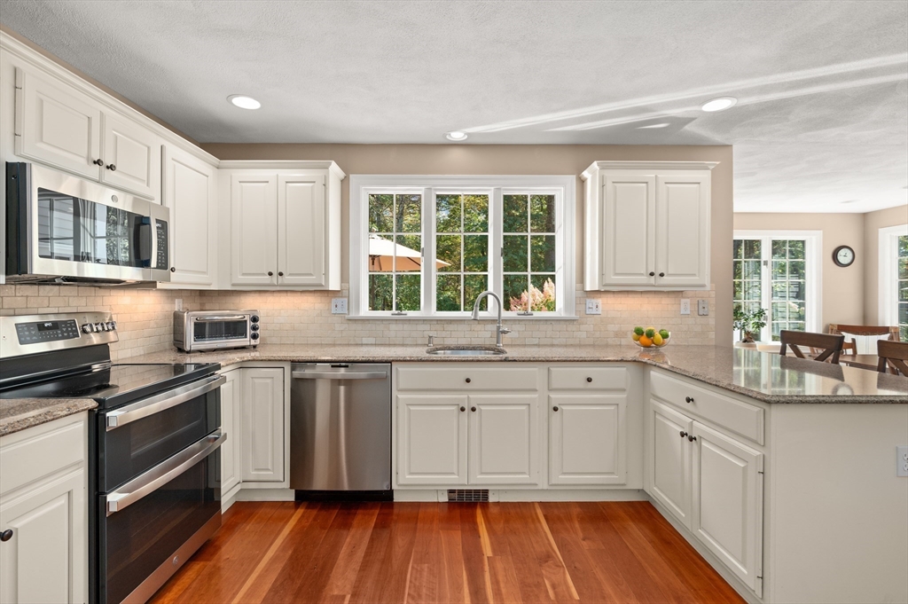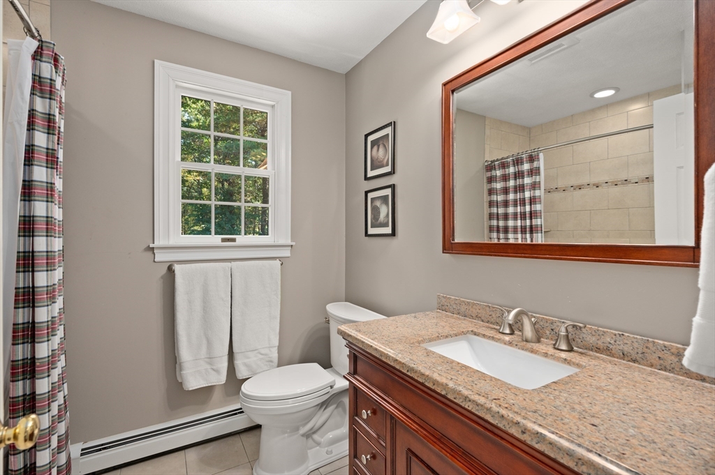 A rare offering in Castle Estates! This meticulously maintained center-entrance Colonial has been proudly cared for by its original owners. With over 3,400 sq. ft. of living space, this home offers 4 bedrooms plus a private au pair/guest bedroom and 3.5 baths. The sun-filled, oversize eat-in kitchen opens to a cathedral-ceiling family room with fireplace and views of the professionally landscaped private backyard. Formal dining room and living room with custom built-ins and 2nd fireplace. Cherry hardwood throughout first and second floors. Upstairs has 4 spacious bedrooms including a serene primary suite, a 2nd floor study and more of those beautiful cherry floors! The lower level adds versatility with a full bath, recreation room, and additional office. Timeless design, modern functionality, and exceptional care in one of North Reading’s most sought-after neighborhoods. Newer roof, boiler, HVAC and stainless appliances! A true gem!