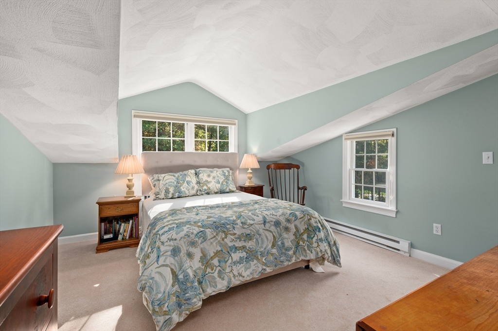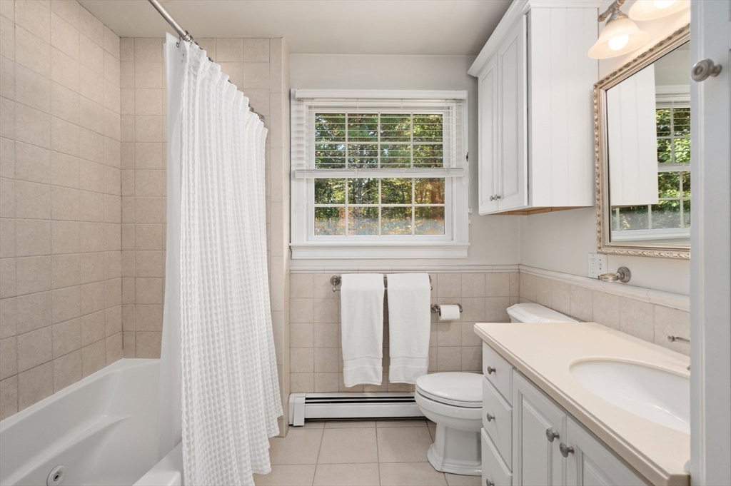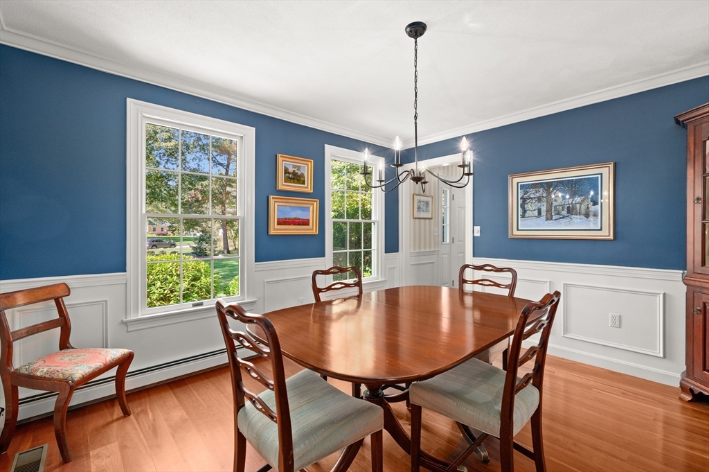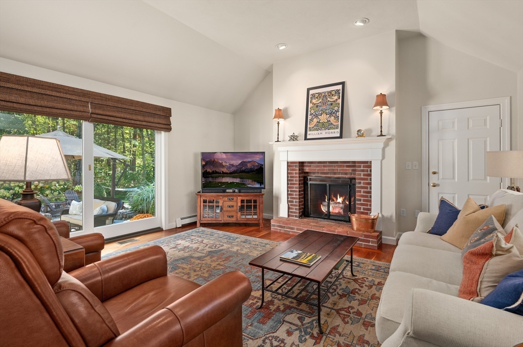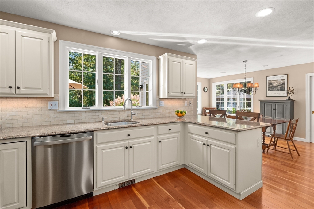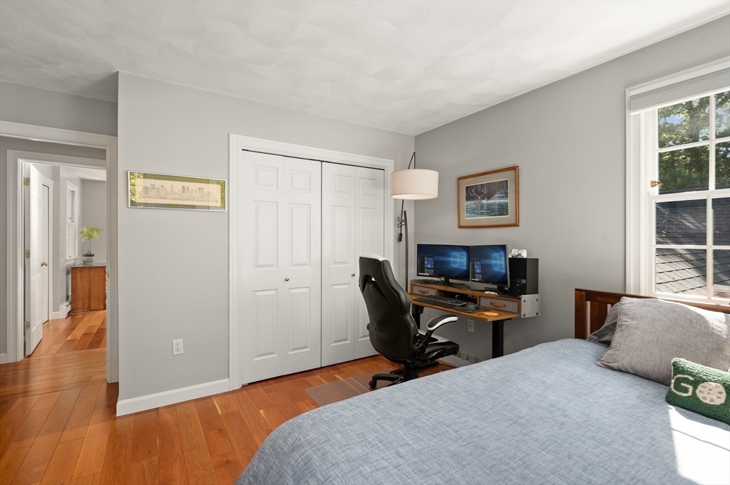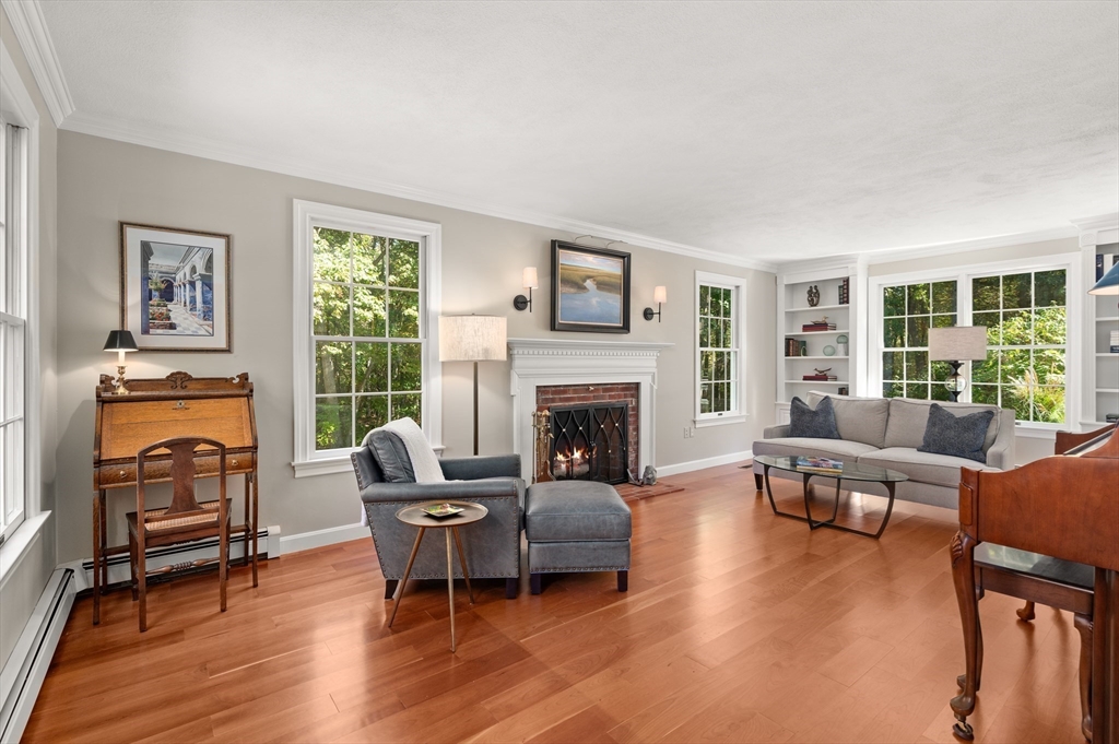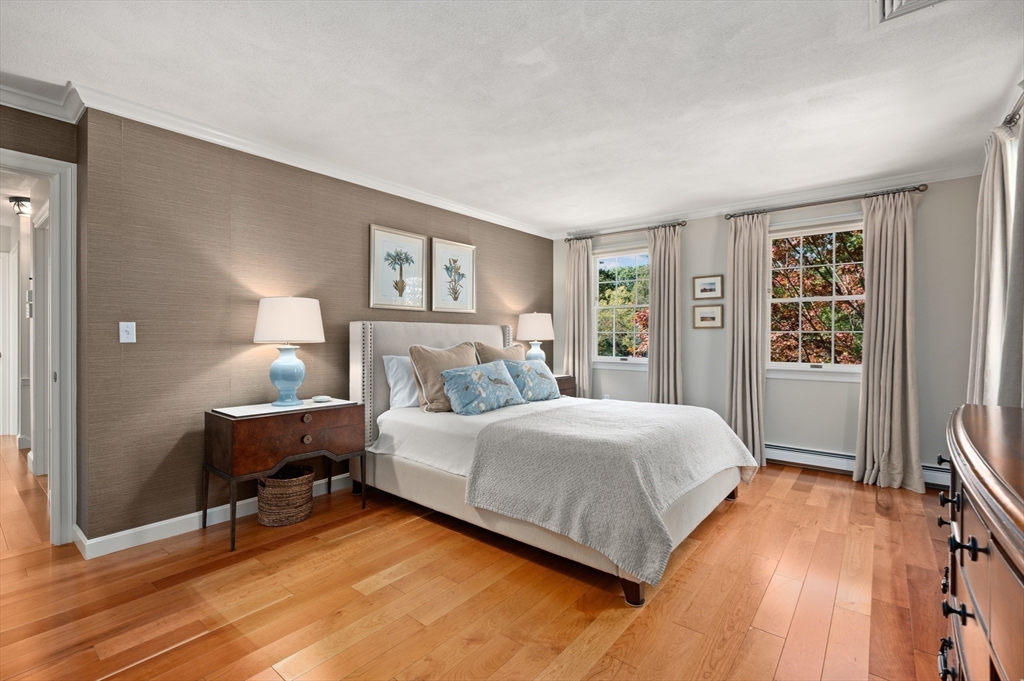 A rare offering in Castle Estates! This meticulously maintained center-entrance Colonial has been proudly cared for by its original owners. With over 3,400 sq. ft. of living space, this home offers 4 bedrooms plus a private au pair/guest bedroom and 3.5 baths. The sun-filled, oversize eat-in kitchen opens to a cathedral-ceiling family room with fireplace and views of the professionally landscaped private backyard. Formal dining room and living room with custom built-ins and 2nd fireplace. Cherry hardwood throughout first and second floors. Upstairs has 4 spacious bedrooms including a serene primary suite, a 2nd floor study and more of those beautiful cherry floors! The lower level adds versatility with a full bath, recreation room, and additional office. Timeless design, modern functionality, and exceptional care in one of North Reading’s most sought-after neighborhoods. Newer roof, boiler, HVAC and stainless appliances! A true gem!