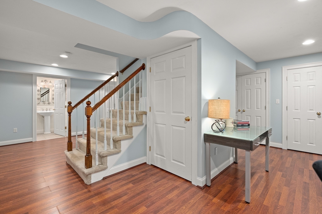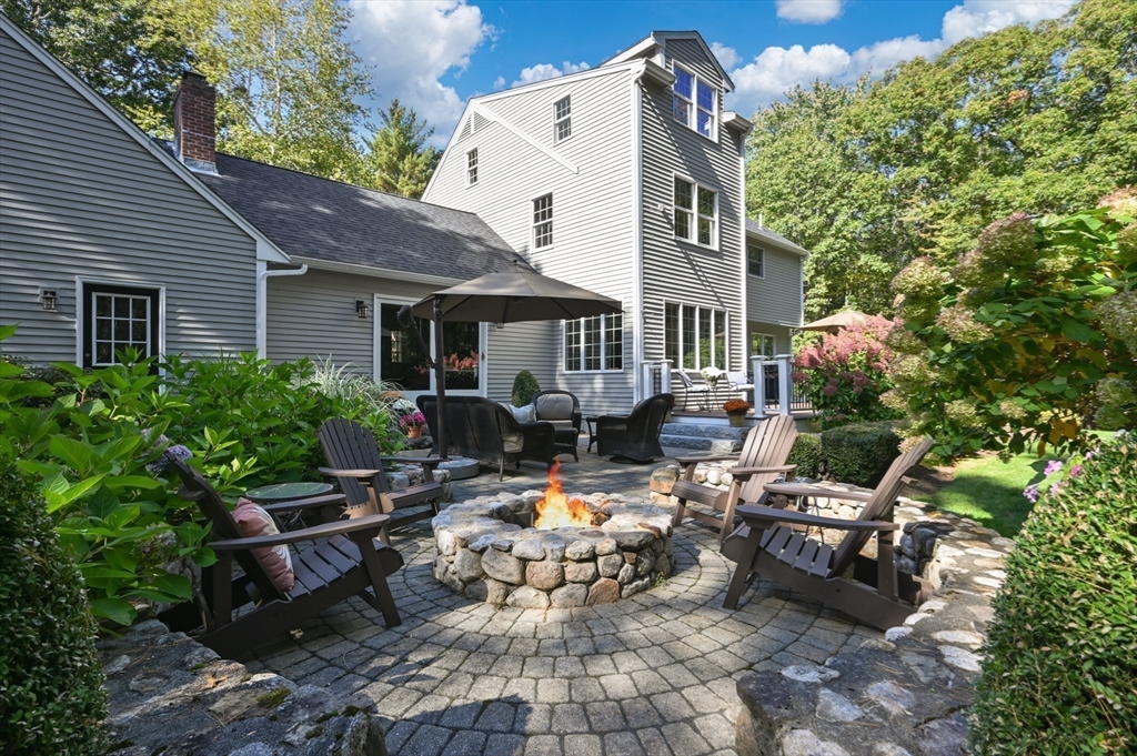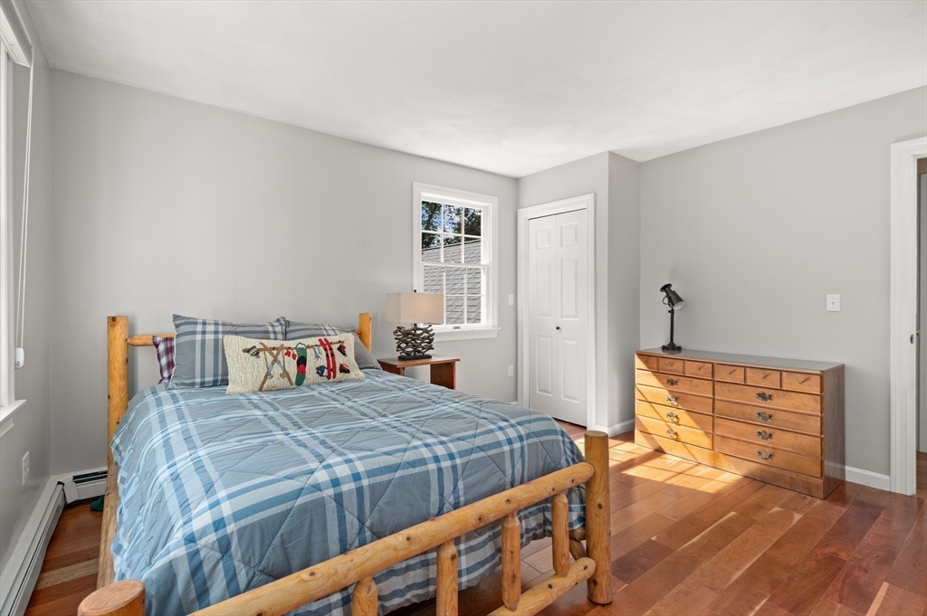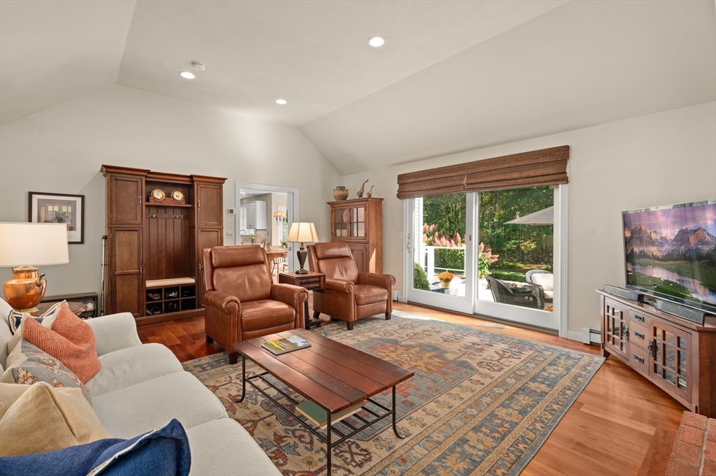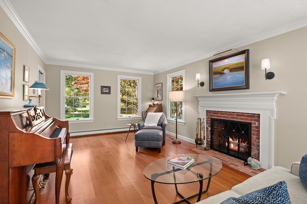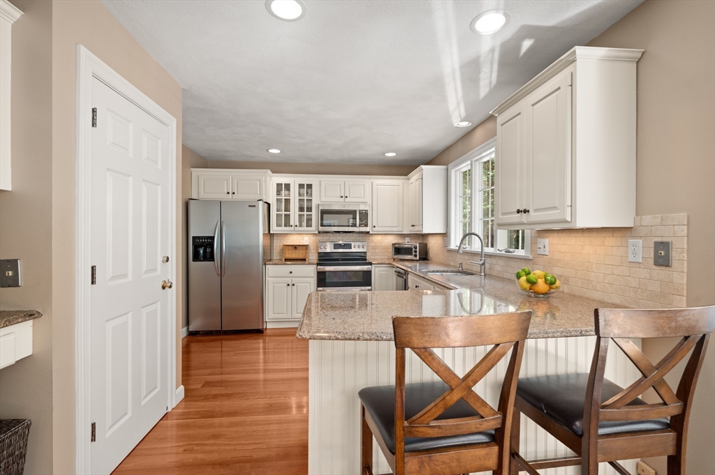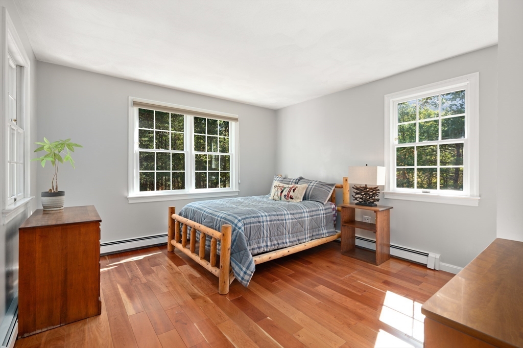 A rare offering in Castle Estates! This meticulously maintained center-entrance Colonial has been proudly cared for by its original owners. With over 3,400 sq. ft. of living space, this home offers 4 bedrooms plus a private au pair/guest bedroom and 3.5 baths. The sun-filled, oversize eat-in kitchen opens to a cathedral-ceiling family room with fireplace and views of the professionally landscaped private backyard. Formal dining room and living room with custom built-ins and 2nd fireplace. Cherry hardwood throughout first and second floors. Upstairs has 4 spacious bedrooms including a serene primary suite, a 2nd floor study and more of those beautiful cherry floors! The lower level adds versatility with a full bath, recreation room, and additional office. Timeless design, modern functionality, and exceptional care in one of North Reading’s most sought-after neighborhoods. Newer roof, boiler, HVAC and stainless appliances! A true gem!