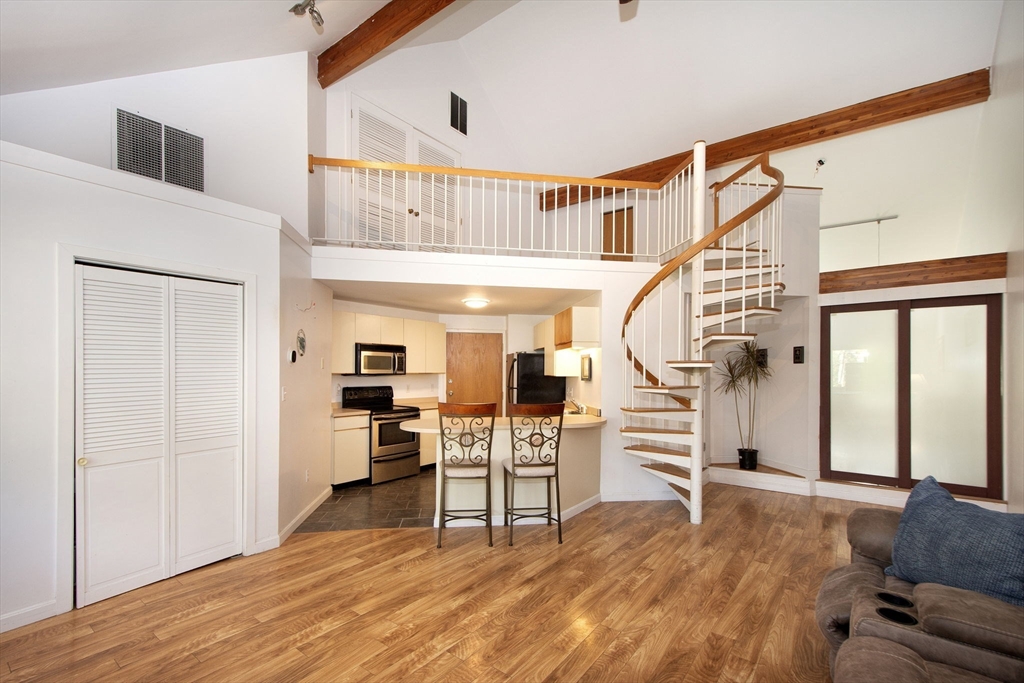 Welcome to this stunning top-floor corner unit — a rare find in one of the area’s most highly sought-after, 100% owner-occupied condo communities! Step inside and experience soaring vaulted ceilings and an abundance of natural light that fills the spacious, open-concept layout. The inviting lofted second floor offers the perfect flex space for a home office, guest room, or cozy retreat. Enjoy low condo fees in a beautifully maintained complex just minutes from Boston, with easy access to public transportation, shopping, dining, and all local amenities. This condo also includes in-unit laundry, walk-in closet, two deeded parking spaces, ample visitor parking, and your own large, secure storage area in the basement...a true luxury for condo living. Perfect for commuters and professionals alike, this home blends comfort, convenience and value in one exceptional package. Units in this complex rarely become available. Don’t miss your opportunity to make this one yours!