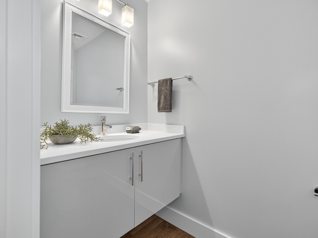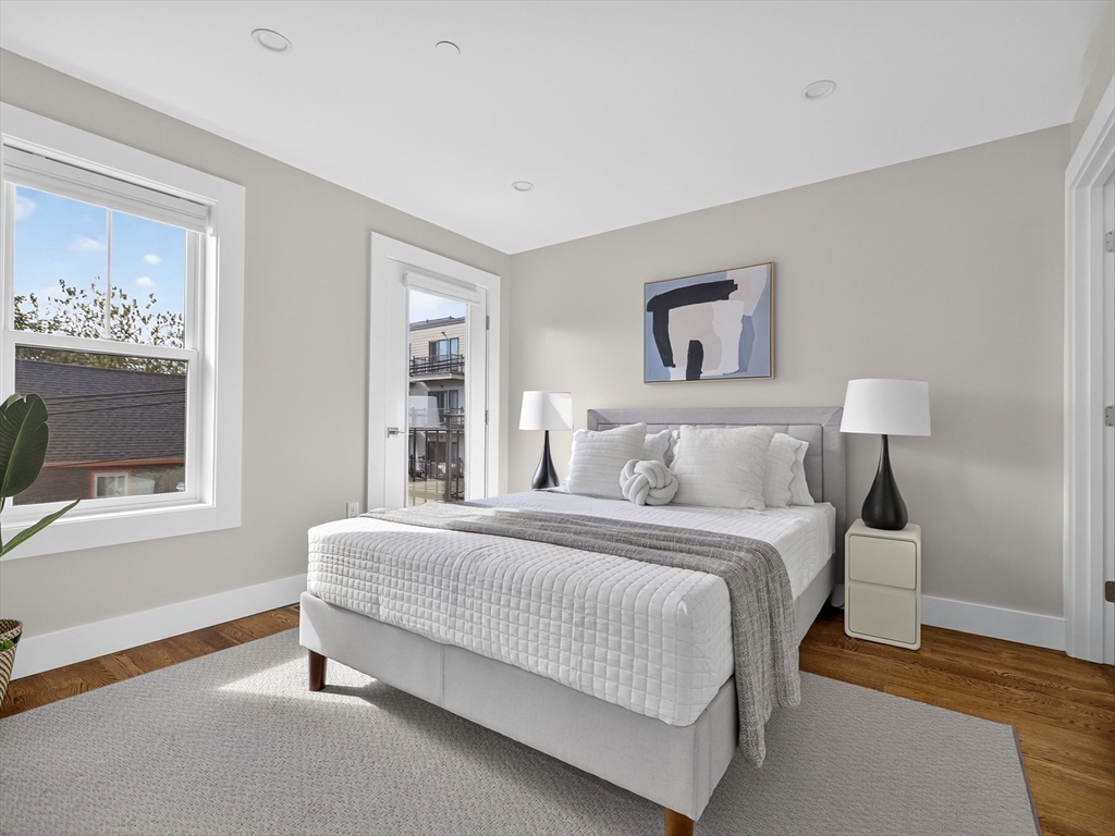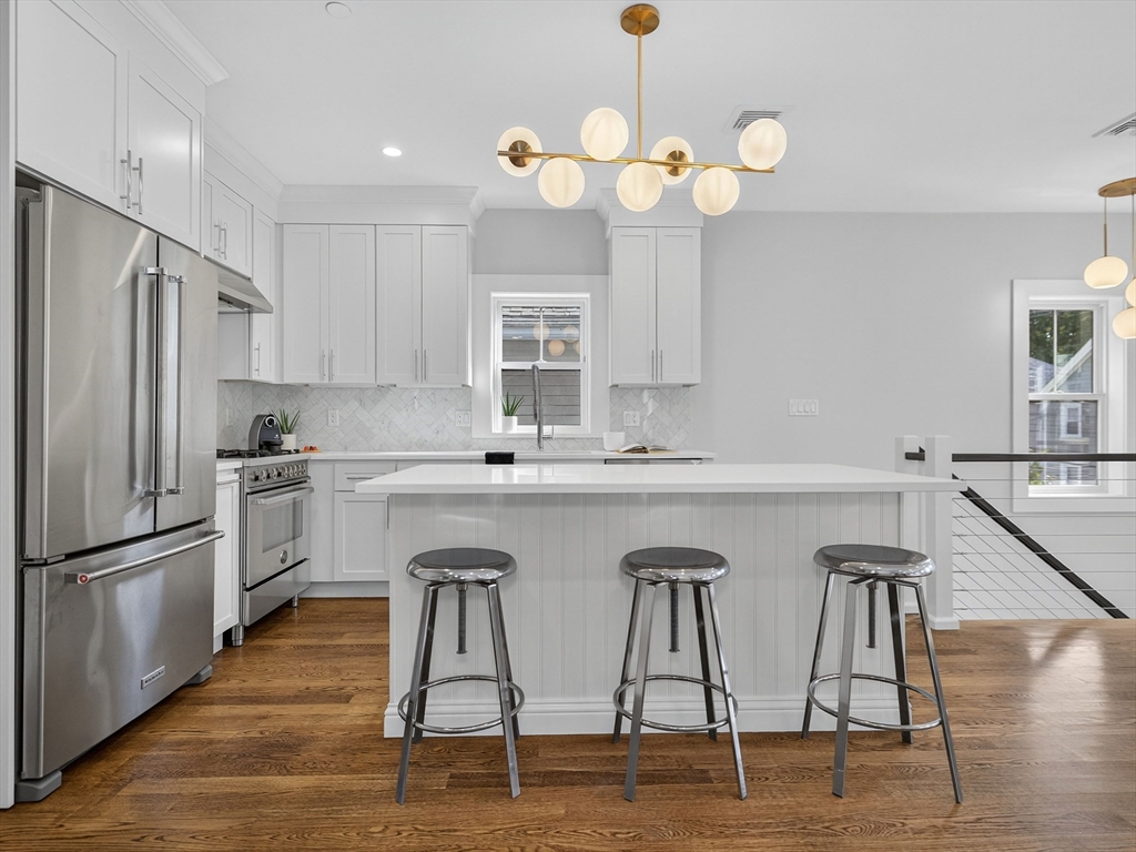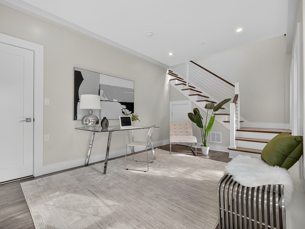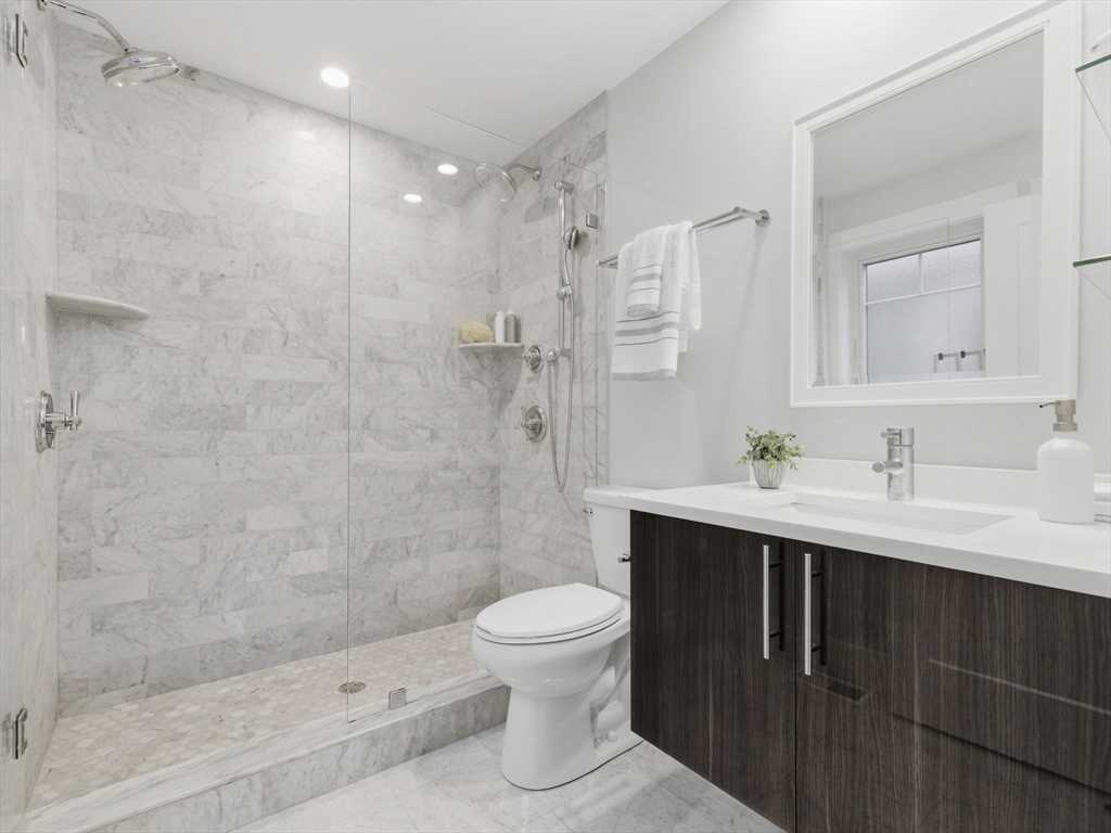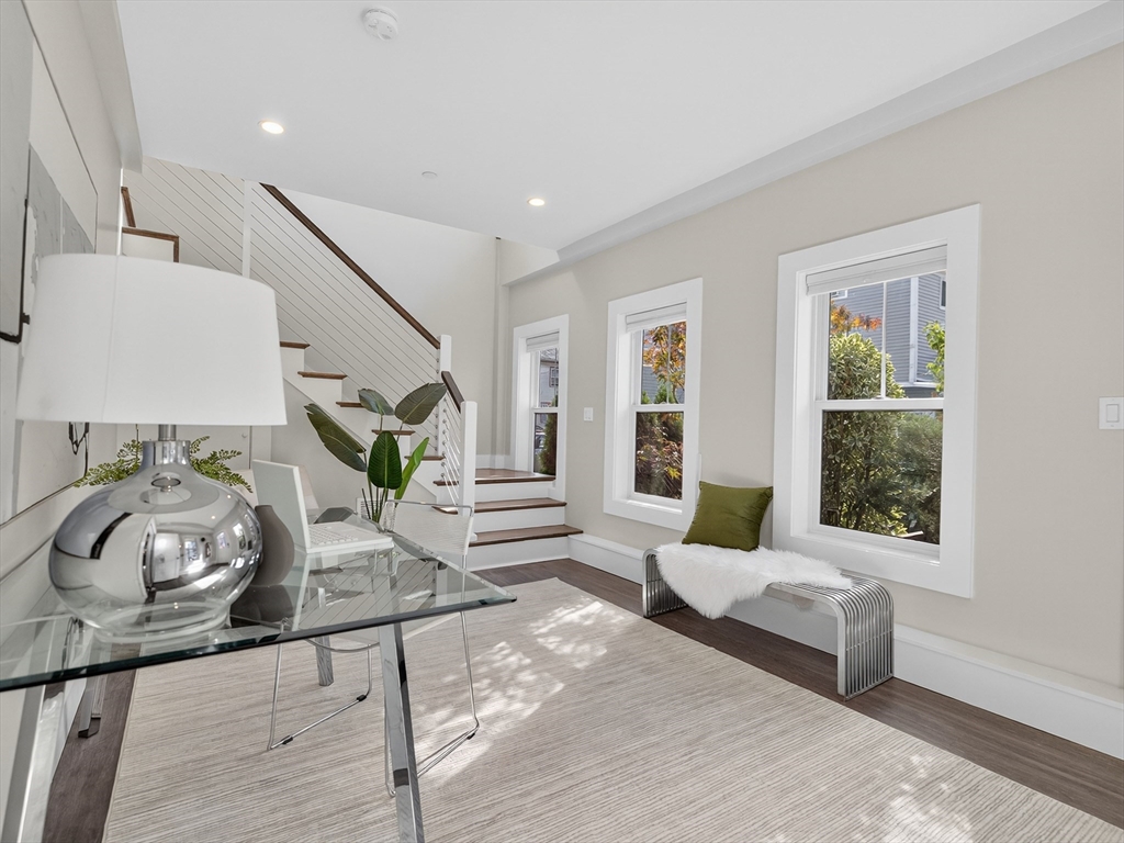 Light pours into this stunning front-facing townhouse-style condo, where contemporary design meets effortless living. The open floor plan is anchored by a sleek gas fireplace with herringbone tile surround and framed by a wall of oversized windows that fill the space with natural light. A designer kitchen shines with West Elm lighting, marble backsplash, and a spacious island ideal for casual dining or entertaining. Upstairs, the serene primary suite features a spa-like bath with dual rain showers, while two additional bedrooms offer flexibility for guests or creative spaces. A private walk-up roof deck offers a sun-soaked retreat with treetop views, ideal for relaxing or gathering with friends. The versatile first-floor flex room—perfect as an office, gym, or mudroom—adds convenience and function. With garage parking, Elfa closet systems, an EV charger, and a location near JP’s vibrant shops, green spaces, and Orange Line T, this home embodies elevated city living with a modern edge.