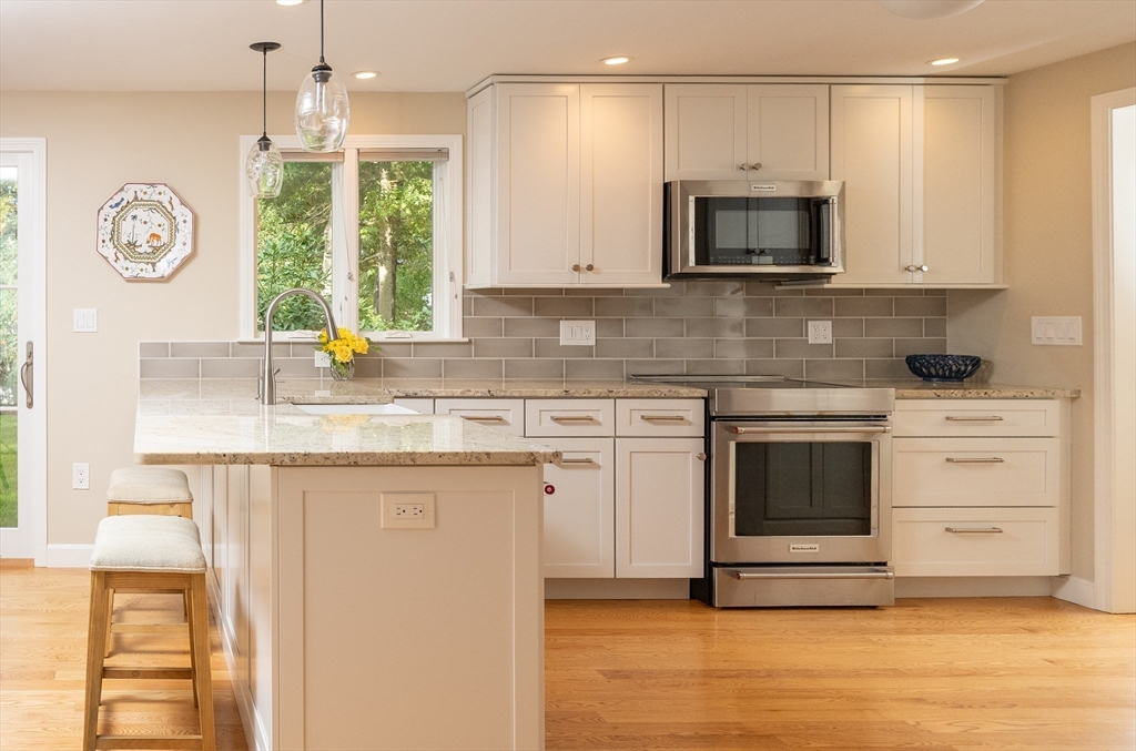 An exceptional younger Cape-style home located in a desirable Natick neighborhood with nearby schools and shopping. This impeccably maintained home features a thoughtfully remodeled open floor plan with premium finishes throughout. Enter through the cathedral ceiling mudroom with glass sliders to the patio and direct access to an oversized garage. The kitchen includes white shaker cabinets, granite counters, stainless steel appliances and counter seating. The living room features a modern floor-to-ceiling fireplace and large picture window. Triple glass sliders in the dining room lead to a beautifully landscaped backyard with mature trees, perennial gardens and a large patio. A bedroom and bathroom with a glass enclosed shower round out the first floor. Upstairs includes two generously sized bedrooms and a full bath. The newly remodeled heated basement with luxury vinyl plank floors is perfect for a home office, family/playroom or gym. A move-in ready gem!