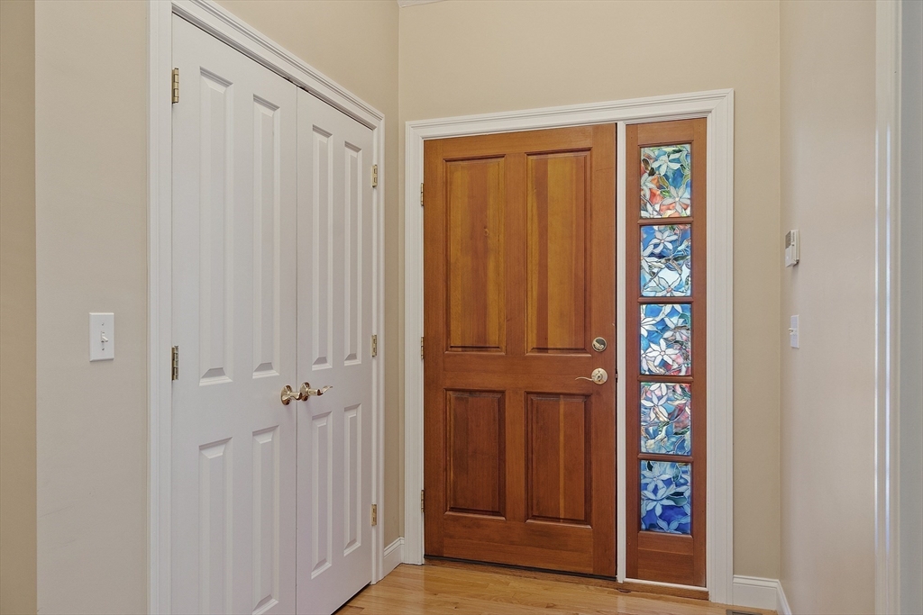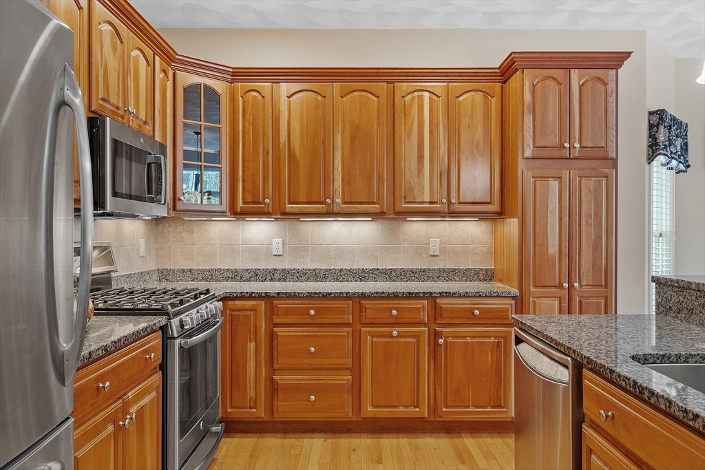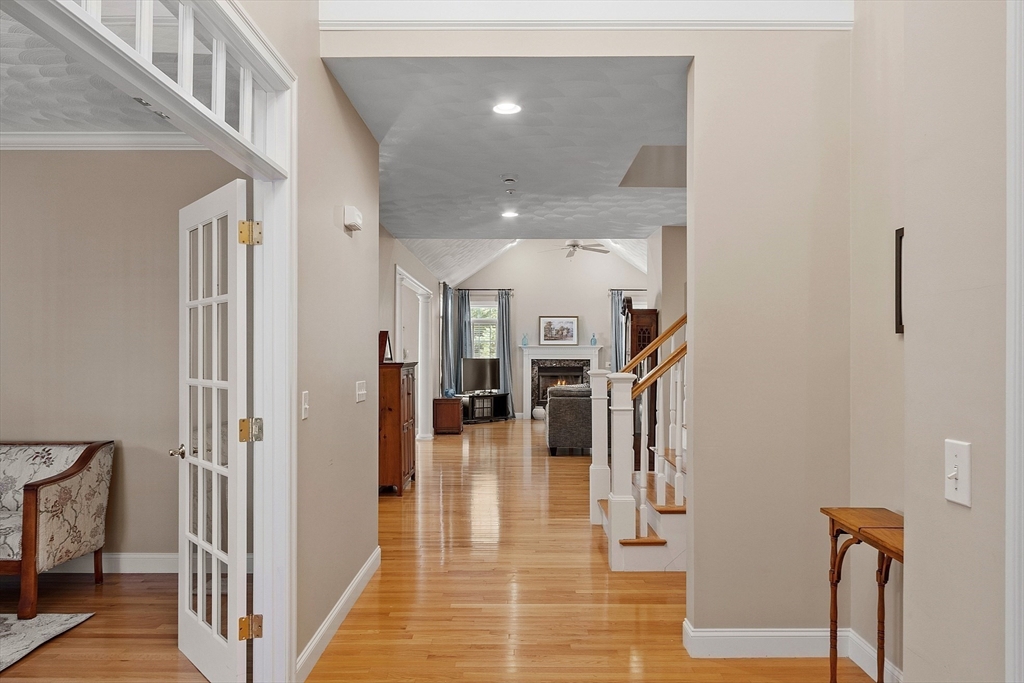 Welcome to Meetinghouse Commons, a desirable 55+ community of 85 single-family homes set on 32 scenic acres of orchards, trees, and walking paths. This charming neighborhood combines country tranquility with modern convenience.. The inviting front porch is perfect for morning coffee, while the back deck overlooks peaceful woods. Inside, the open floor plan connects the kitchen, dining, and living areas. The kitchen features hardwood floors, granite countertops, a breakfast bar, and GE Profile stainless-steel appliances including a 5-burner range. Handicap Access Features—The main bedroom includes a newly remodeled bath with a tiled, wheelchair-accessible walk-in shower. A first-floor laundry with storage. And a wheelchair lift to the garage for comfort and convenience. Across the street, Smolak Farm offers hayrides, apple or pumpkin picking and homemade donuts. Enjoy easy living, natural beauty, and a welcoming community — the perfect blend of comfort and country charm.