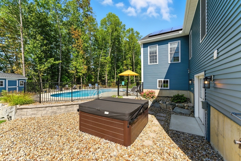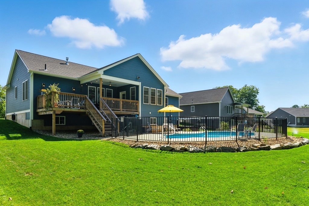 Welcome to this exceptional 2023 custom built ranch, where high-end finishes, energy efficiency, & thoughtful design come together in perfect harmony. Offering an open floor plan & tons of upgrades. Enjoy single-level living w/9-ft ceilings throughout & a vaulted ceiling family rm w/fireplace. The custom chef’s kitchen is the heart of the home and flows effortlessly into the dining area & the sunroom, which leads to a partially covered deck. The luxurious primary suite features a walk-in closet and a spa-like bath w/double vanity, walk-in tiled shower, & heated tile floors. The finished walk-out bsmnt adds endless possibilities — game nights, hobbies, or entertaining — plus a convenient 1/2 bath, workshop/storage area & direct access to your backyard oasis. Outside, unwind in your heated inground pool, soak in the hot tub, or enjoy a fire. Eco-conscious buyers will love the OWNED solar panels, a hybrid heating sys (heat pumps+propane), & an EV charging station to keep energy costs low!