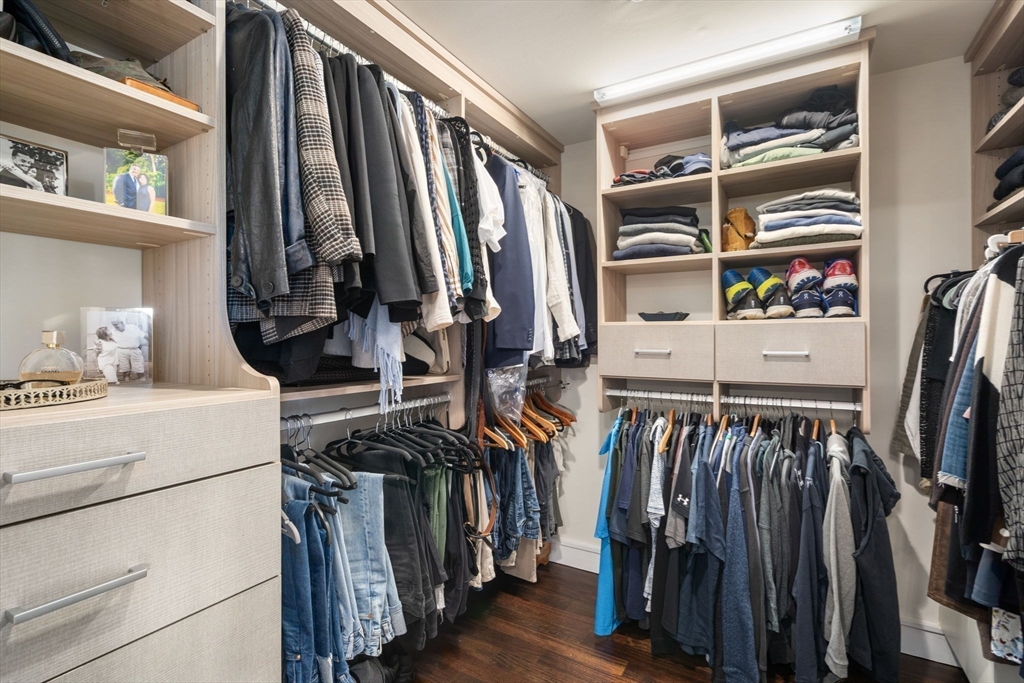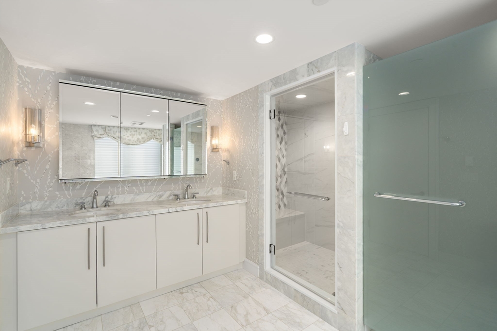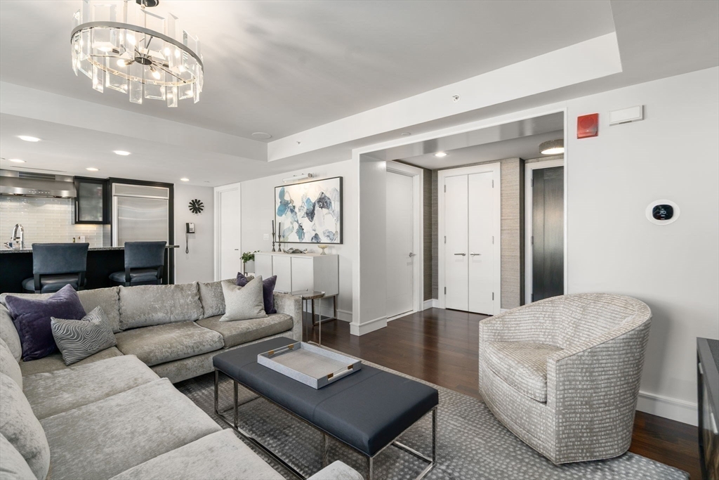 Welcome to Residence 4602 at Battery Wharf - Full-service luxury living on Boston's waterfront. This designer corner penthouse spans 1,486sqft with 2 bedrooms, 2 bathrooms, refinished hardwood floors, ample storage, private balcony and 1 valet garage parking space. Upon entering the inviting foyer, the open-concept layout is highlighted by sleek finishes and gracious windows. Ideal for entertaining, the living room and adjacent dining area opens to the gourmet kitchen with granite counters and breakfast bar. A large pantry and laundry room provides storage and a work space. The corner primary suite is a retreat with a California walk-in closet and spacious marble bath with newly installed steam shower, soaking tub, and dual vanities. The second bedroom offers 2 closets and is serviced by a 2nd full bath with glass shower and Robern marble vanity. A dedicated office area leads to the private balcony with views. Premium amenities include concierge, hotel services/dining, Gym & Exhale Spa