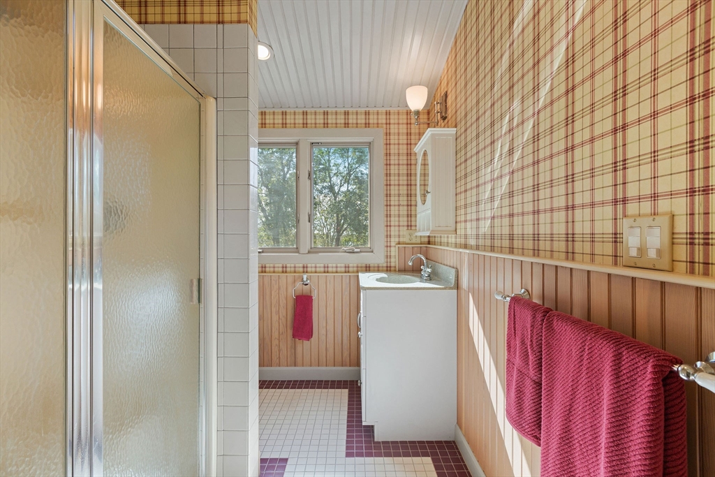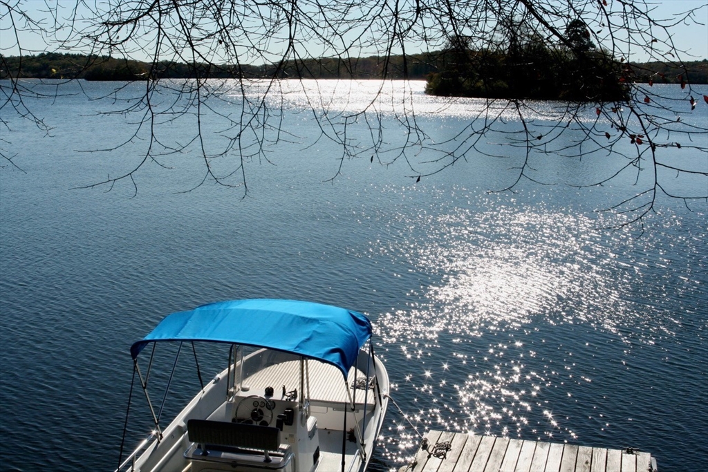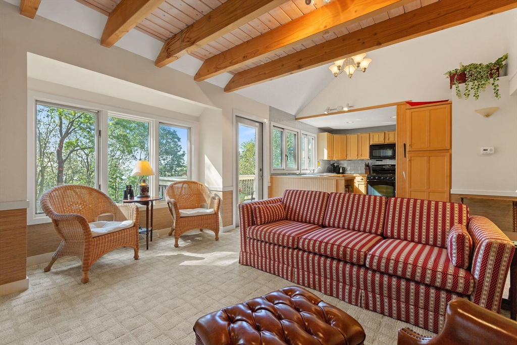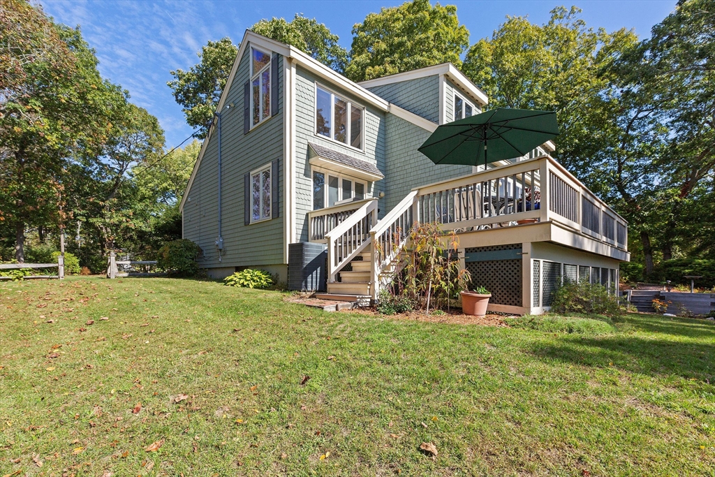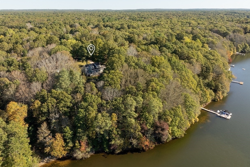 Nestled on 2.1 private acres with 225 feet of frontage on picturesque Mashpee-Wakeby Lake with private dock, this distinctive mini-estate offers the ideal year-round residence or serene getaway. The 3BR, 2BA, 2,364 sq ft home sits elevated above the water, offering sunrise and sunset views from every room. Enjoy two expansive decks with Azek decking, a sunroom, and a finished walkout level with a second kitchen and laundry. The living room boasts a beamed ceiling and wood stove, while the family/library room features custom built-ins. The detached 2.5-car garage is insulated and includes a workshop. A 420 sq ft finished studio with skylights and propane heat offers space for work or leisure. Additional features include a garden shed with power, central A/C, propane heat, new electrical, deep well, and a 2023 Title V septic. Perennial gardens and a woodland path lead to a private deck and seasonal dock—perfect for boating, fishing, and swimming on one of the Cape's most coveted lakes.