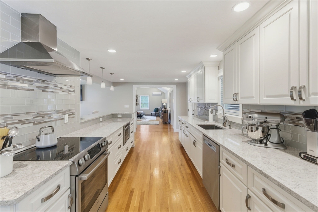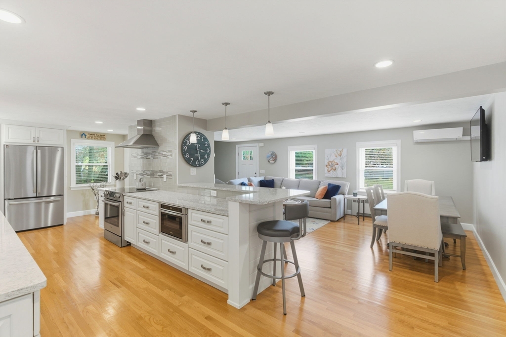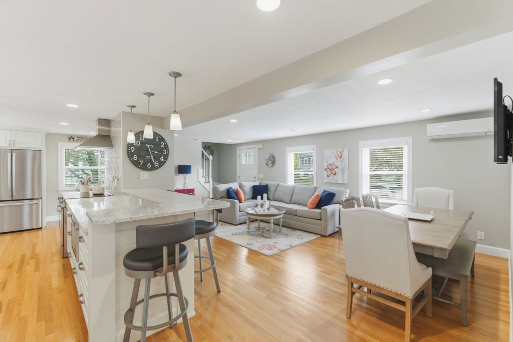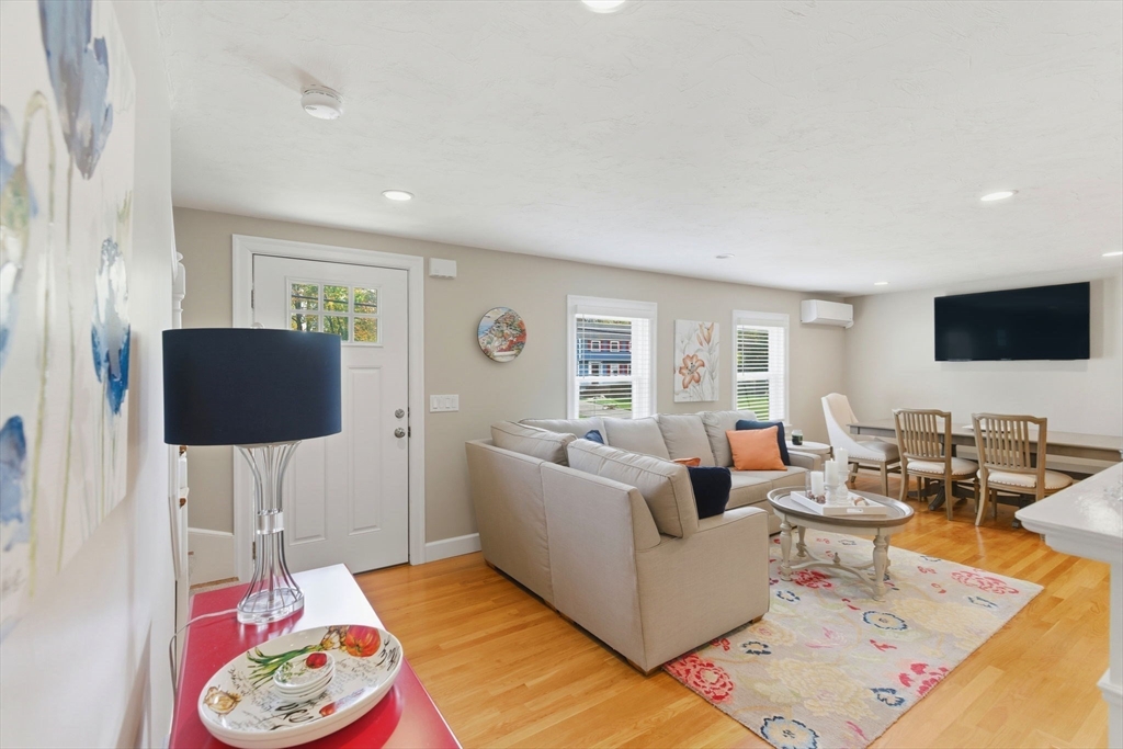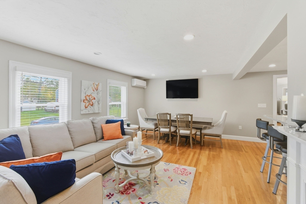 Welcome home to this beautifully renovated and meticulously maintained gem! Step onto the welcoming farmer's porch and enter through the mudroom into a spacious family room featuring a tray ceiling and gleaming hardwood floors. The first-floor bedroom offers privacy and convenience with direct access to a stunning main bath complete with a Jacuzzi tub, separate shower, and laundry. The gourmet kitchen is a chef’s dream, showcasing high-end Bosch appliances, sleek quartz countertops, stylish pendant lighting, and dining area—perfect for entertaining. Enjoy the inviting living room with its elegant fireplace. Upstairs, you'll find three generously sized bedrooms and a fully updated bath. The finished basement adds versatile living space. Stay comfortable year-round with energy-efficient mini splits, and step outside to unwind on the deck under the retractable, motorized awning with remote control. Additional highlights include a built-in 2 car garage and countless modern updates!