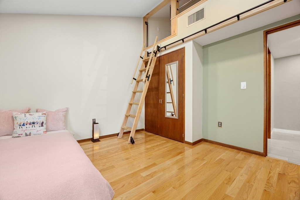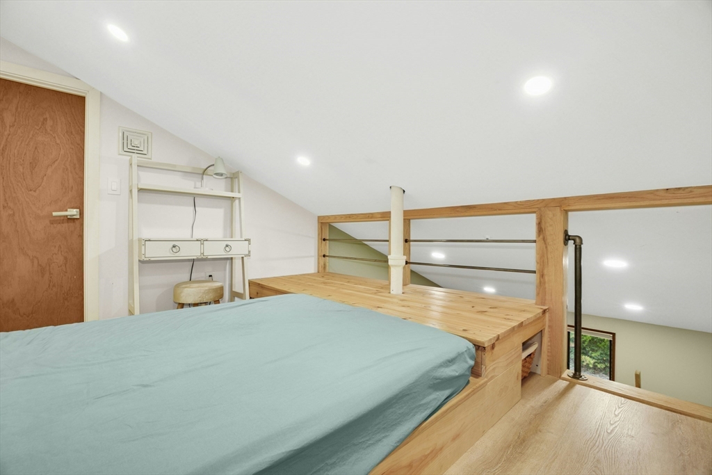 Immaculate and highly desirable large corner unit featuring an open floor plan, dramatic wall of glass, and an amazing sleep-in loft with recessed lights and study area in one of the bedrooms! Enjoy extensive updates inside and out, including a new roof (2025), fresh interior paint (2025), and repainted front and back porches (2025). Stylish recessed lighting throughout plus new basement lighting (2024) add modern flair. The kitchen boasts a quartz island, resurfaced cabinets, tile backsplash, and new hood. The primary bath was fully renovated (2020) and additional baths were updated as well. Highlights include new hardwood floors, a custom hardwood staircase with sleek railing, and tiled entryway. The upstairs bedroom features rebuilt closets, added linen storage, and a loft with sliding library stairs (2023). New water heater (2022) and A/C motor (2019). Move-in-ready gem overlooking lush lawns + all the amenities of the Village of Nagog Woods.See remarks! OH 10/12 1-2:30PM