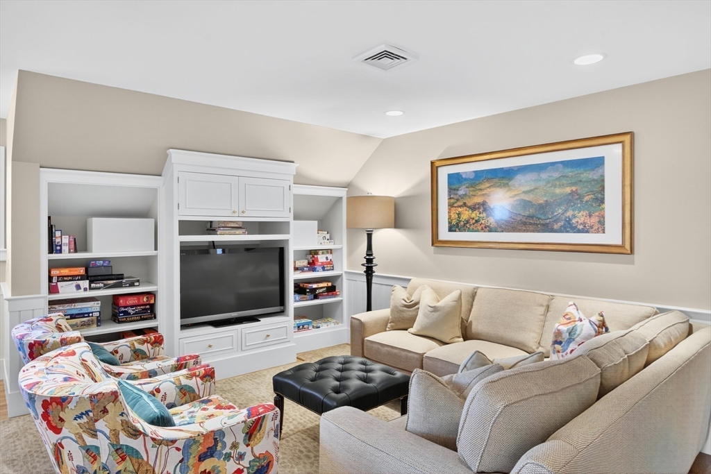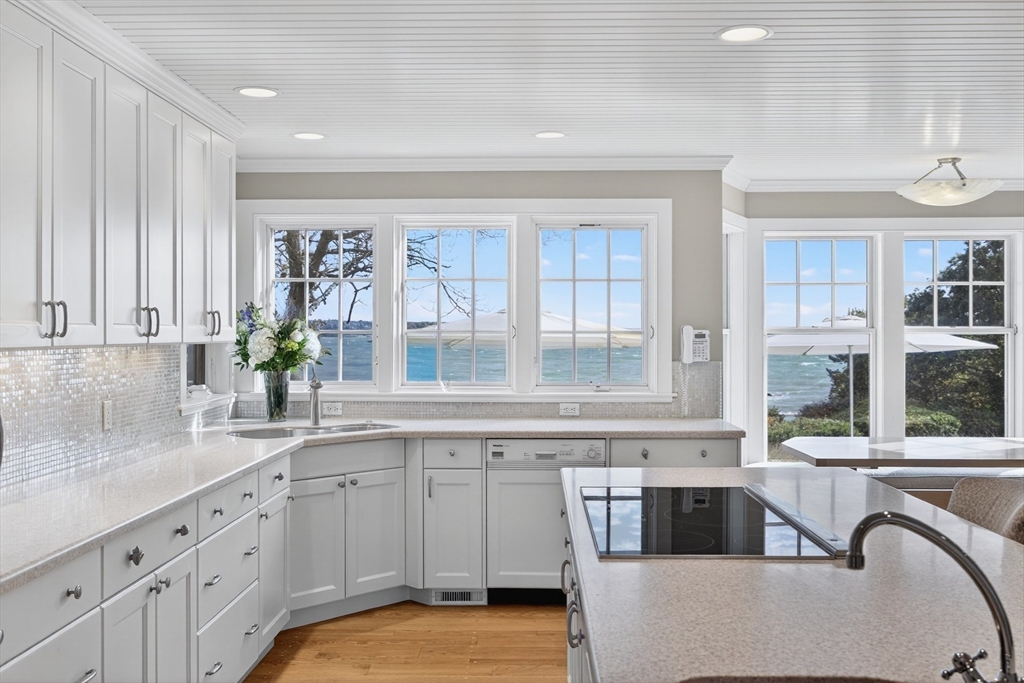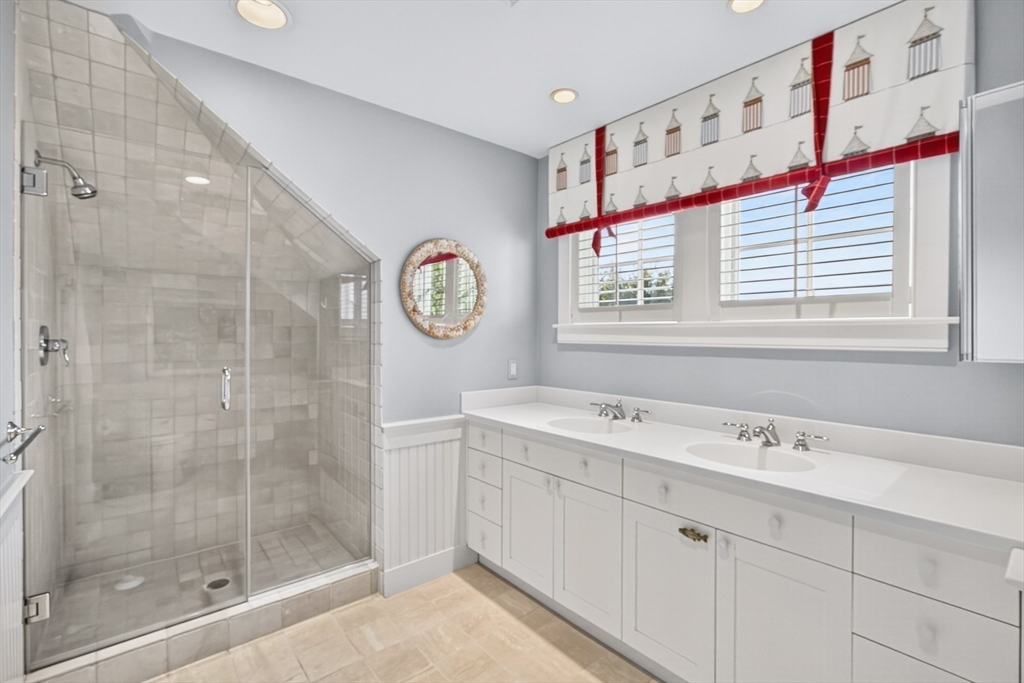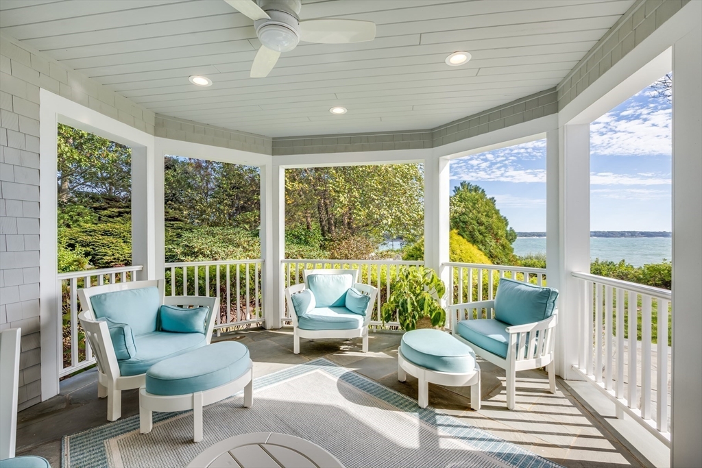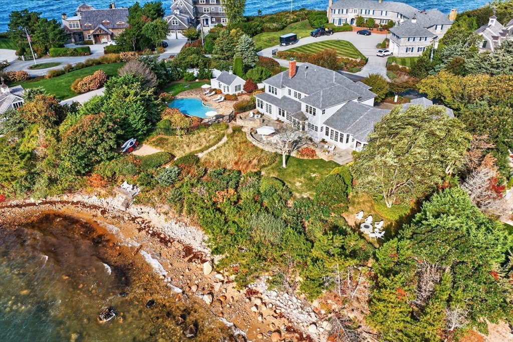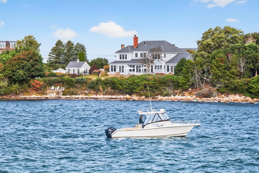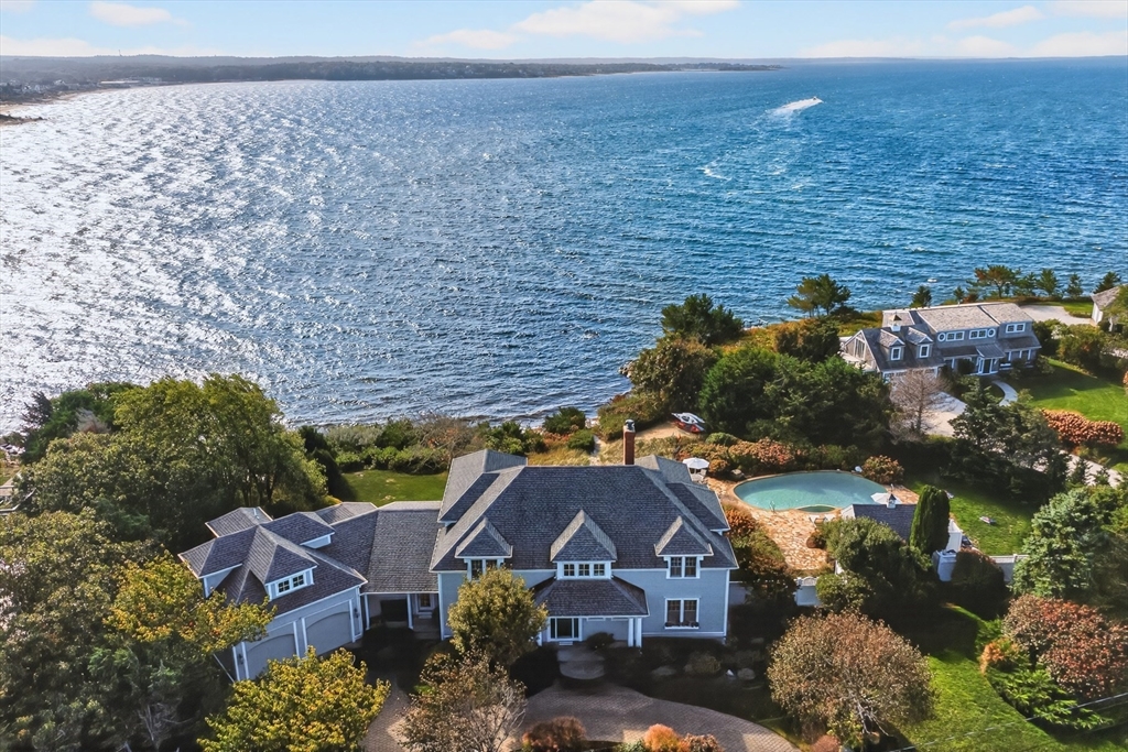 At the tip of a private peninsula, this exceptional Cape Cod estate embodies the essence of elegant coastal living. Set on 1.07 acres with sweeping views of Buzzards Bay, the residence combines timeless architecture, refined craftsmanship, and every amenity for a luxurious seaside lifestyle.Built by renowned Osterville builder Polhemus Savery, the home offers five en suite bedrooms, including a first-floor primary suite and three additional bedrooms upstairs, plus a separate guest or nanny suite above the garage—ideal for extended stays. A comfortable second-floor family room provides a casual space for gathering.The light-filled, south-facing living areas are designed to capture the beauty of the Bay.