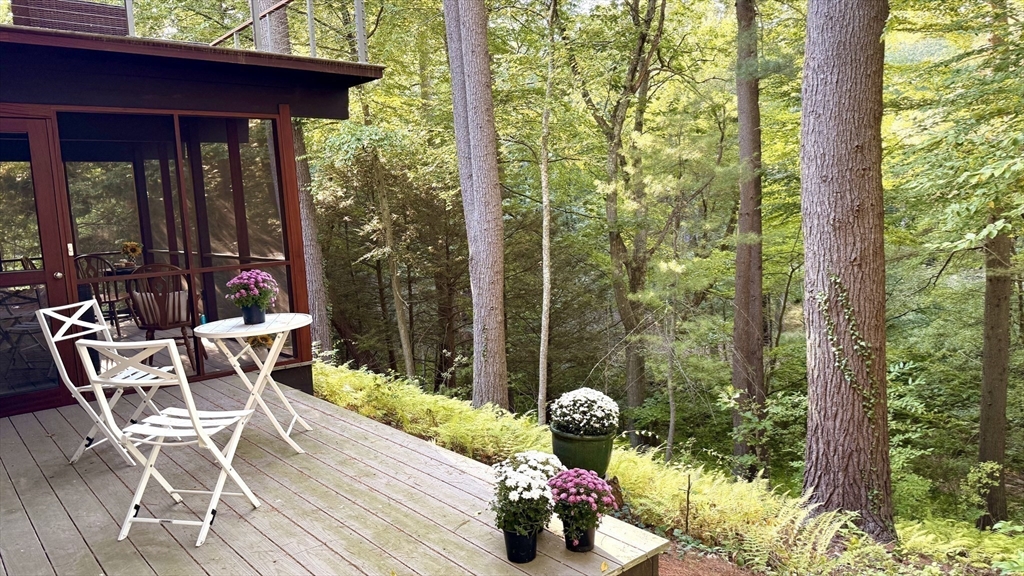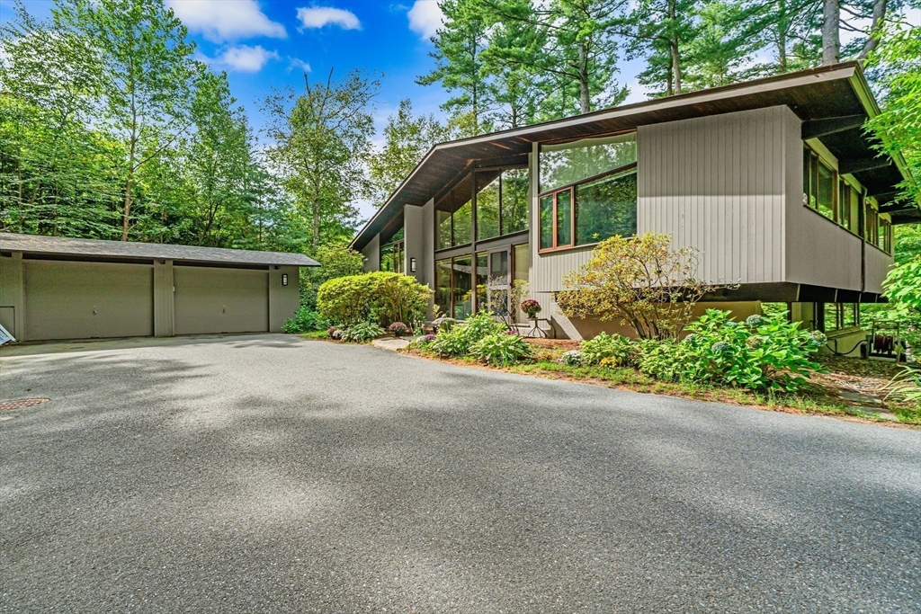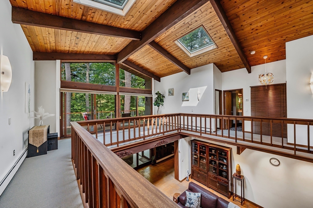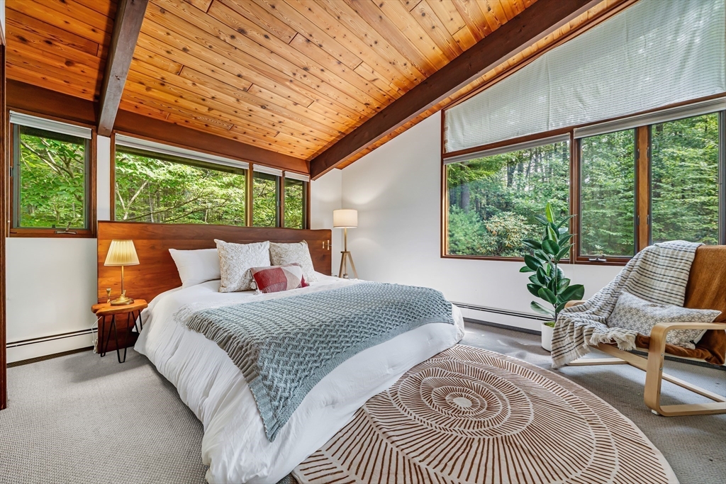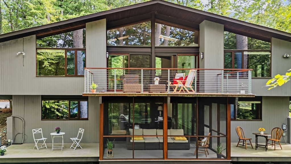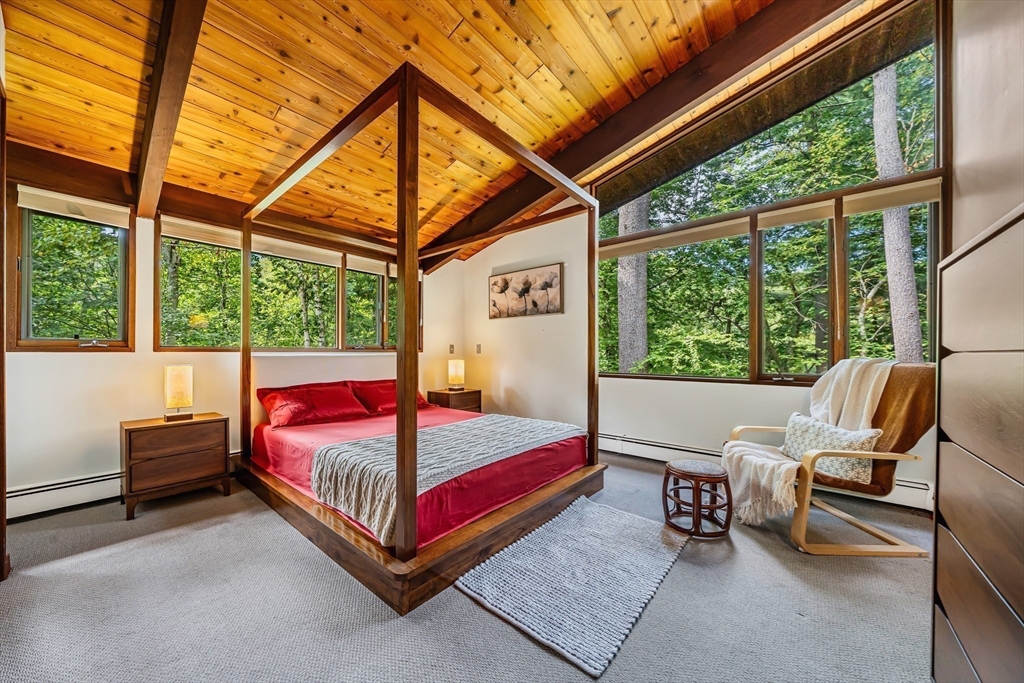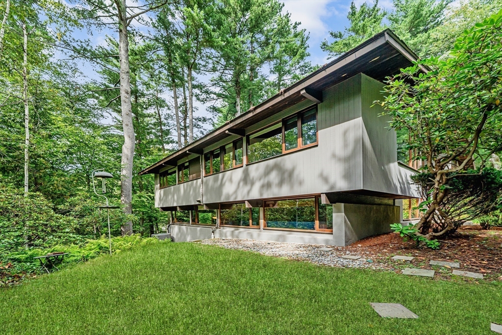 Rare chance to own a custom Acorn Deck House mid century home perfectly located on a quiet cul-de-sac in Concord. With 4 beds and 2.5 baths, this unique home exudes character, combining modern amenities with classic deck house touches including warm wood, large walls of glass, and an open plan. At its heart, a breathtaking two-story fireplace rises above the oversized living room, surrounded by a custom 2nd floor balcony, and set against the stunning two story floor-to-ceiling glass wall and a wood panel and beam cathedral ceiling with skylights. The first features a chef's kitchen, a formal dining for family and friends, a den, a powder and laundry room. The upstairs features four sunlit bedrooms with lovely wood paneled ceilings and two full custom baths. Outdoor living features 2 balconies and a screened porch, all set above an acre of nature. 2 year old roof and newer AC. Minutes walk to Concord Country Club and minutes drive to Concord Center.