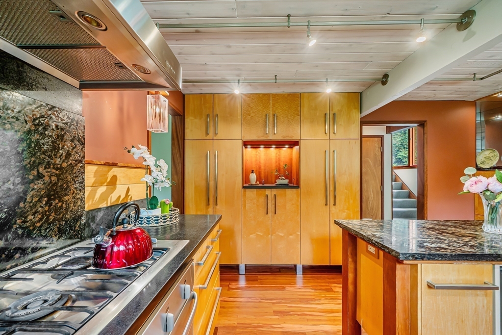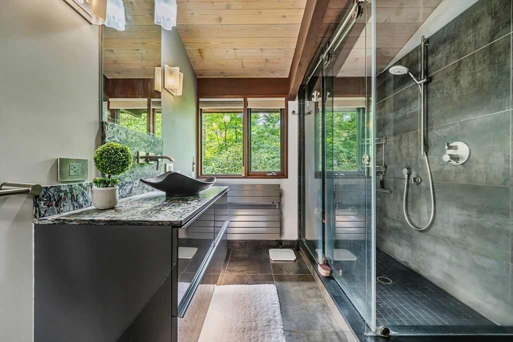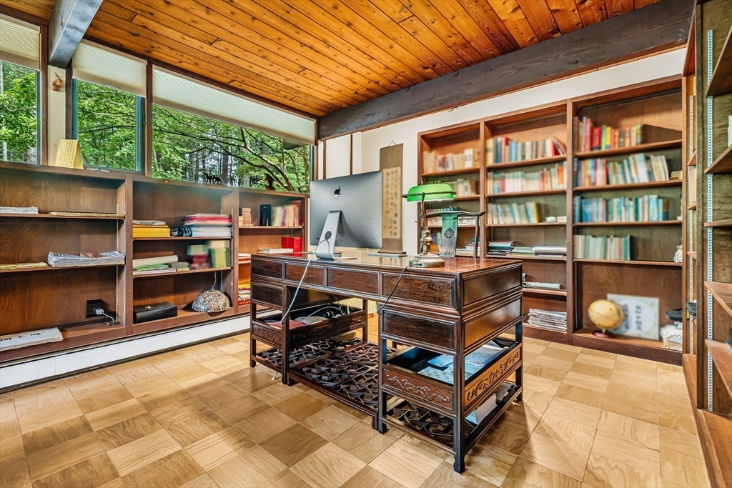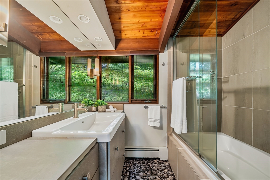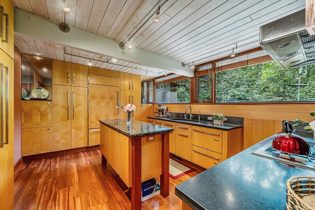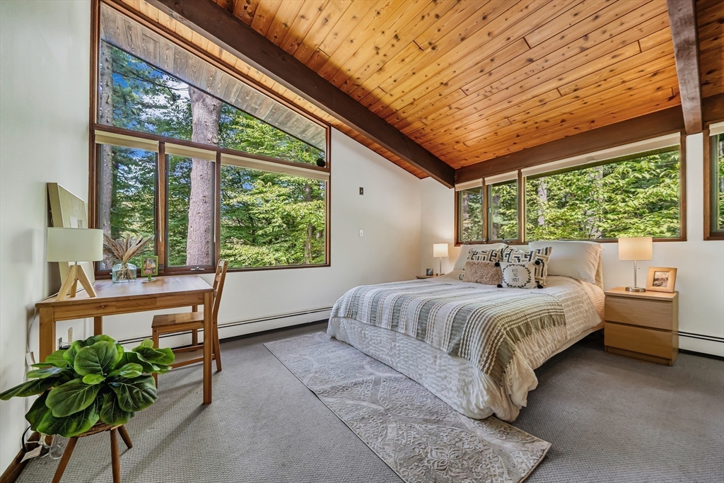 Rare chance to own a custom Acorn Deck House mid century home perfectly located on a quiet cul-de-sac in Concord. With 4 beds and 2.5 baths, this unique home exudes character, combining modern amenities with classic deck house touches including warm wood, large walls of glass, and an open plan. At its heart, a breathtaking two-story fireplace rises above the oversized living room, surrounded by a custom 2nd floor balcony, and set against the stunning two story floor-to-ceiling glass wall and a wood panel and beam cathedral ceiling with skylights. The first features a chef's kitchen, a formal dining for family and friends, a den, a powder and laundry room. The upstairs features four sunlit bedrooms with lovely wood paneled ceilings and two full custom baths. Outdoor living features 2 balconies and a screened porch, all set above an acre of nature. 2 year old roof and newer AC. Minutes walk to Concord Country Club and minutes drive to Concord Center.