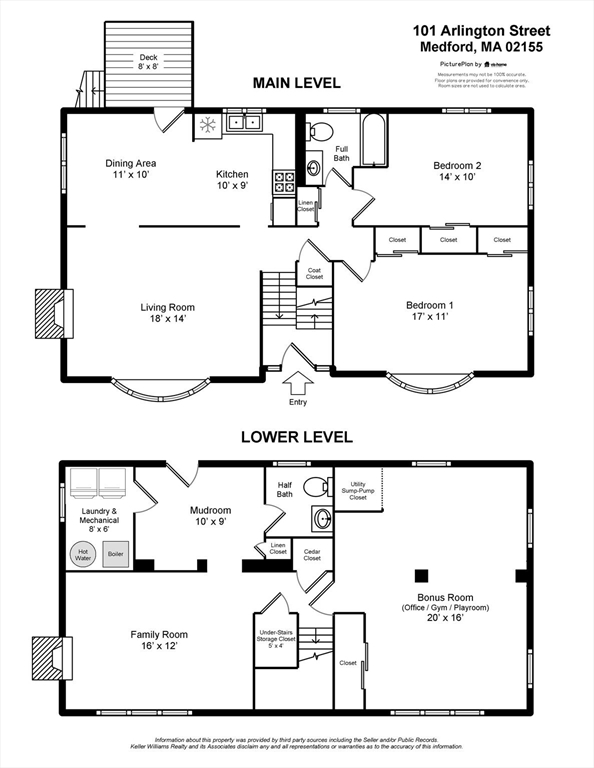 An amazing opportunity for First-Time Homebuyers! This raised ranch, 2-story home rests on a 6,500-SqFt lot, just off Rt.16 over the Mystic River on the Arlington/Somerville line. 50+year family-occupied, well-maintained throughout, and ready for its next chapter. Presently a 2BD/1.5BA home, the upper level offers a spacious front-facing living room with a fireplace and an eat-in kitchen, leading to a rear deck & fence-enclosed yard. Two generous bedrooms with corner windows, a full bath & adjacent closets. Transition to the lower level to find an open living area & fireplace; the former Family Room. A 2nd rear egress leads to the back yard from the mudroom, flanked by the laundry/utility room & half-bath. A semi-finished “bonus room” offers many possibilities, including a home office, gym, studio or playroom. Neighborhood recreational amenities across-the-street, including tennis & basketball courts @ Dugger Park, Amsell Colebrooke Playground & walking trails along the Mystic River.